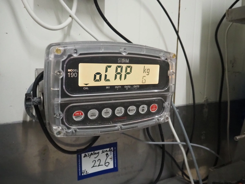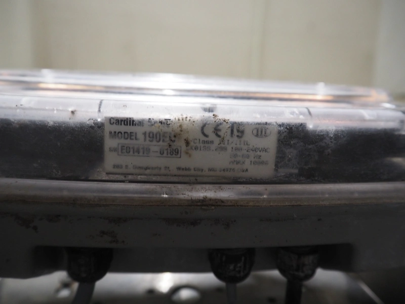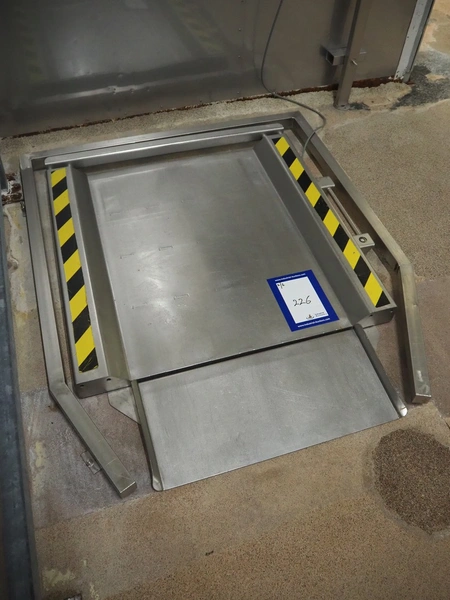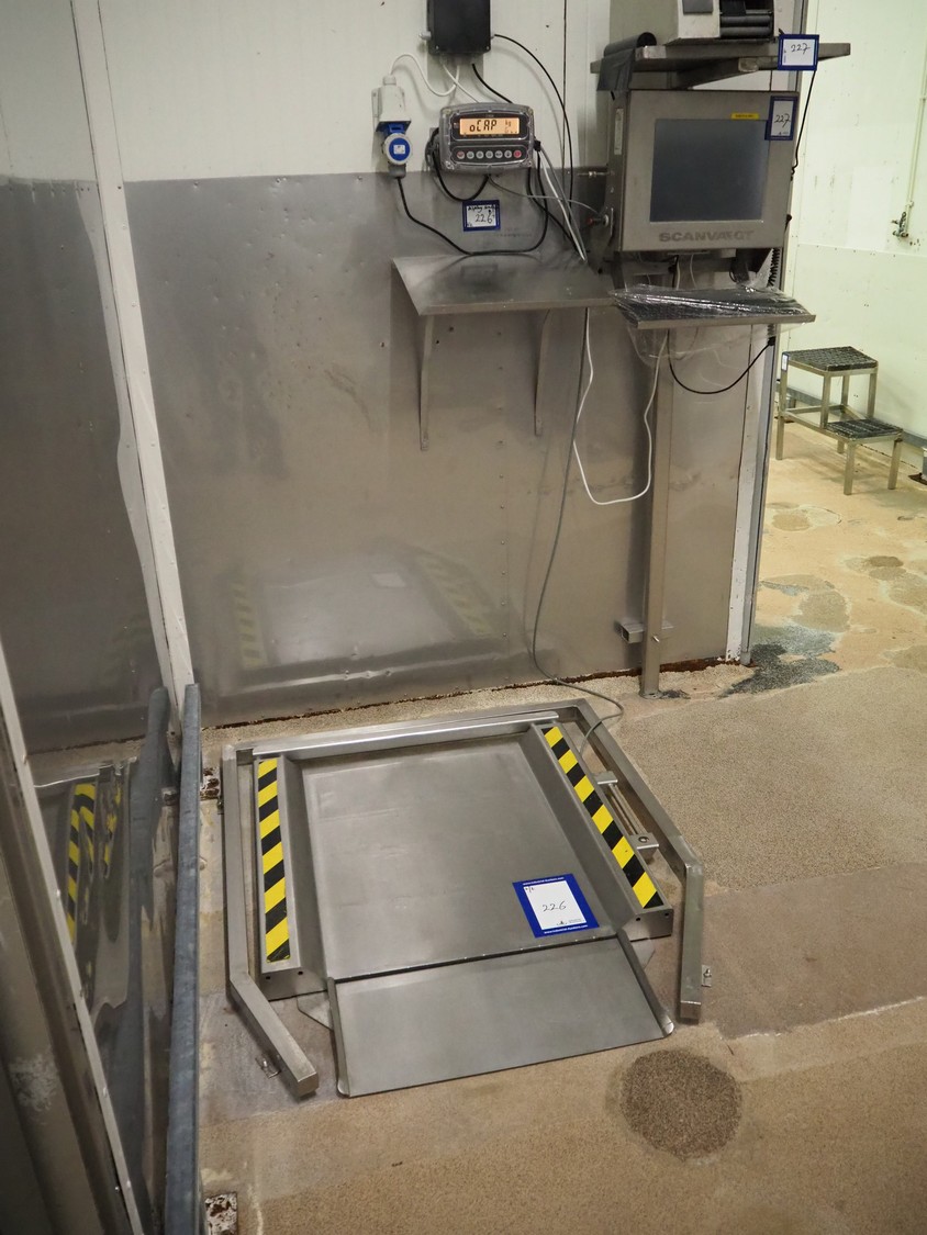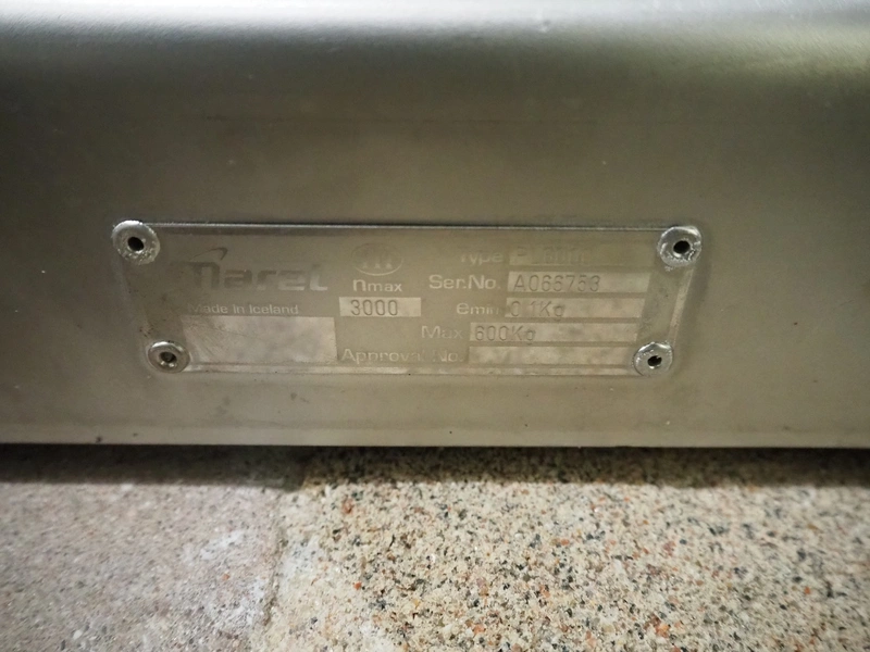 Marel s/s floor weighing scale, type: PL6000, serial number: A066753, maximum weight: 600 kg, min: 0.1 kg, dimensions: 900 mm x 880 mm x 80 mm. Including Cardinal Scale indicator, model: 190EU, serial number: E01419-0189, dimensions indicator: 300 mm x 130 mm x 160 mm.