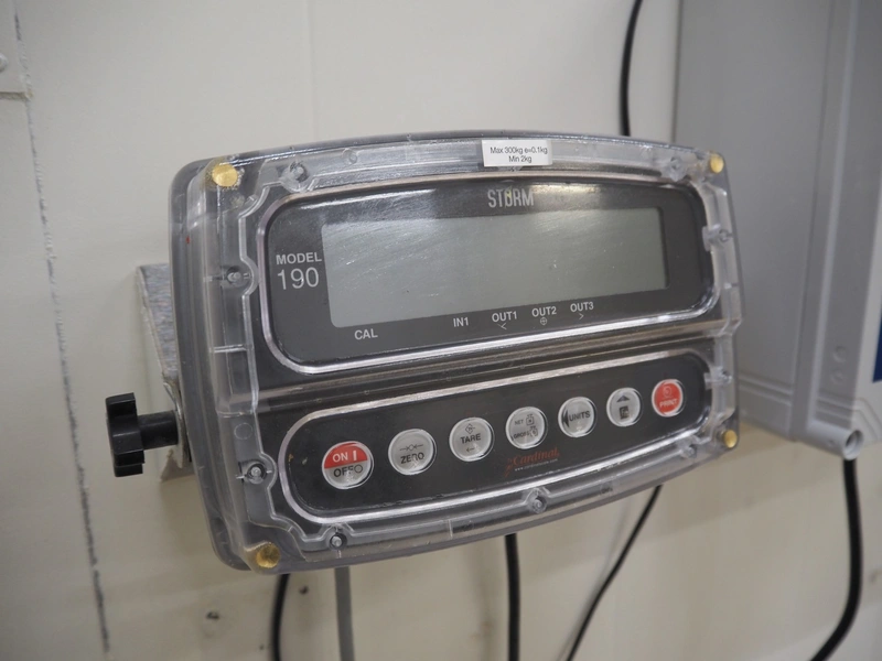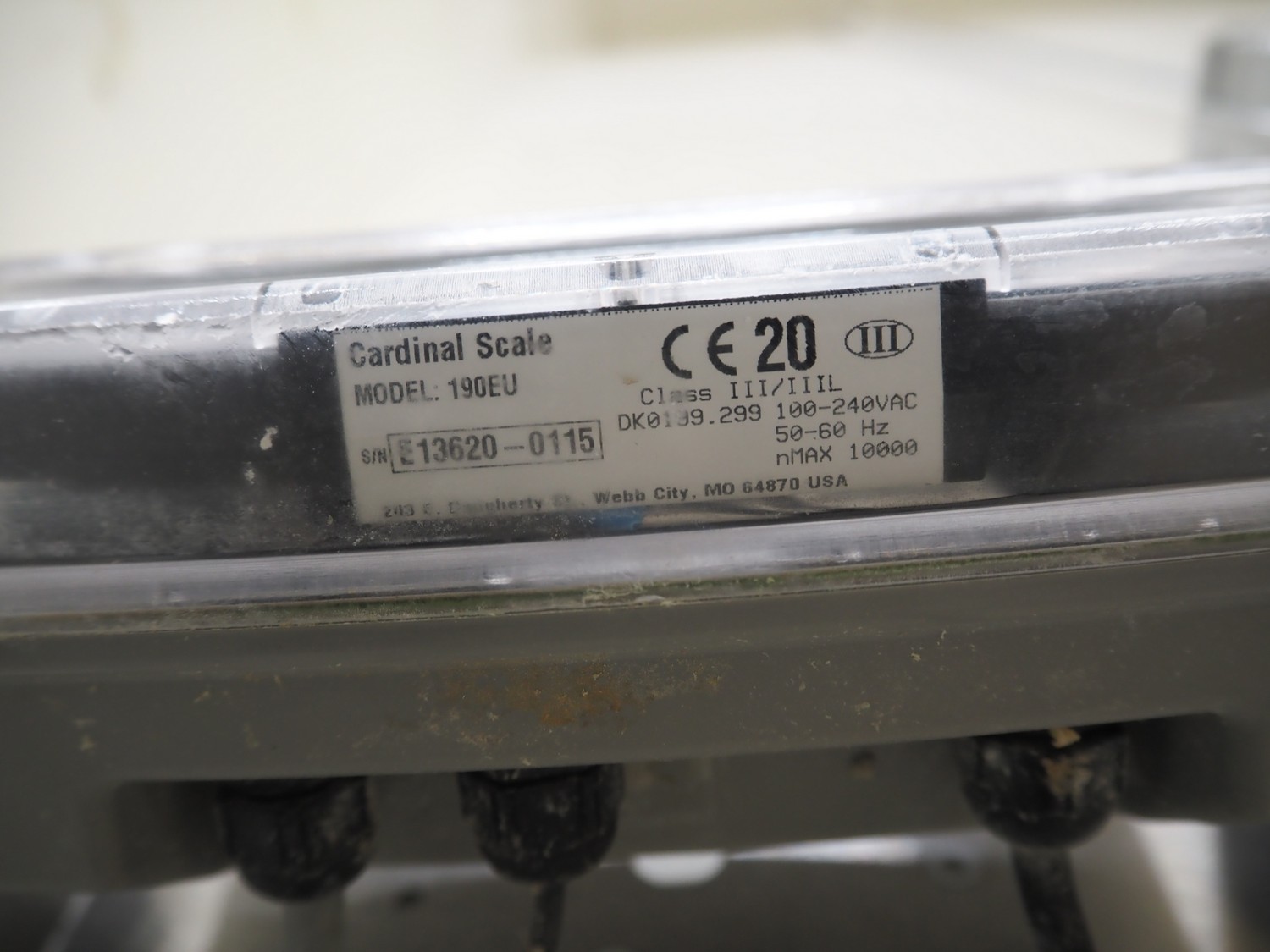 S/s floor weighing scale, dimensions: 1300 mm x 840 mm x 70 mm with Cardinal Scale indicator, model: 190EU, serial number: E13620-0115, dimensions indicator: 250 mm x 160 mm x 130 mm.