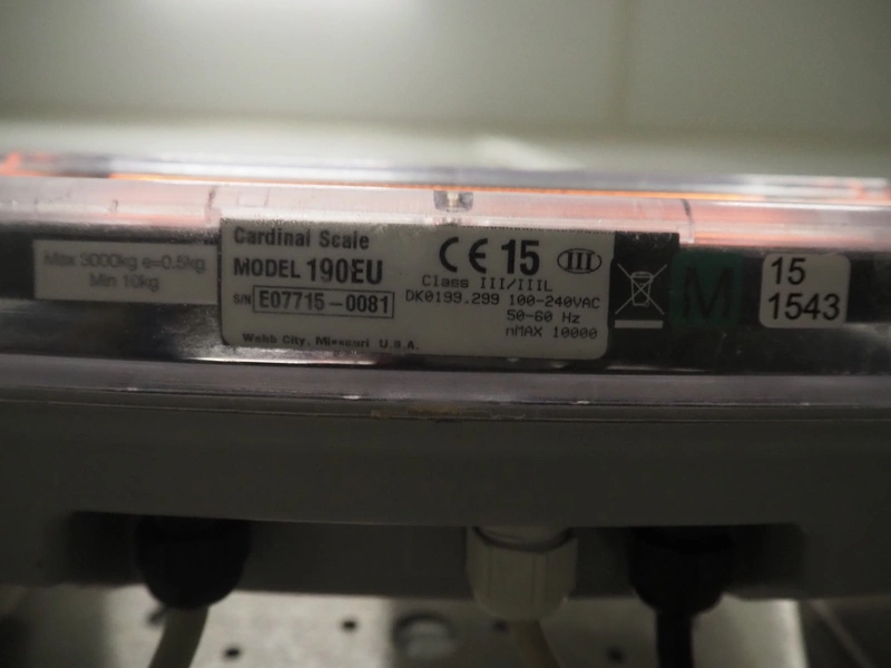 S/s floor weighing scale, dimensions: 1250 mm x 1500 mm, Cardinal Scale indicator, model: 190EU, dimensions indicator: 250 mm x 160 mm x 130 mm.