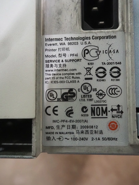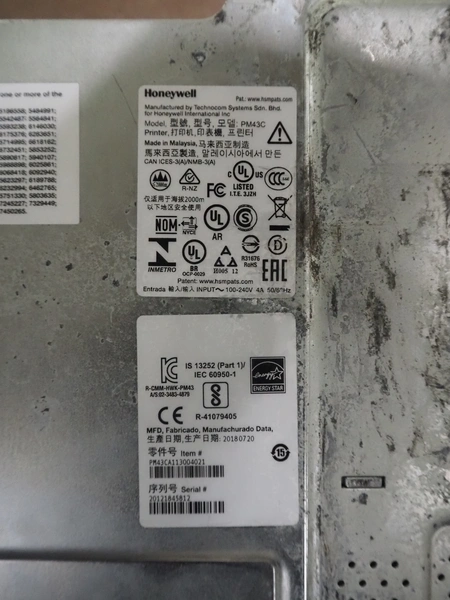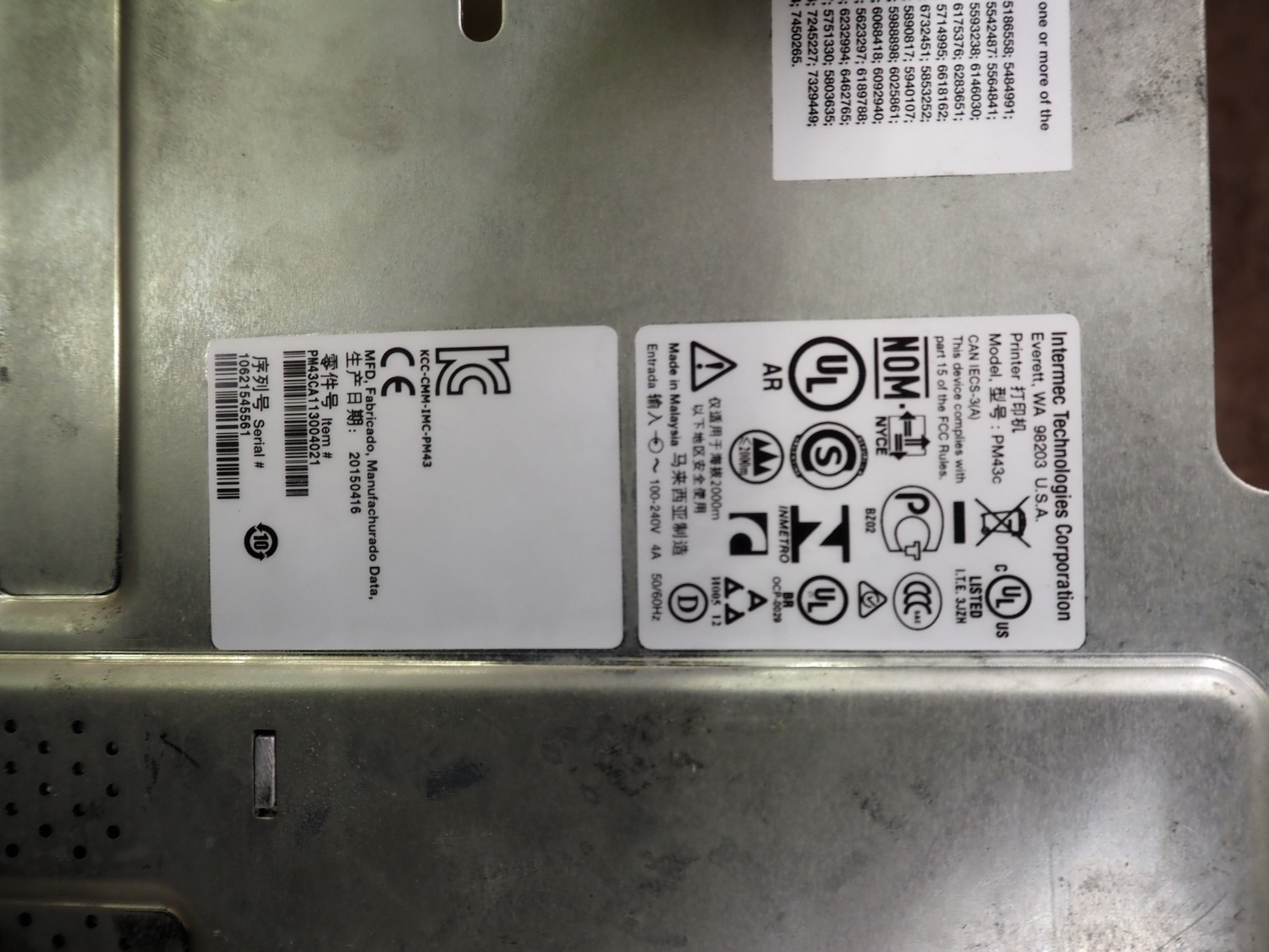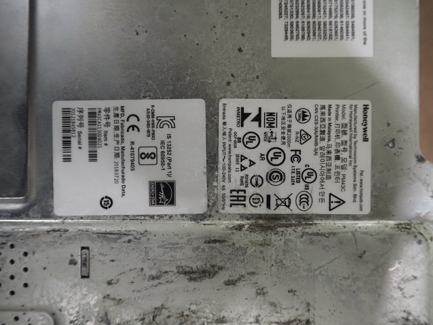 Honeywell label printer, model; PM43C, serial number: 2012845812, year of construction: 2018, 100-240 V, 50-60 Hz, 4 A and (2x) Intermec label printer, model: PM43c / PF4i, serial number: 10621545561, year of construction: 2015 / 2009, 100-240 V, 50-60 Hz, 4 A, dimensions: (3x) 420 mm x 250 mm x 170 mm.
