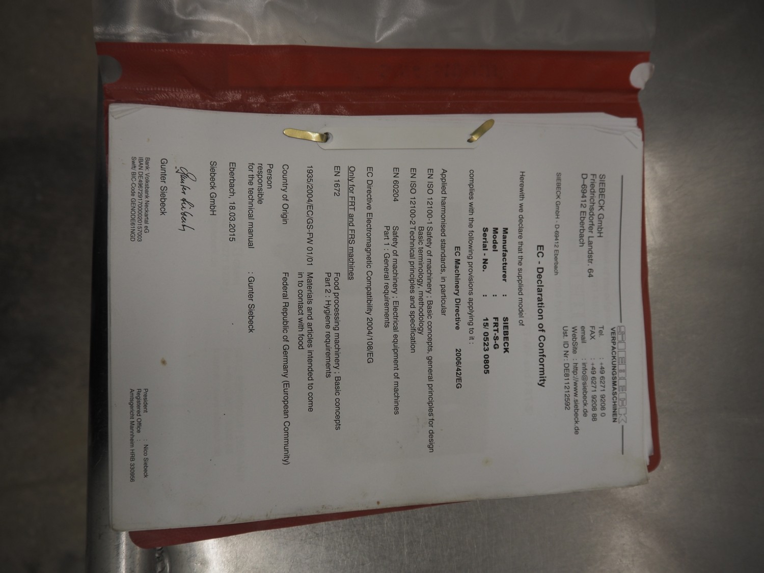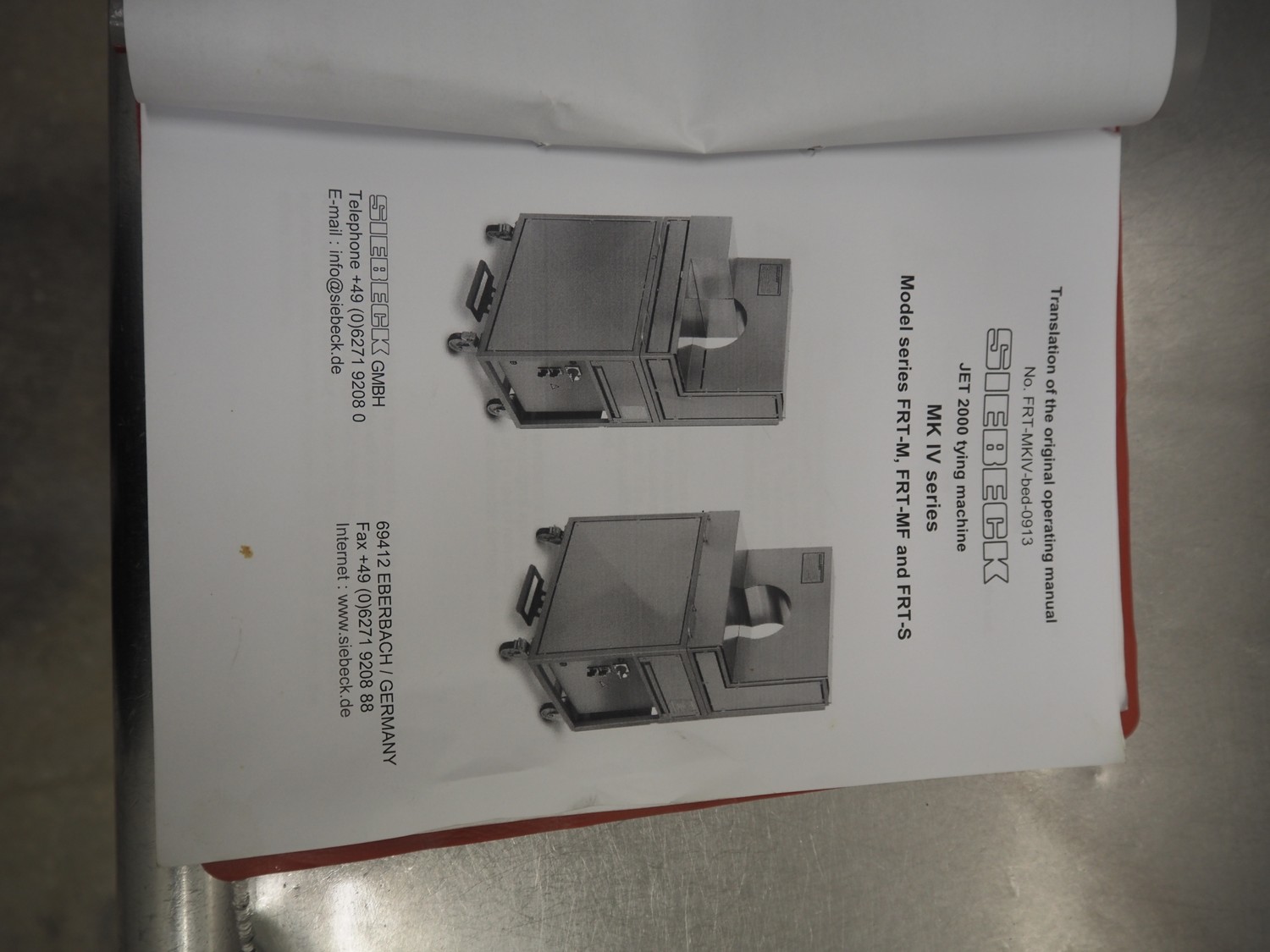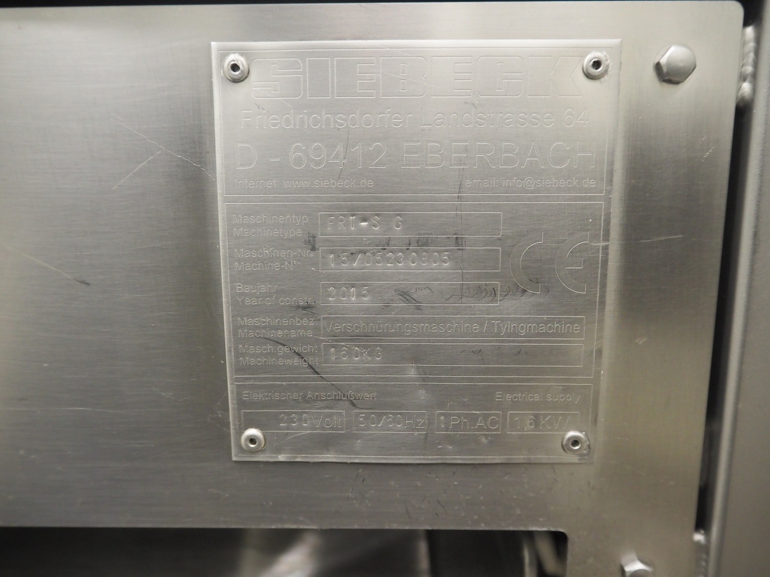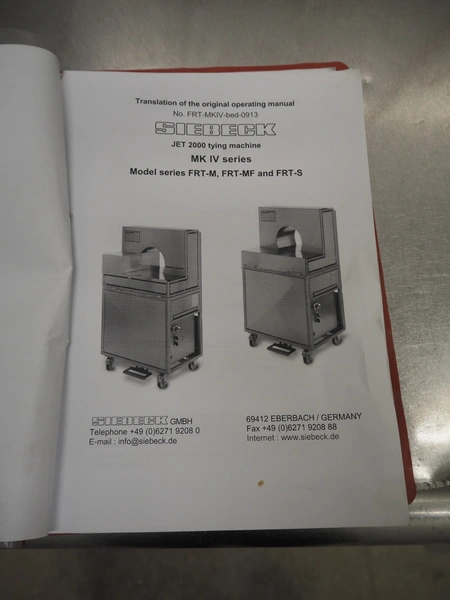Siebeck mobile string tying machine, type: FRT-S G, machine number: 15/05230805, year of construction: 2015, 230 V, 1 Ph, 50/60 Hz, 1.6 kW, weight: 160 kg, clearance: 290 mm x 250 mm, total dimensions: 800 mm x 600 mm x 1390 mm.