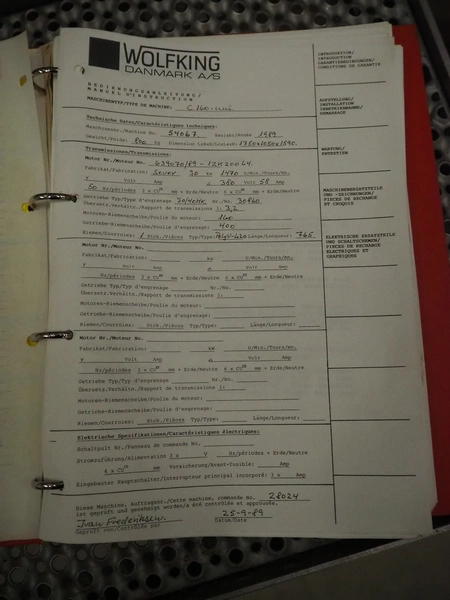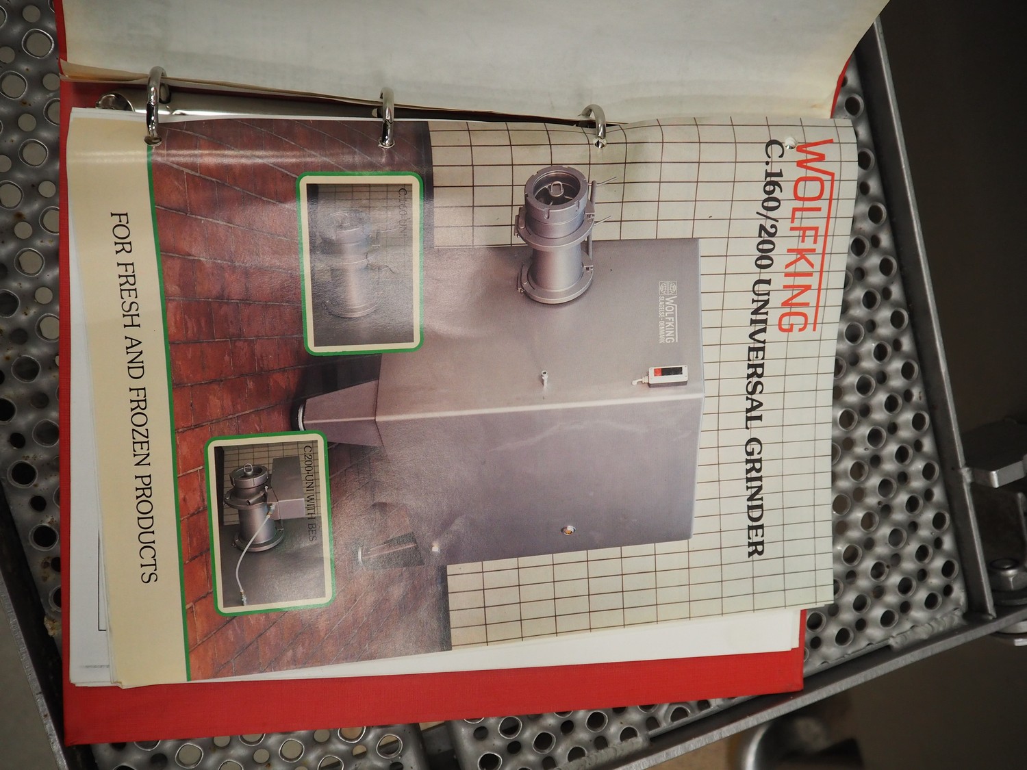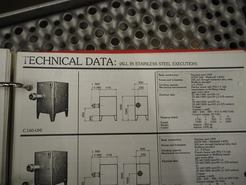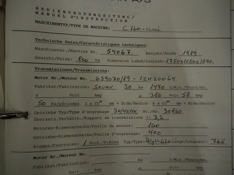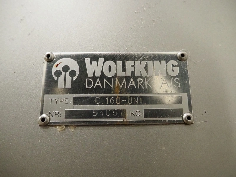 Wolfking grinder, type: C.160-UNI, number: 54067, year of construction: 1989, 380 V, 3 Ph, 50 Hz, 58 A, 30 kW, diameter plate: 160 mm, total dimensions: 1700 mm x 1000 mm x 1600 mm.