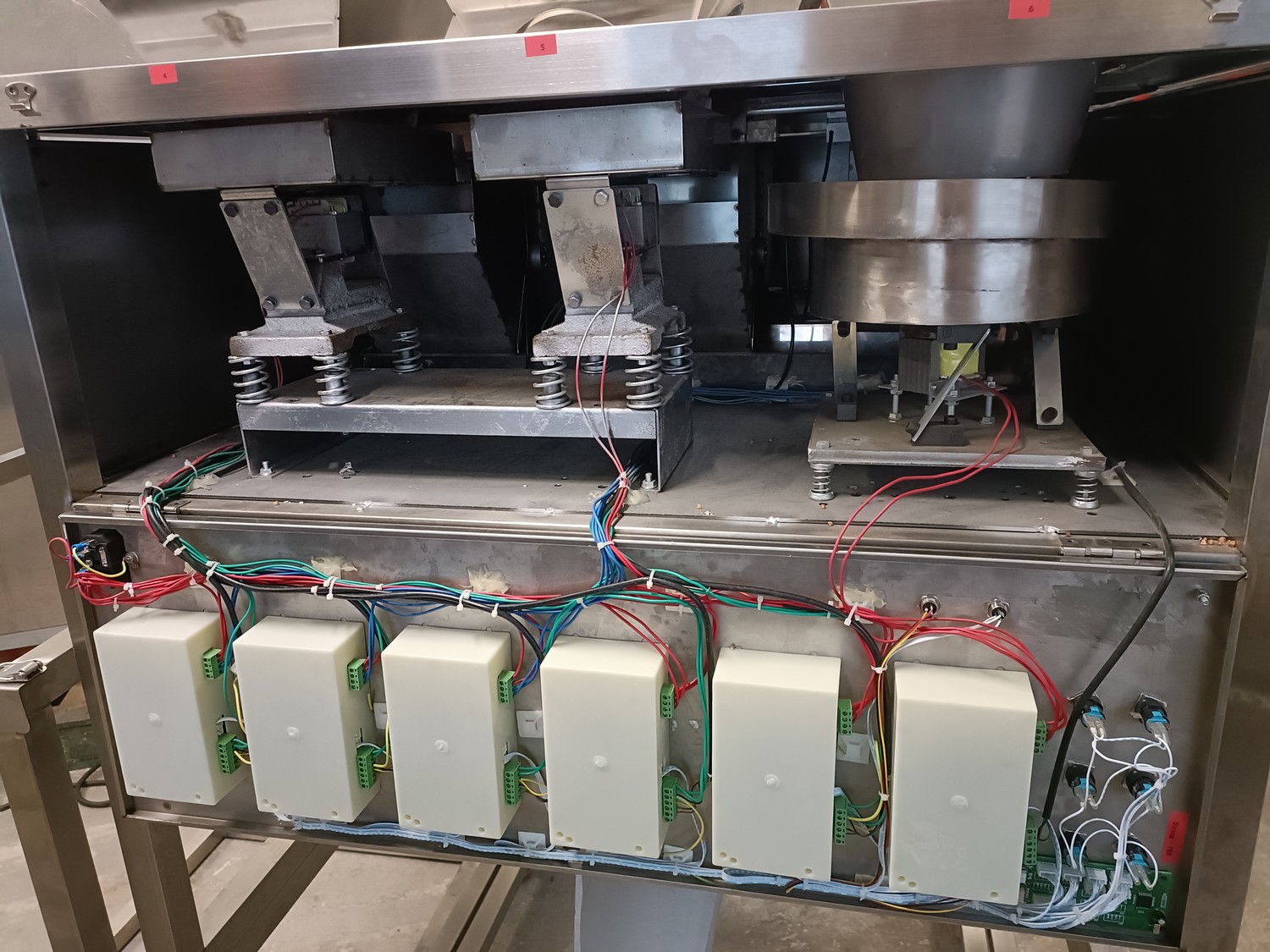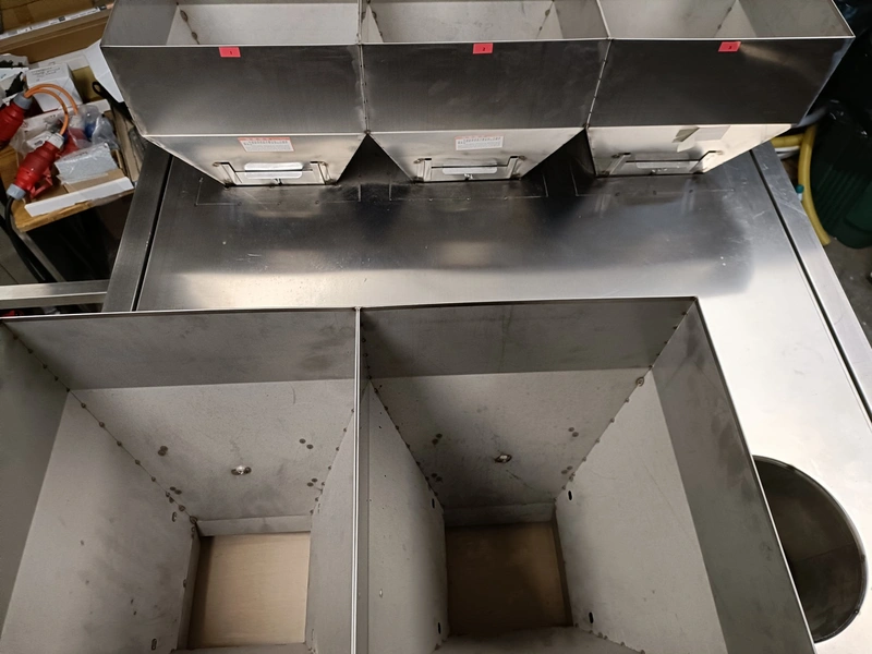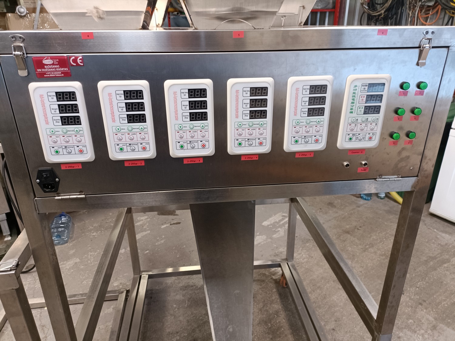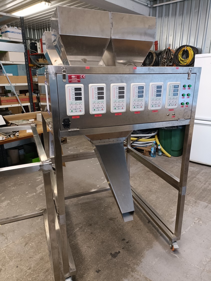 Mobile linear weigher with counter station, 5 heads, maximum weight: 250 gram, minimum weight: 2 gram, dimensions: 1000 mm x 1000 mm x 2200 mm.