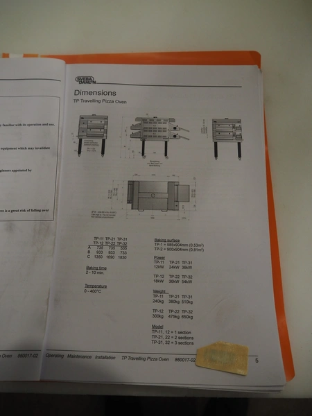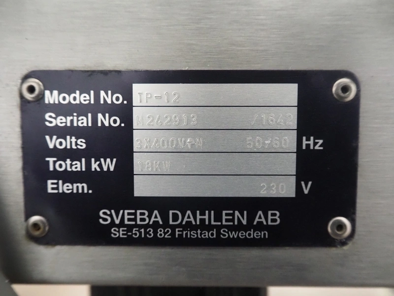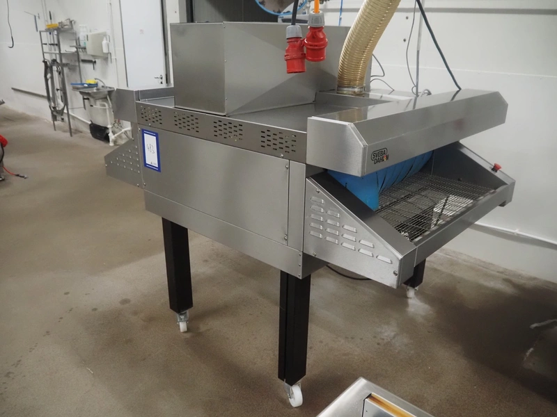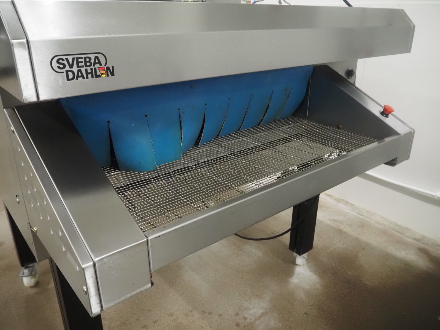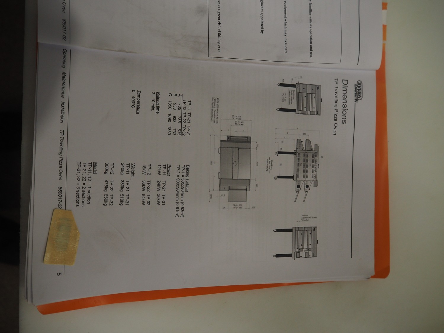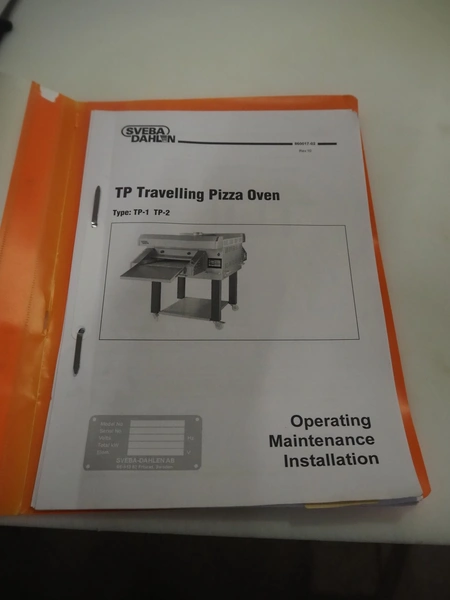 Sveba Dahlen AB mobile pizza oven, model number: TP-12, serial number: M242913,/1642, 3x400 V, 50/60 Hz, 18 kW, belt width s/s mesh belt: 900 mm, clearance: 950 mm x 180 mm, total dimensions: 1850 mm x 1390 mm x 1650 mm.
