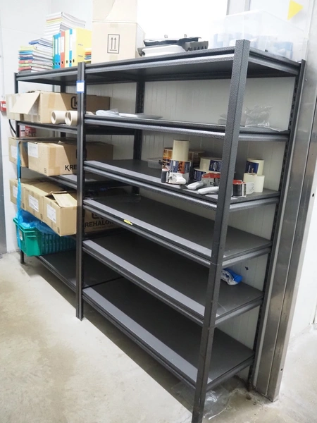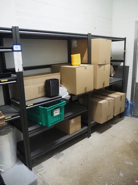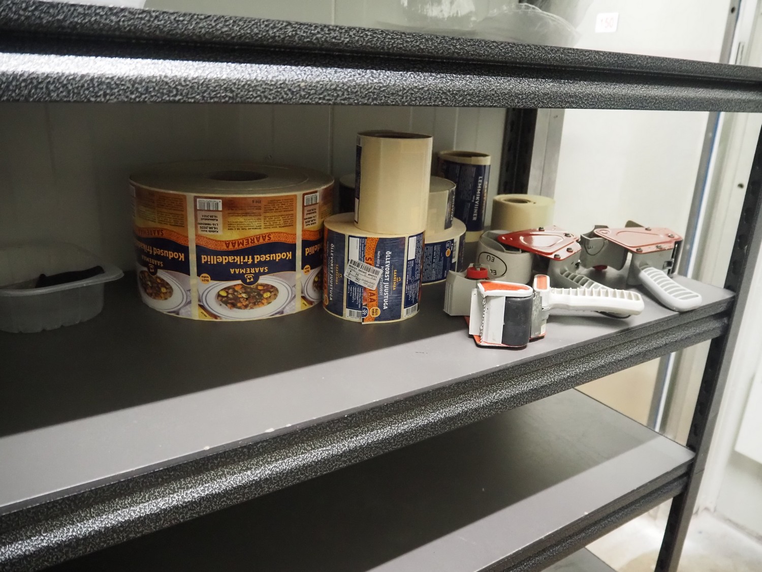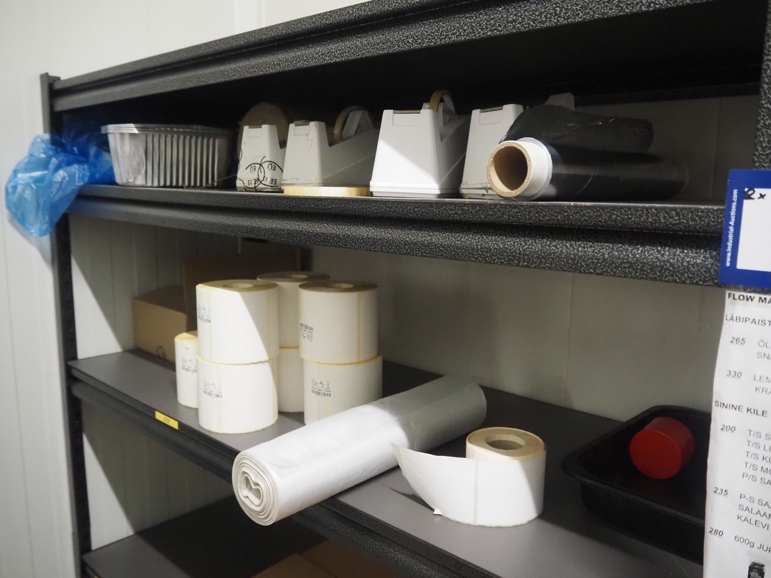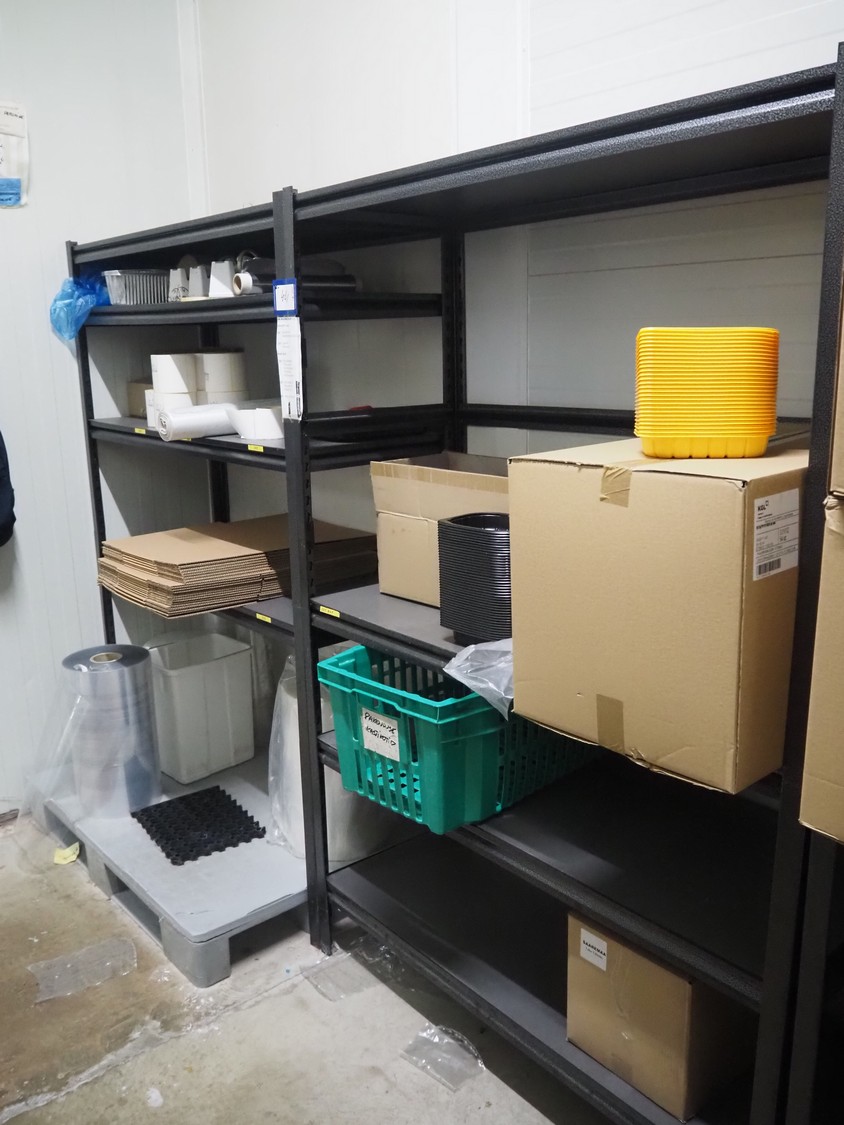 5 steel racks with various packaging material, among others: labels and plastic trays, dimensions racks: (5x) 1240 mm x 480 mm x 1830 mm.