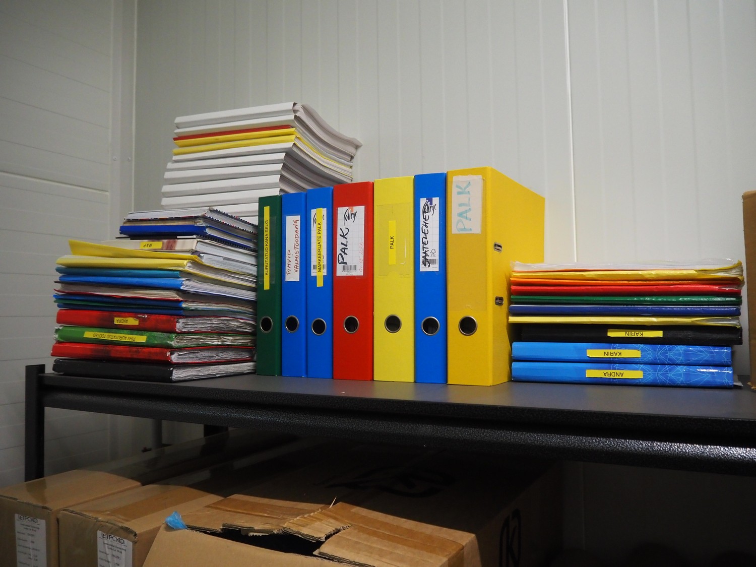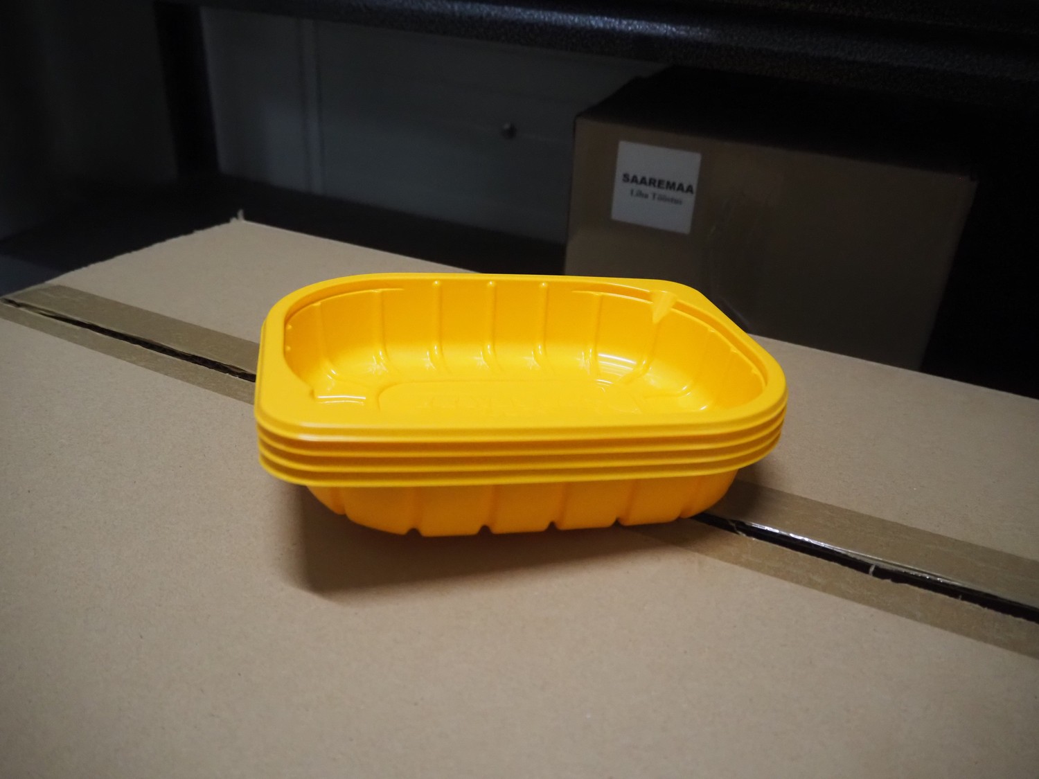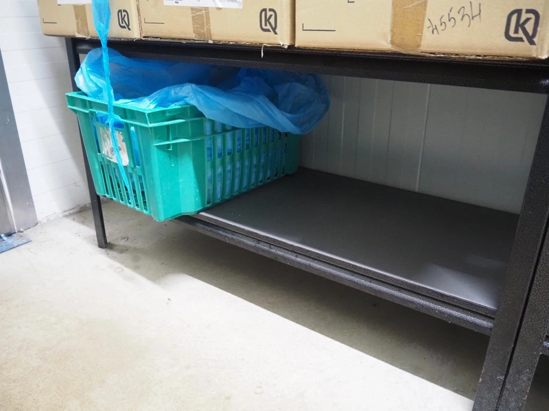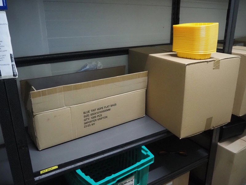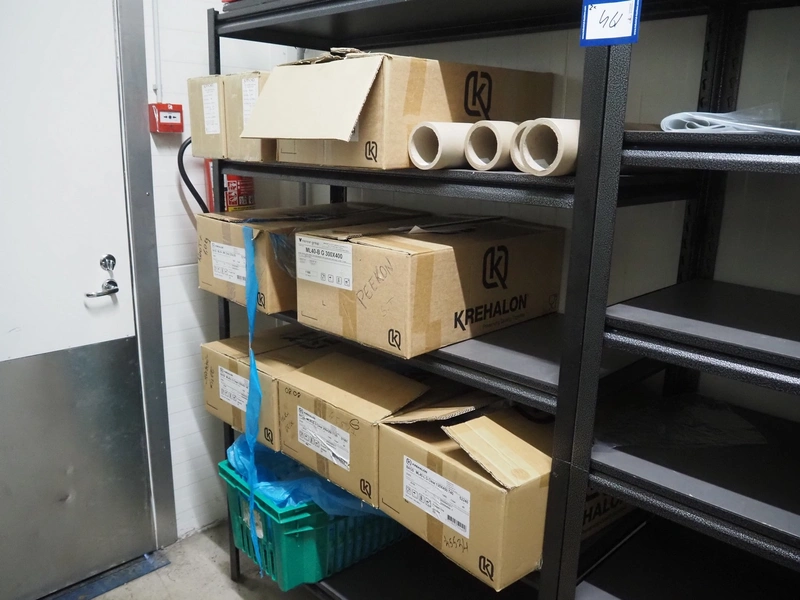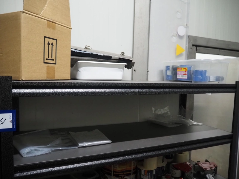 5 steel racks with various packaging material, among others: labels and plastic trays, dimensions racks: (5x) 1240 mm x 480 mm x 1830 mm.