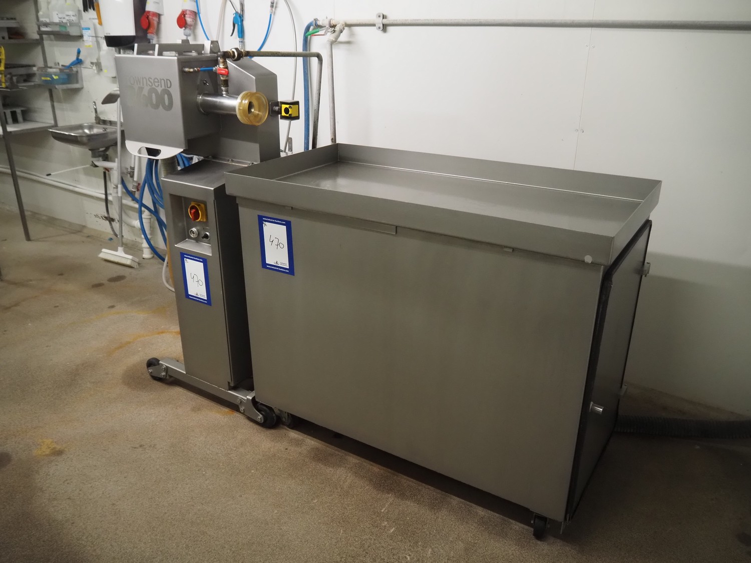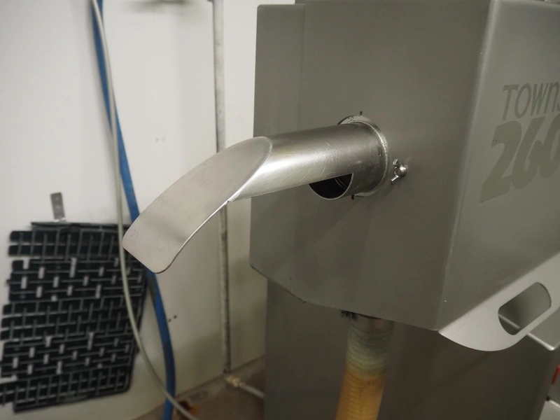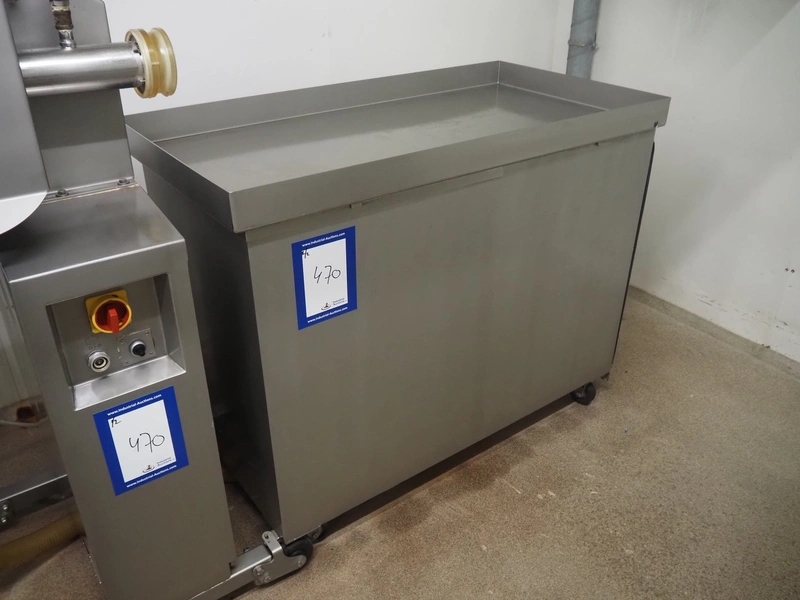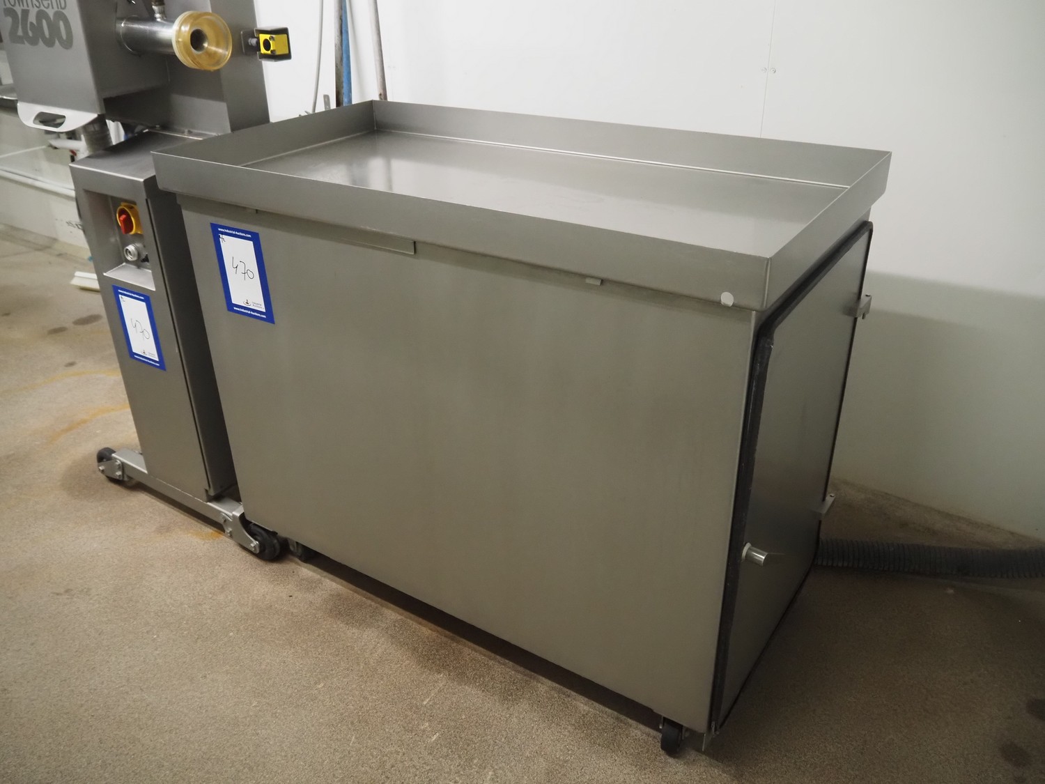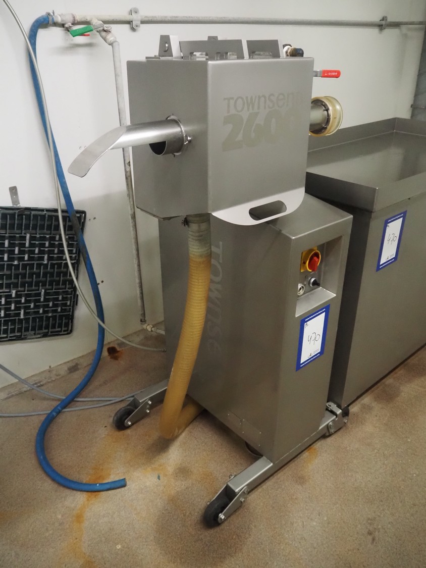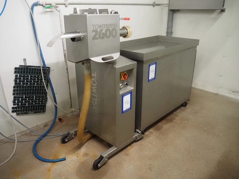 Townsend mobile sausage peeler with suction device, model: 2600, number: 9163, year of construction: 2006, 380 V, 3 Ph, 50 Hz, 3.7/8.0 A, 1.5/3.7 kW, diameter pipe: 65 mm, dimensions peeler: 800 m mx 630 mm x 1500 mm, dimensions suction device: 1300 mm x 670 mm x 1020 mm.