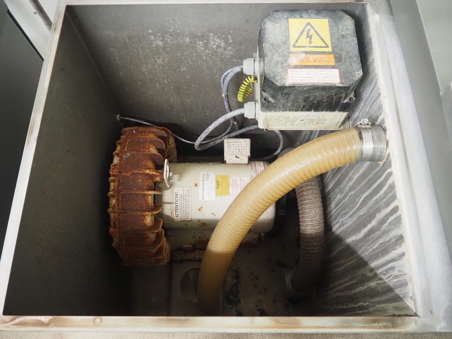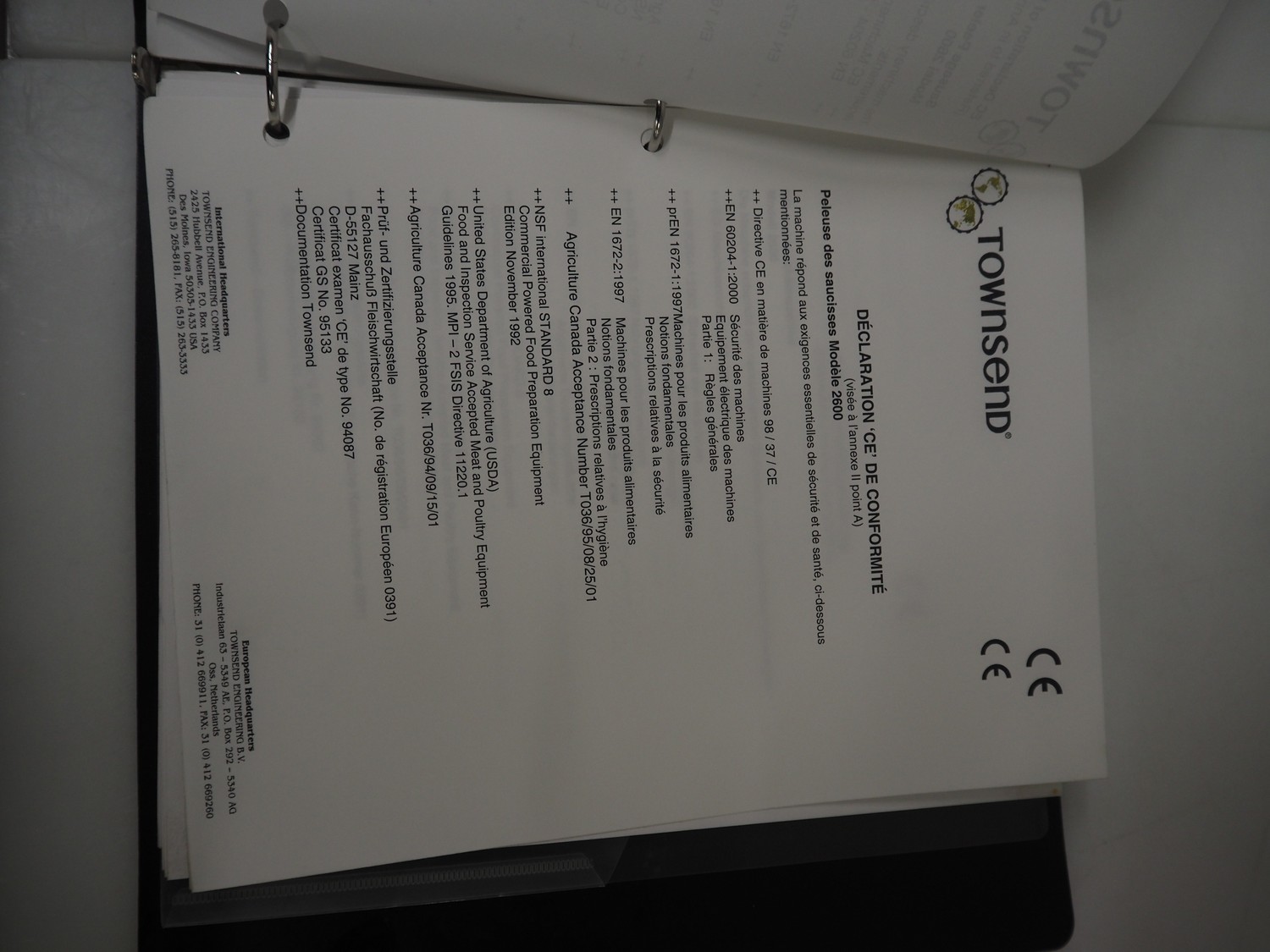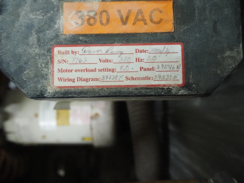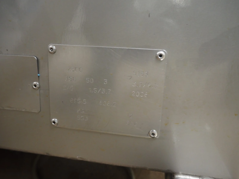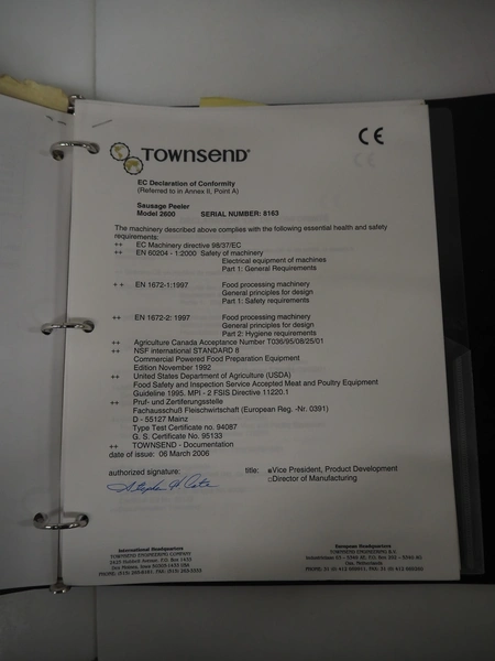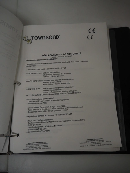 Townsend mobile sausage peeler with suction device, model: 2600, number: 9163, year of construction: 2006, 380 V, 3 Ph, 50 Hz, 3.7/8.0 A, 1.5/3.7 kW, diameter pipe: 65 mm, dimensions peeler: 800 m mx 630 mm x 1500 mm, dimensions suction device: 1300 mm x 670 mm x 1020 mm.