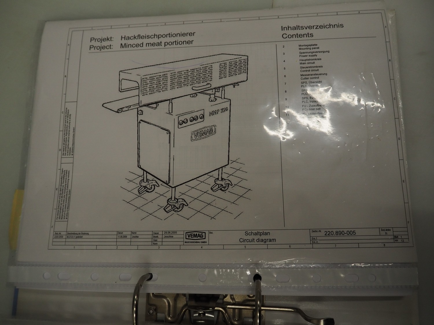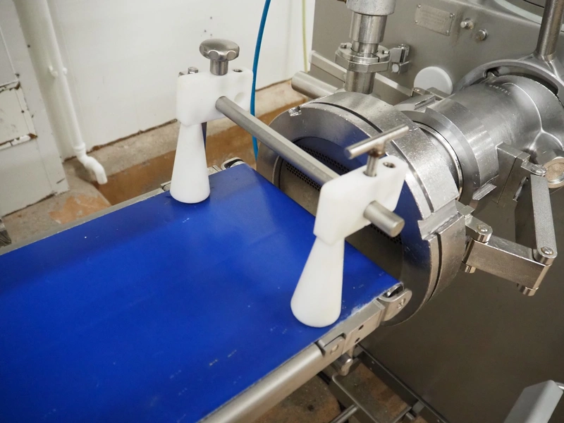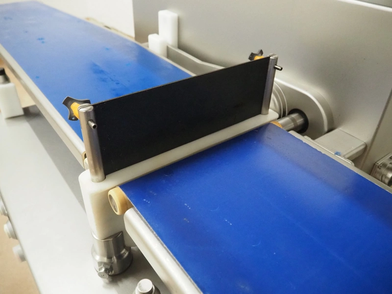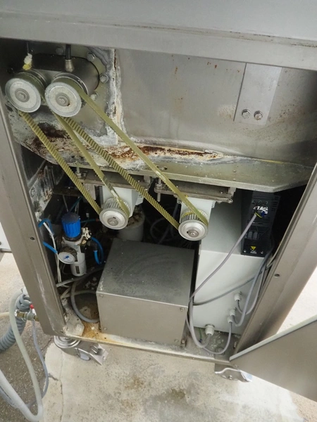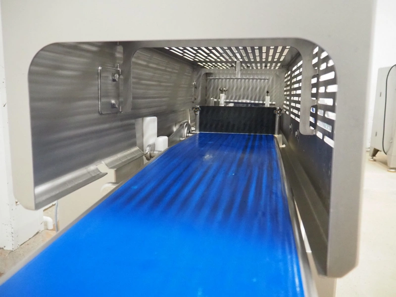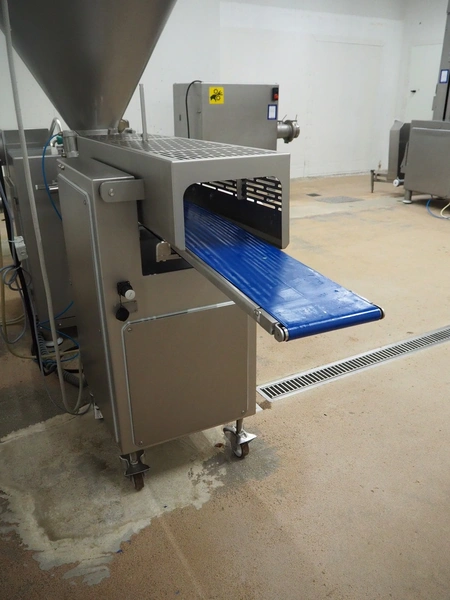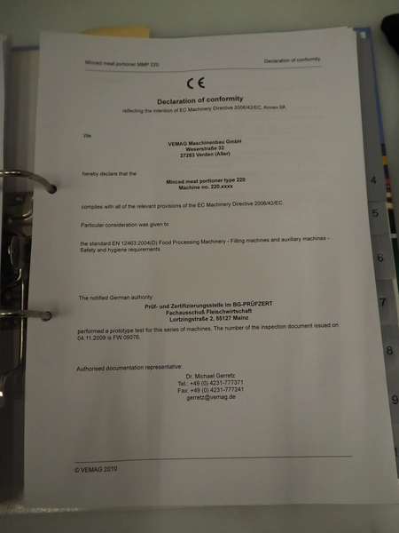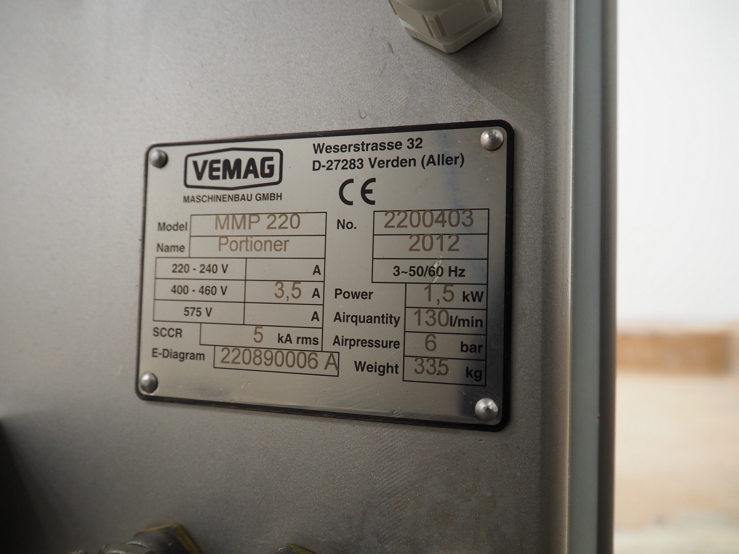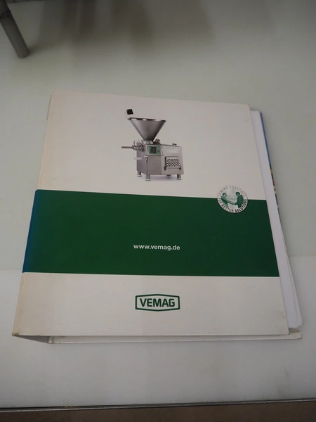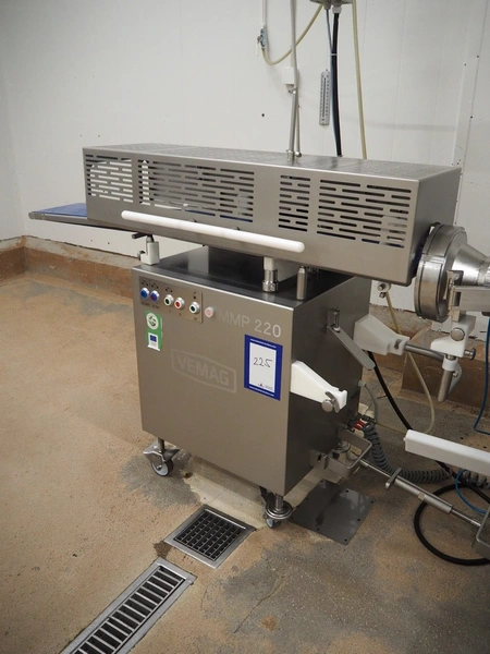 Vemag Maschinenbau GmbH mobile portioning machine, model: MMP 220, number: 2200403, year of construction: 2012, 400-460 V, 3 Ph, 50/60 Hz, 3.5 A, 1.5 kW, 6 bar, weight: 335 kg, working width: 260 mm, plastic belts, belt width: (2x) 250 mm, total dimensions: 1760 mm x 600 mm x 1550 mm.