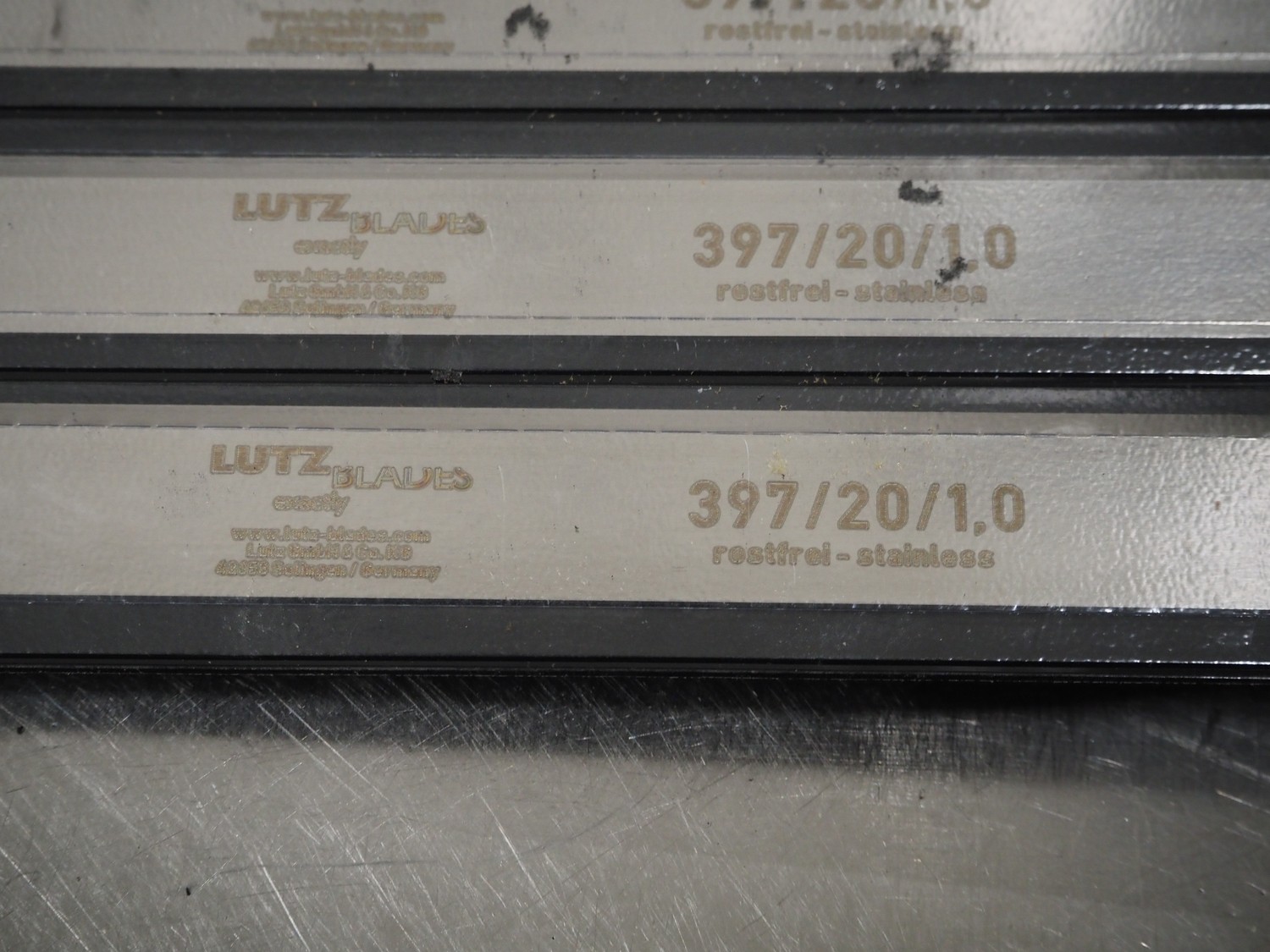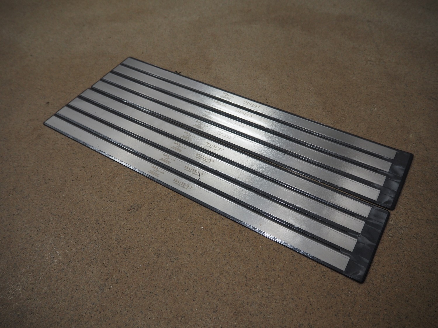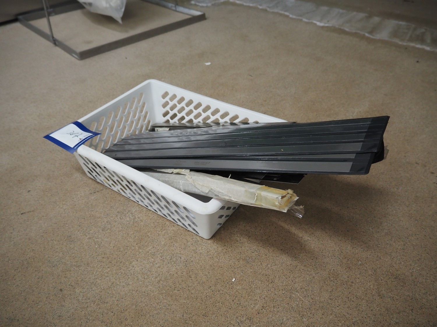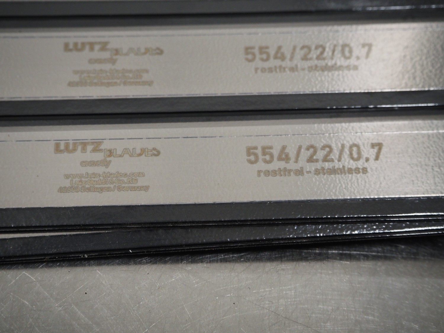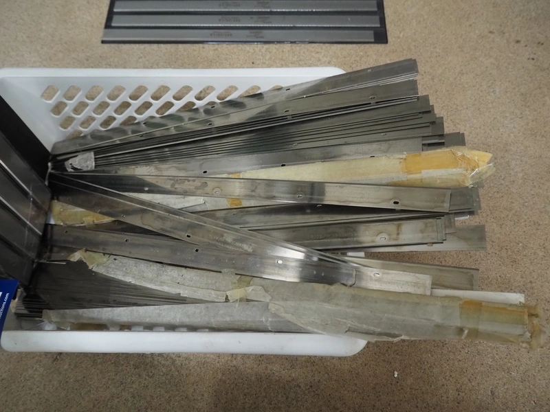 Plastic crate with Lutz Blades knives for skinning machine, length: 397 mm and 554 mm.