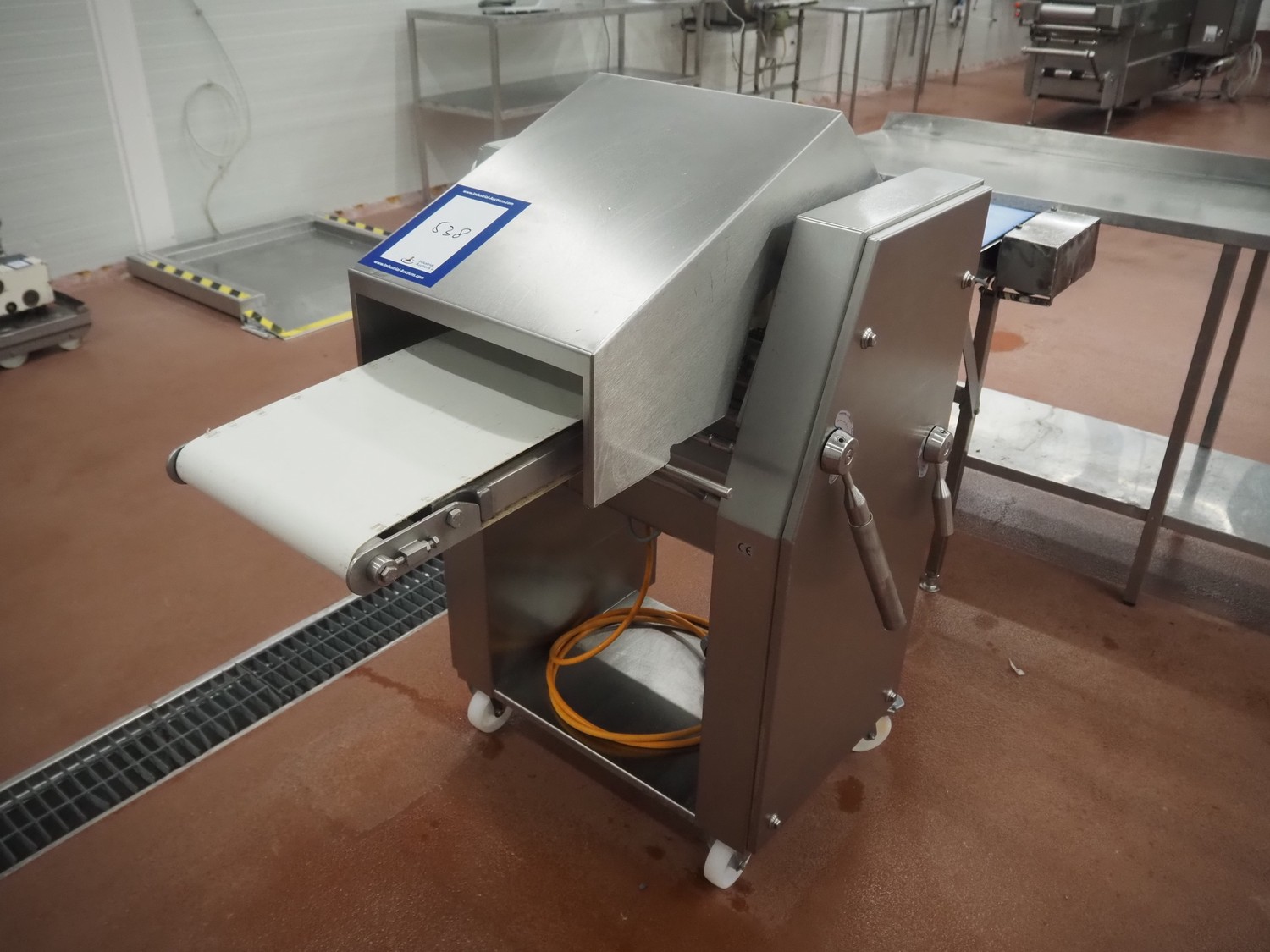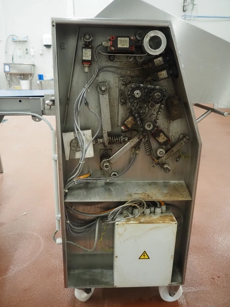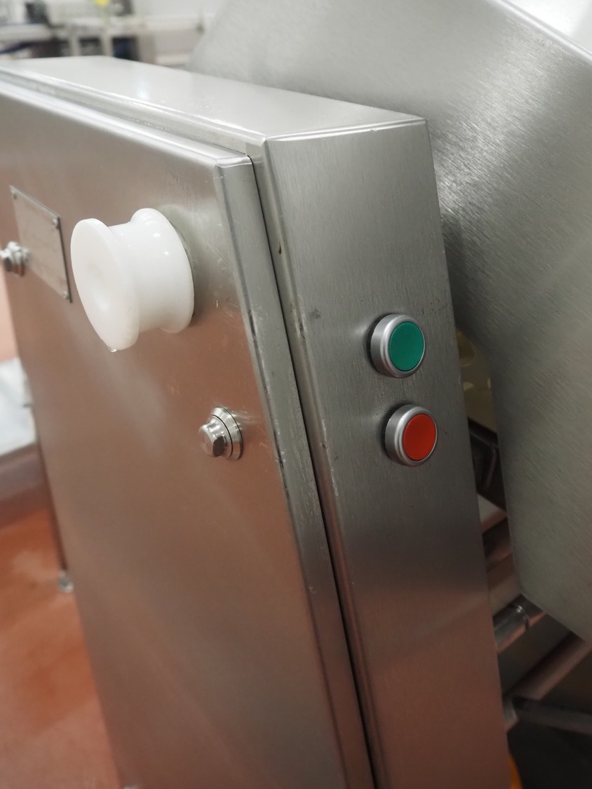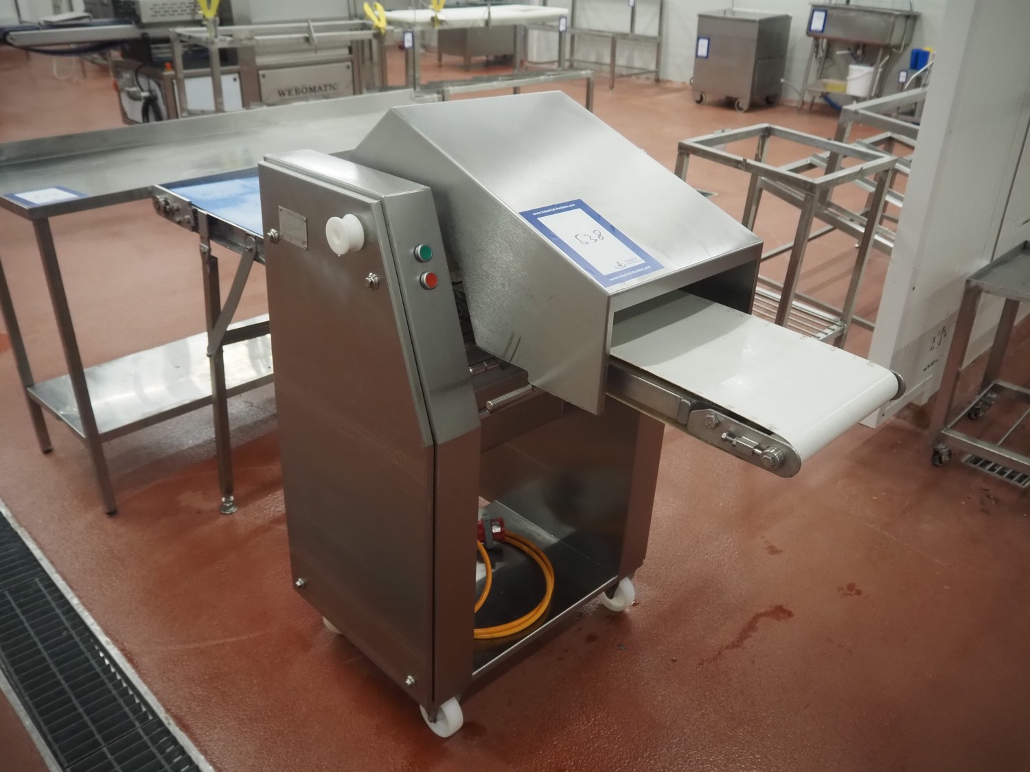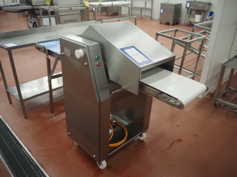 Weber Maschinenbau GmbH mobile skinning and derinding machine, type: ASB 400, number: 525, year of construction: 2005, 400 V, 50 Hz, 0.85 kW, weight: 190 kg, belt width: 325 mm and 390 mm, working width: 400 mm, total dimensions: 1800 mm x 800 mm x 1200 mm.