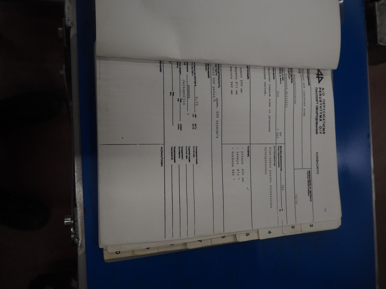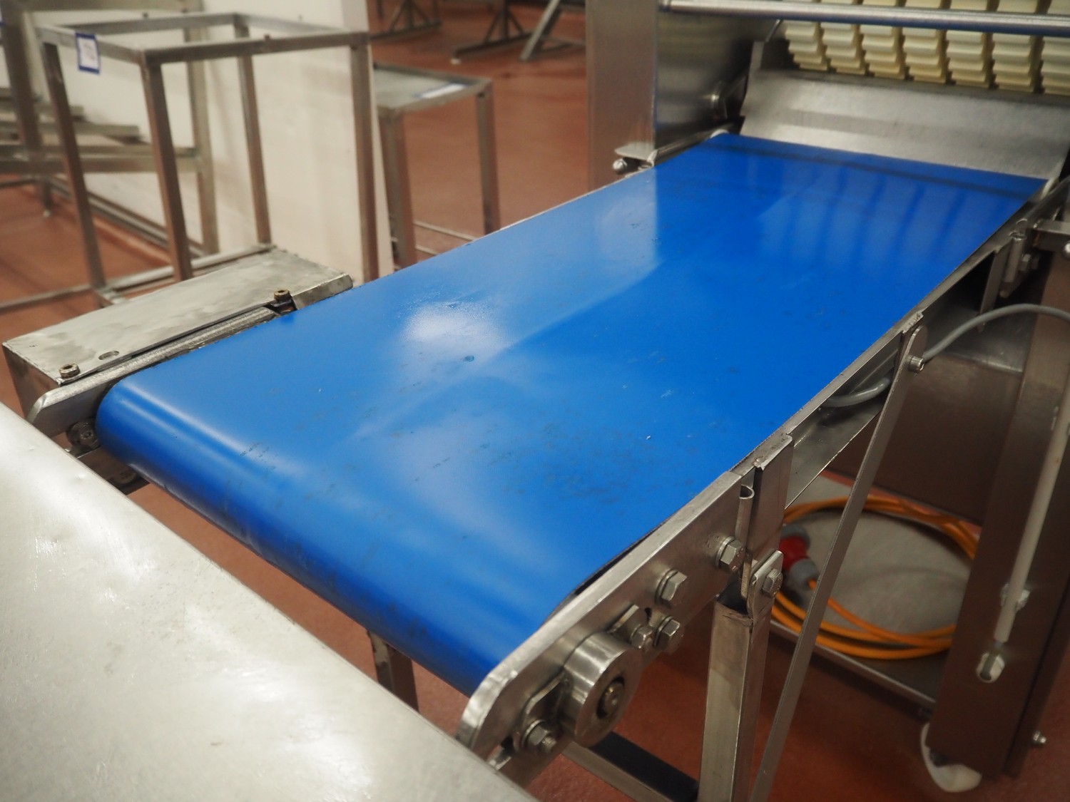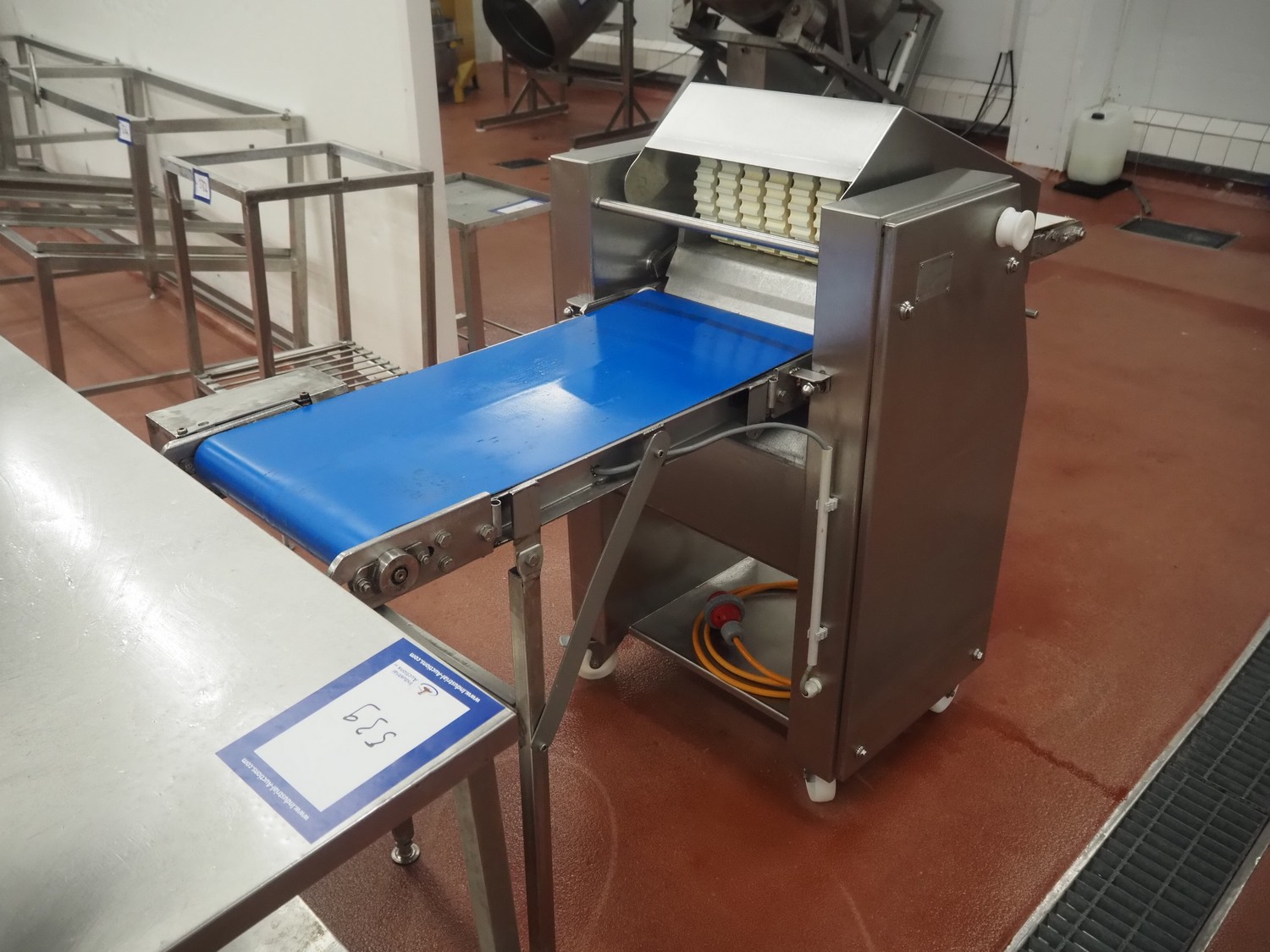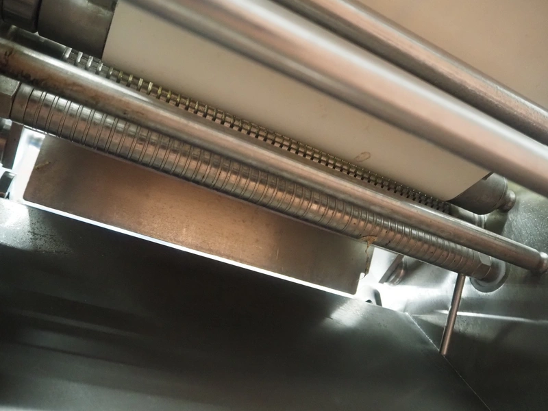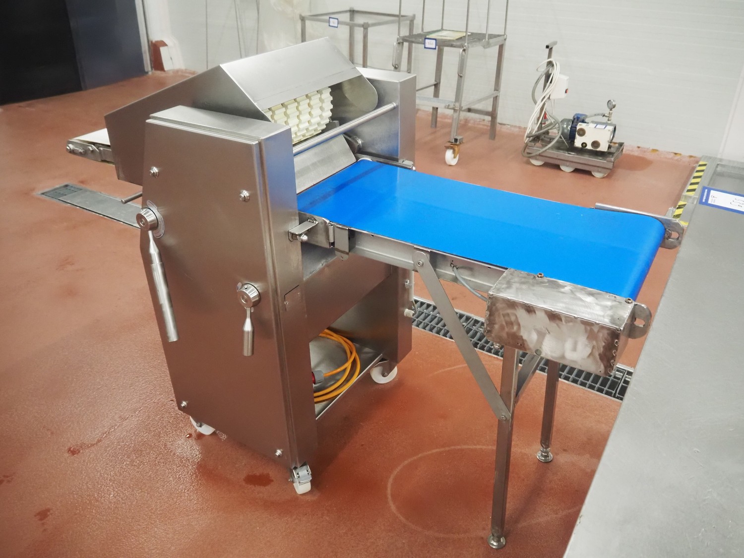 Weber Maschinenbau GmbH mobile skinning and derinding machine, type: ASB 400, number: 525, year of construction: 2005, 400 V, 50 Hz, 0.85 kW, weight: 190 kg, belt width: 325 mm and 390 mm, working width: 400 mm, total dimensions: 1800 mm x 800 mm x 1200 mm.