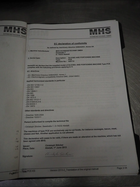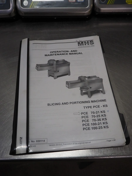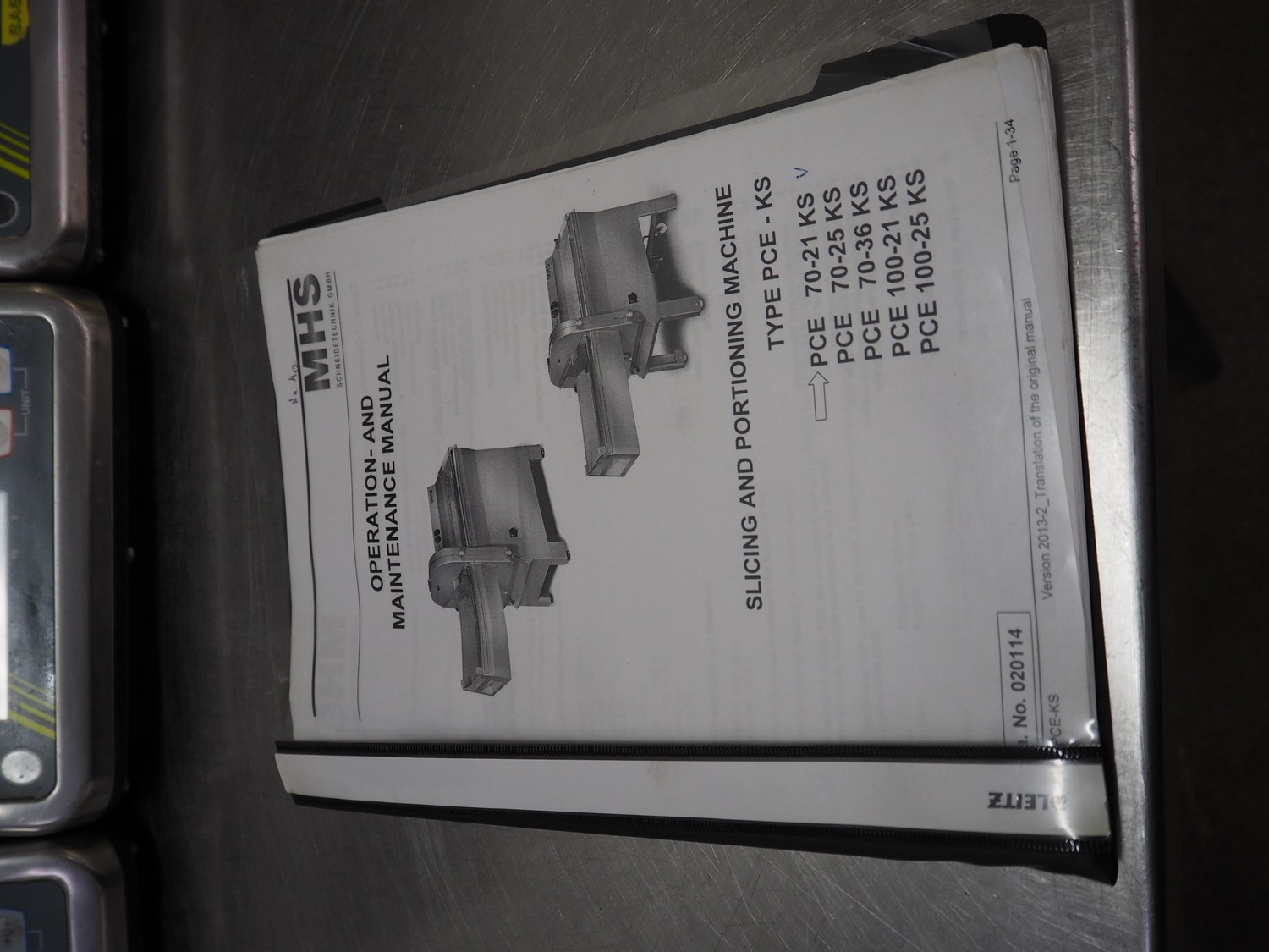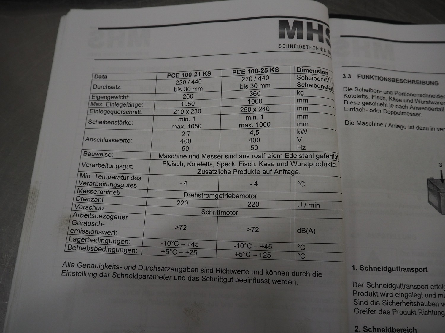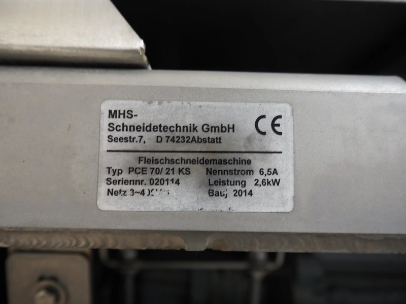 MHS-Schneidetechnik GmbH slicer, type: PCE 70/21 KS, serial number: 020114, year of construction: 2014, 400 V, 3 Ph, 6.5 A, 2.6 kW, clearance: 220 mm x 230 mm, total dimensions: 1850 mm x 800 mm x 1200 mm. Including extra knife.