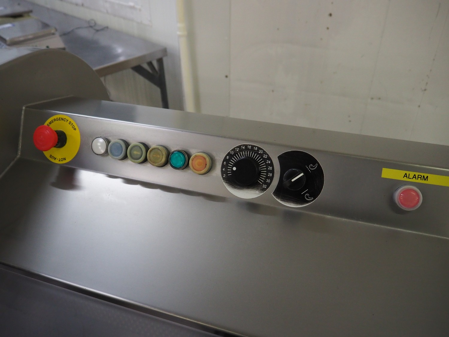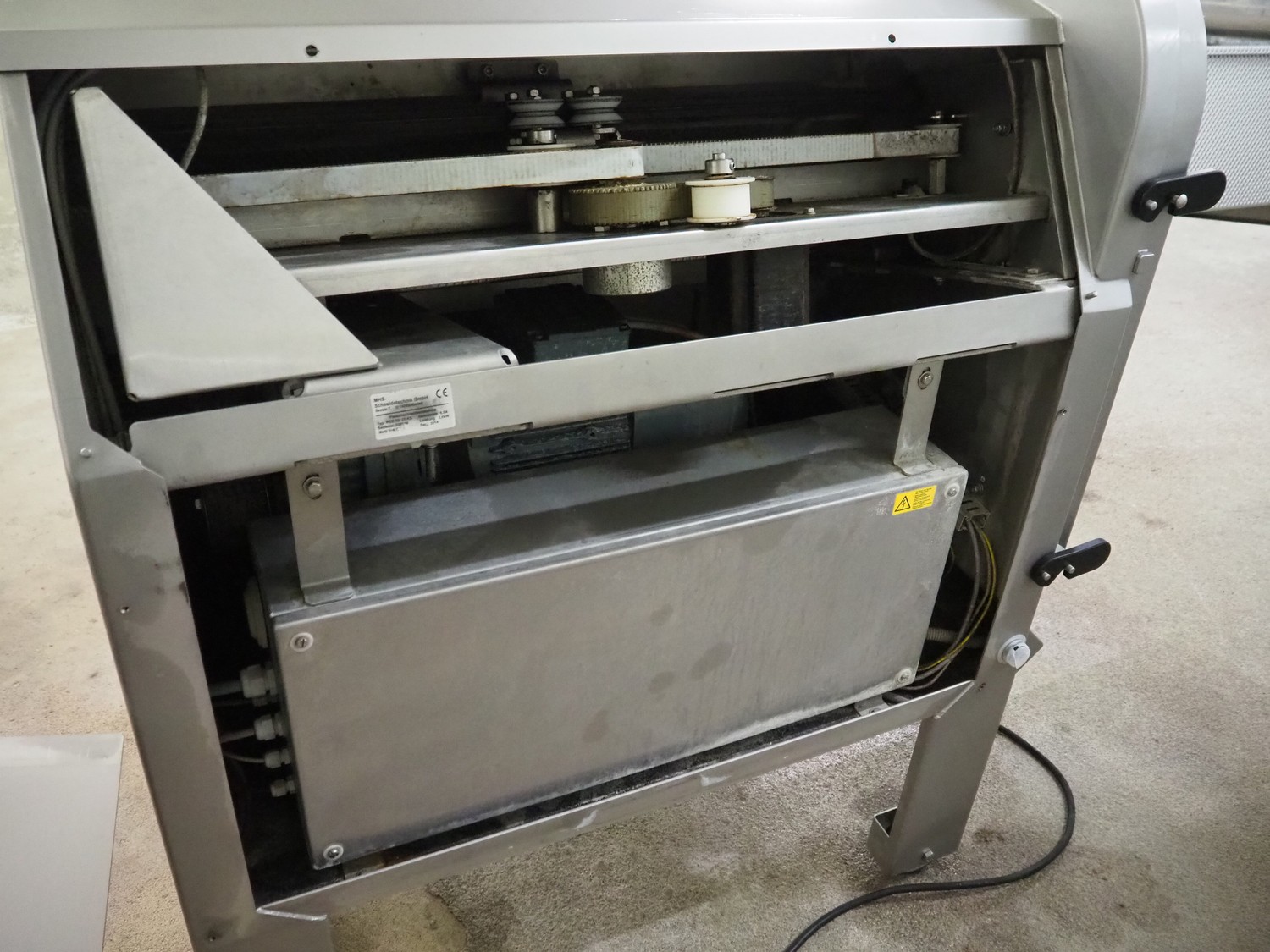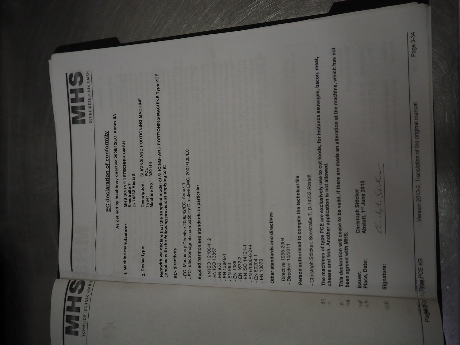 MHS-Schneidetechnik GmbH slicer, type: PCE 70/21 KS, serial number: 020114, year of construction: 2014, 400 V, 3 Ph, 6.5 A, 2.6 kW, clearance: 220 mm x 230 mm, total dimensions: 1850 mm x 800 mm x 1200 mm. Including extra knife.