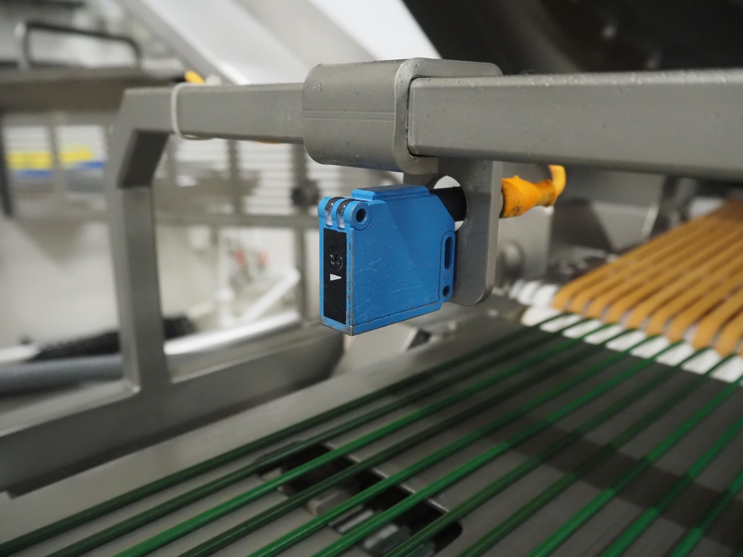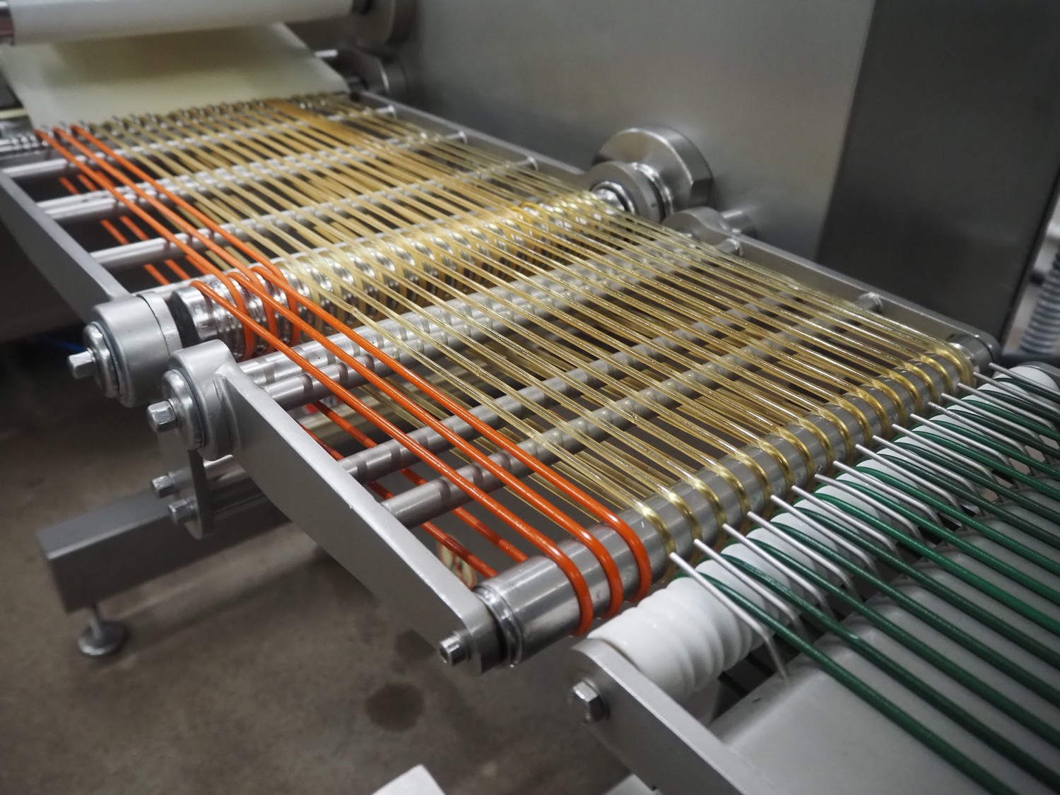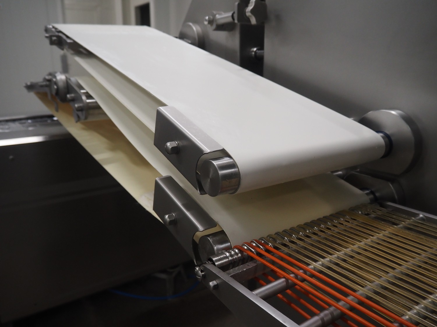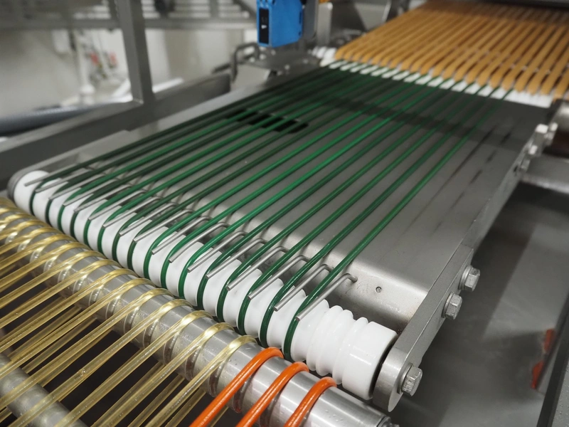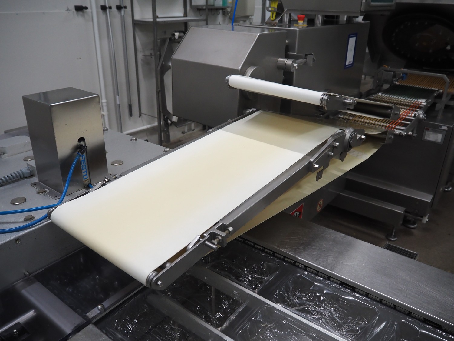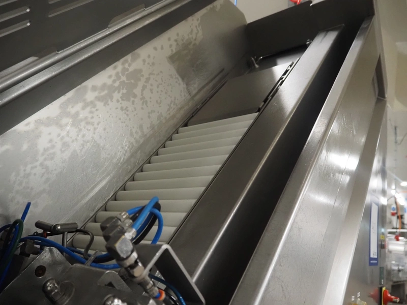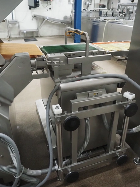 - Treif Maschinenbau GmbH outfeed belt, plastic string belt, belt width: 300 mm, plastic belts, belt width: (2x) 320 mm, total dimensions outfeed belt: 2330 mm x 880 mm x 1850 mm;