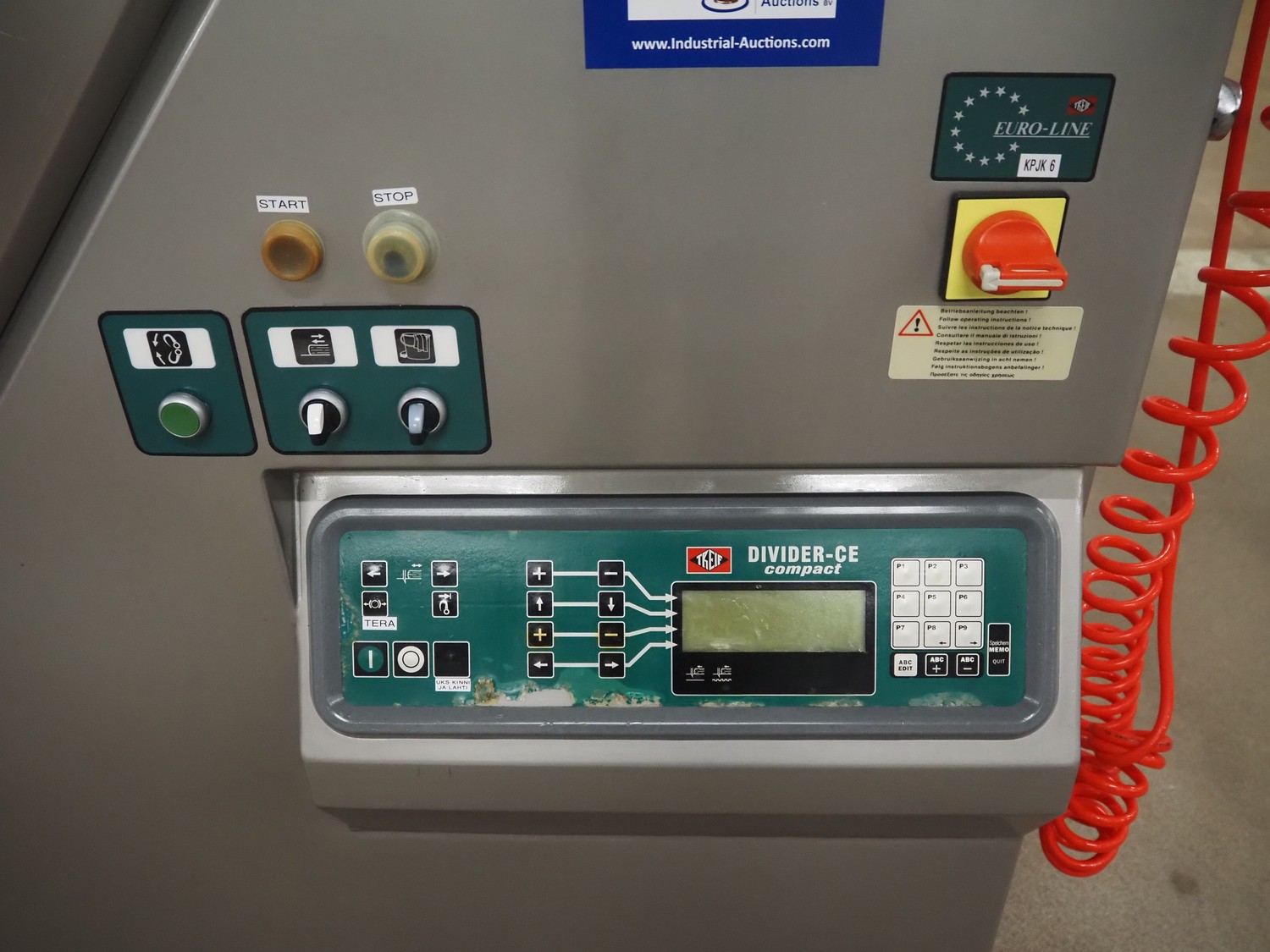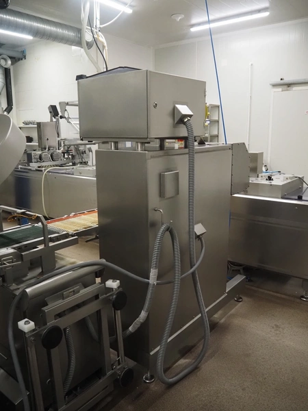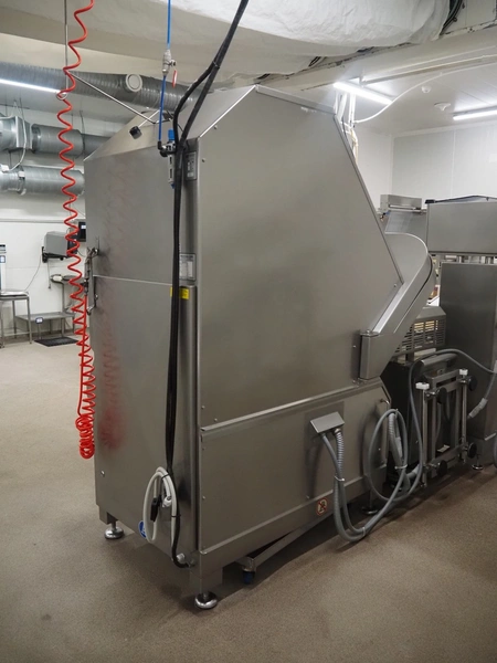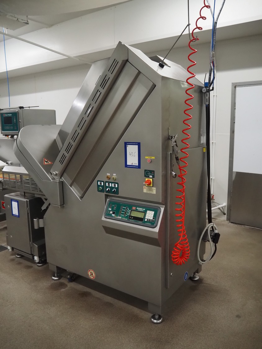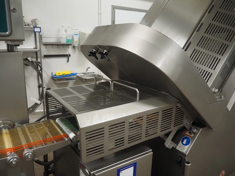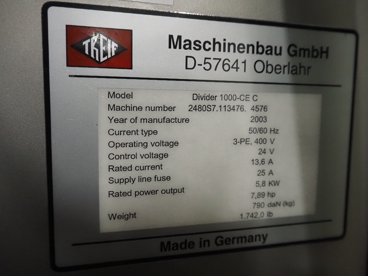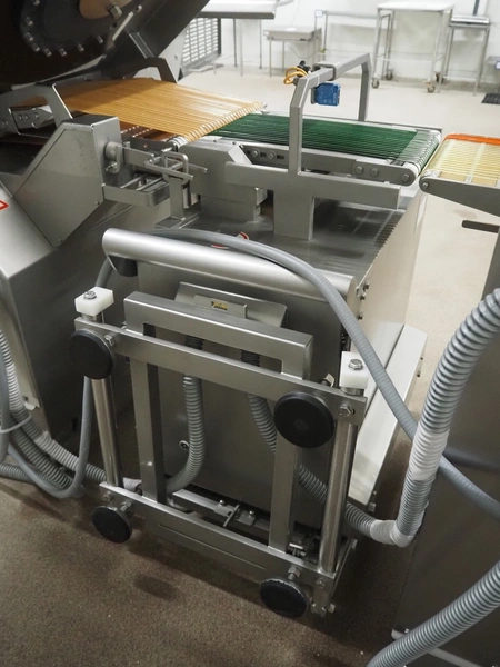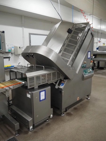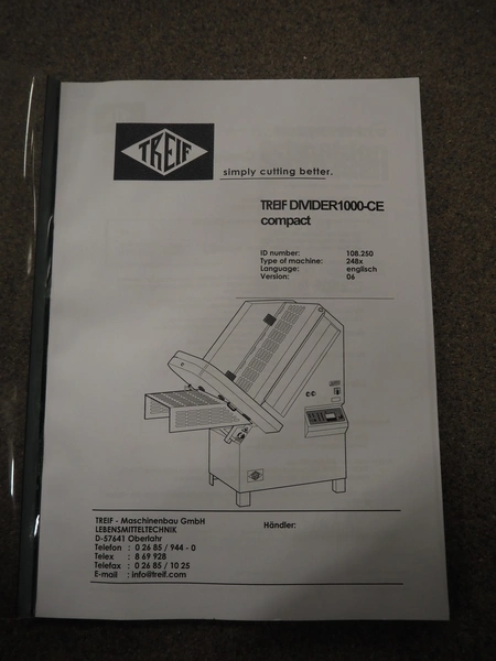 - Treif Maschinenbau GmbH slicer, model: Divider 1000-CE C, machine number: 2480S7.113476.4576, year of construction: 2003, 400 V, 3 Ph, 50/60 Hz, 13.6 A, 5.8 kW, weight: 790 kg, plastic rollers, roller width: 260 mm, clearance: 280 mm x 170 mm, plastic outfeed belt, belt width: 400 mm, total dimensions slicer: 2200 mm x 1000 mm x 2200 mm;