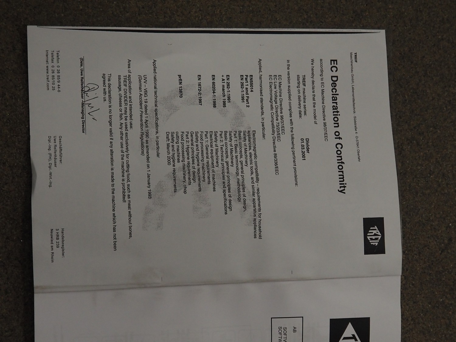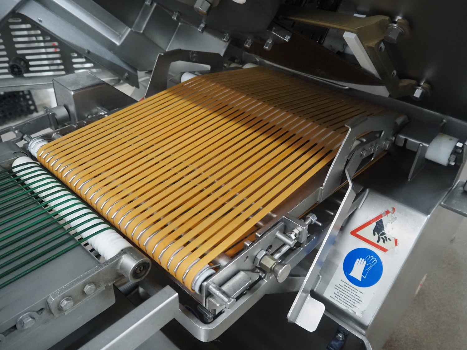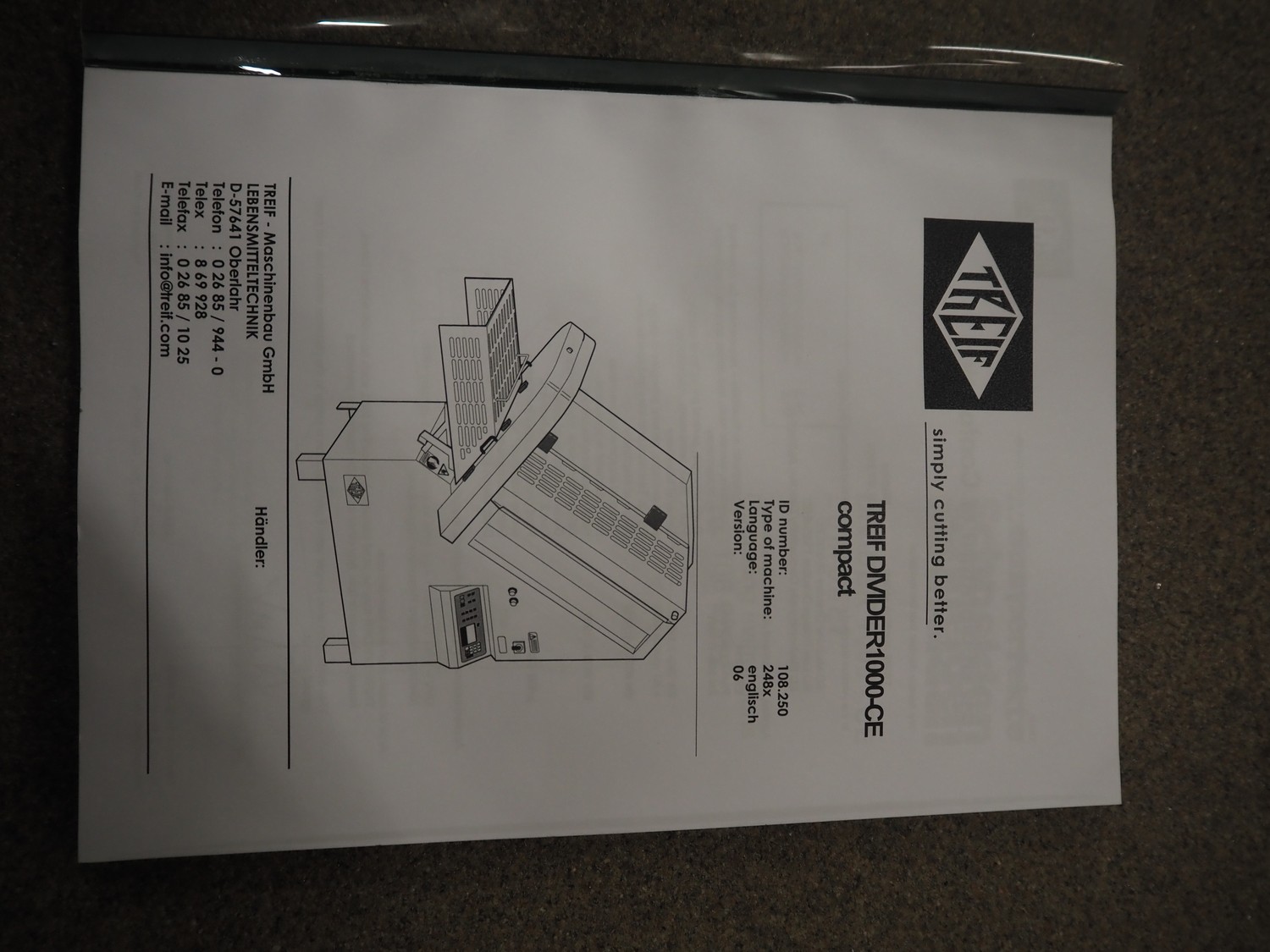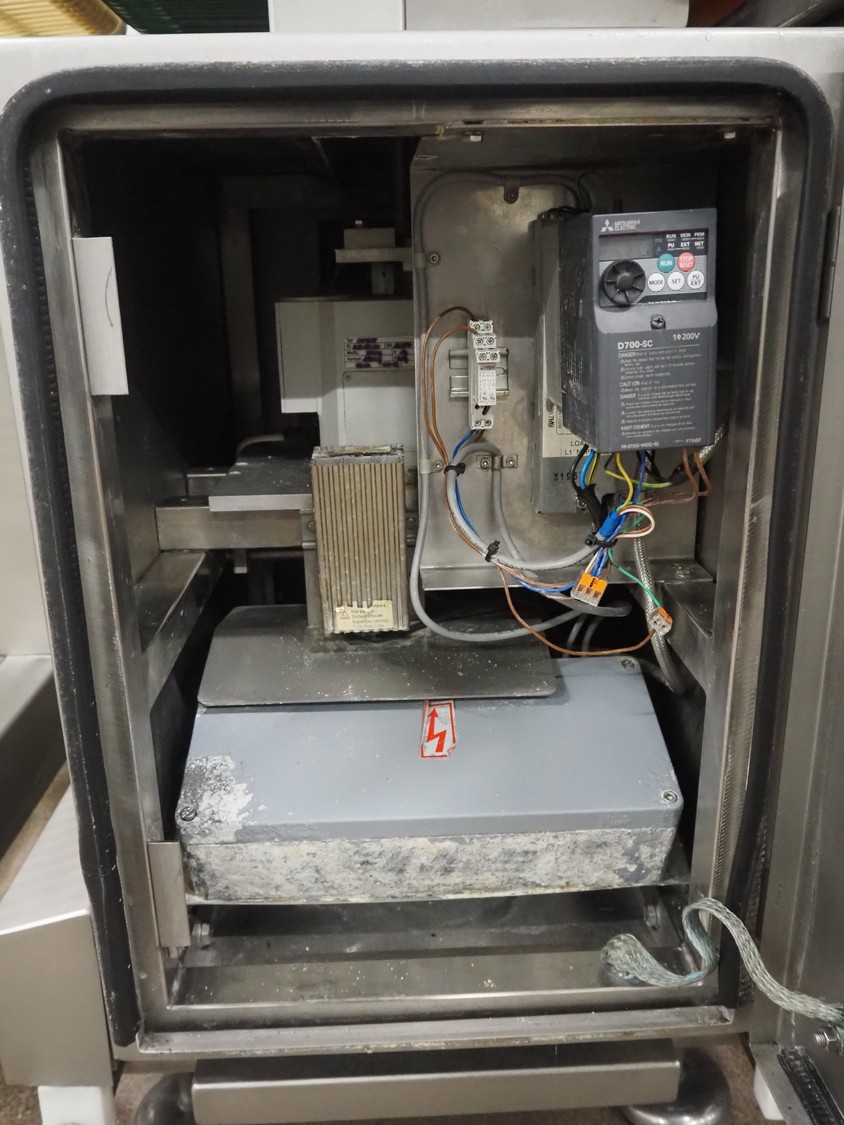 - Treif Maschinenbau GmbH slicer, model: Divider 1000-CE C, machine number: 2480S7.113476.4576, year of construction: 2003, 400 V, 3 Ph, 50/60 Hz, 13.6 A, 5.8 kW, weight: 790 kg, plastic rollers, roller width: 260 mm, clearance: 280 mm x 170 mm, plastic outfeed belt, belt width: 400 mm, total dimensions slicer: 2200 mm x 1000 mm x 2200 mm;