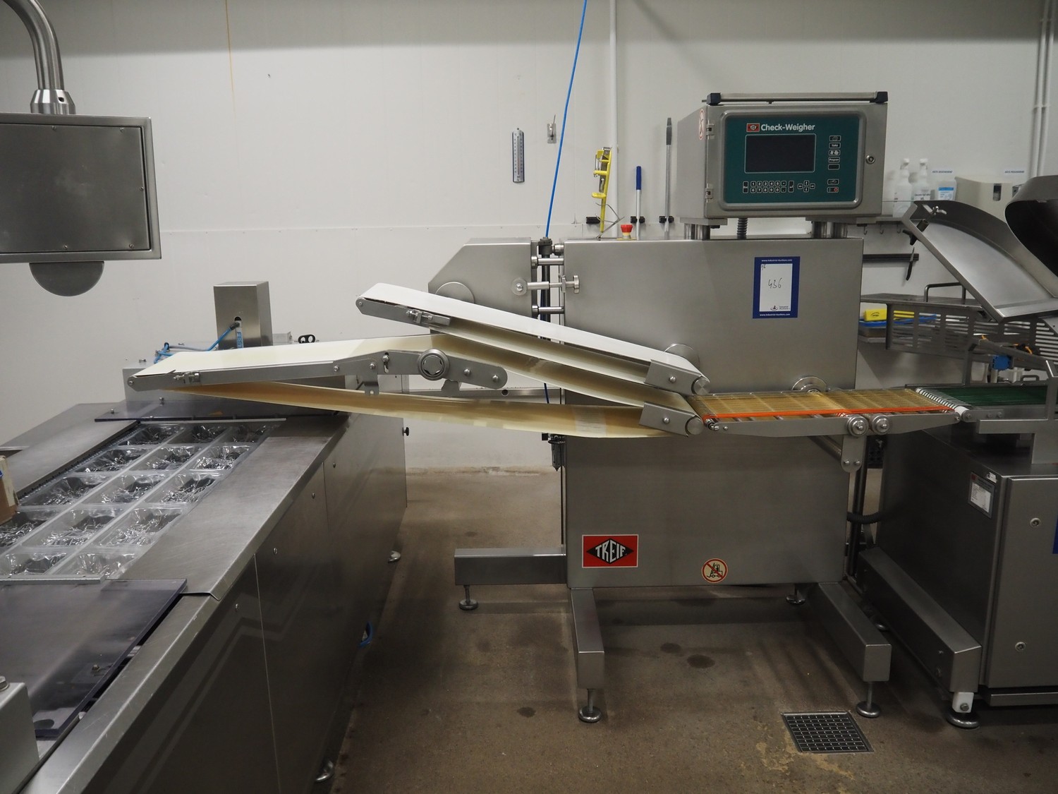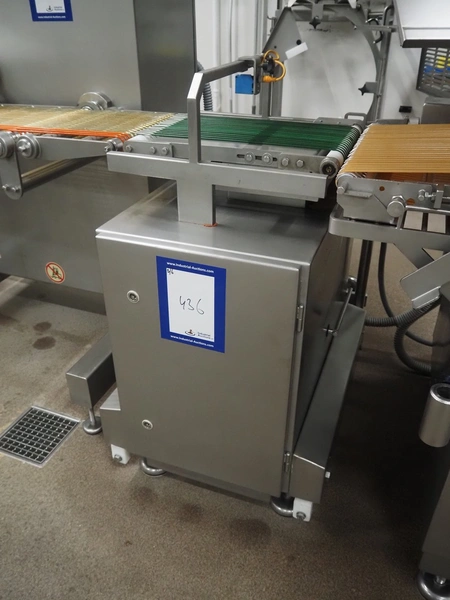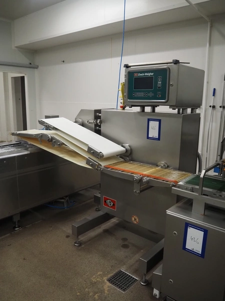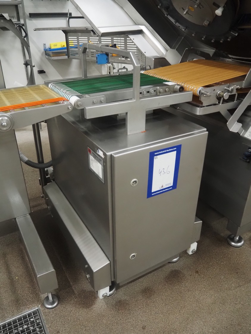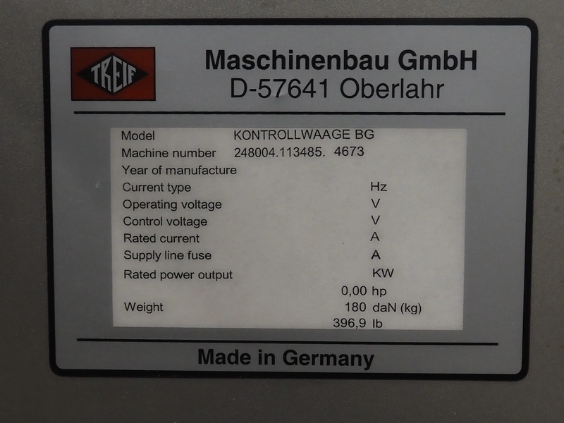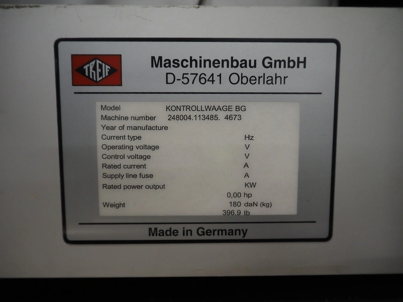 - Treif Maschinenbau GmbH checkweigher, model: KONTROLLWAAGE BG, machine number: 248004.113485.4673, weight: 180 kg, plastic wire belt, belt width: 230 mm, total dimensions checkweigher: 620 mm x 1010 mm x 1100 mm;