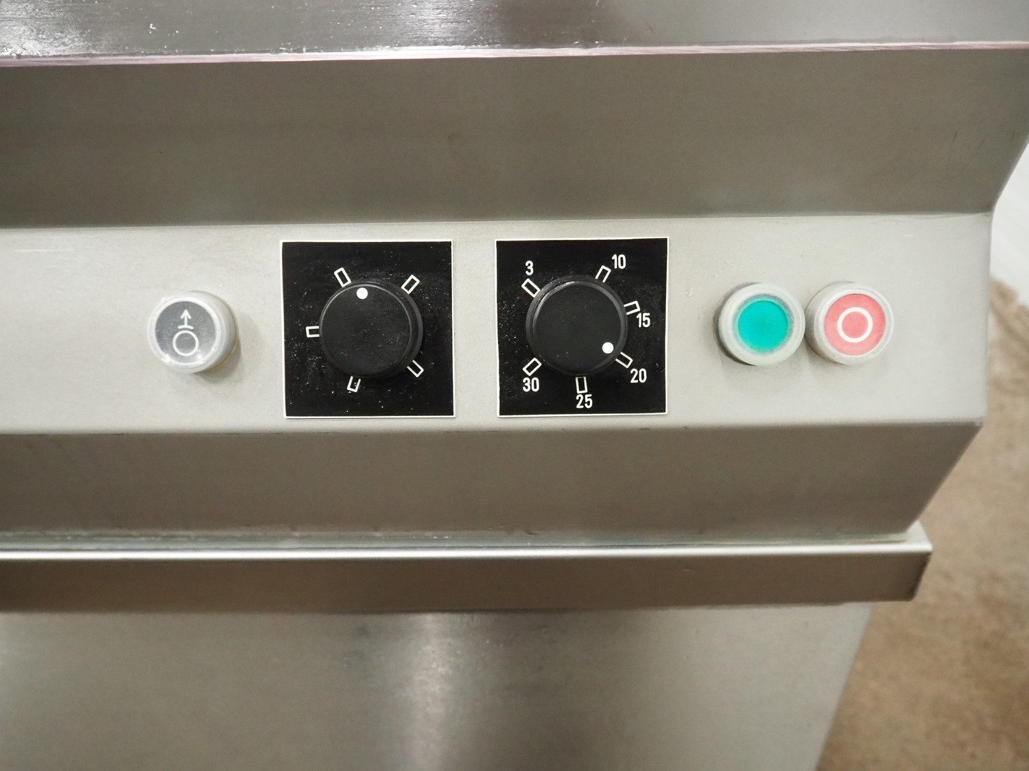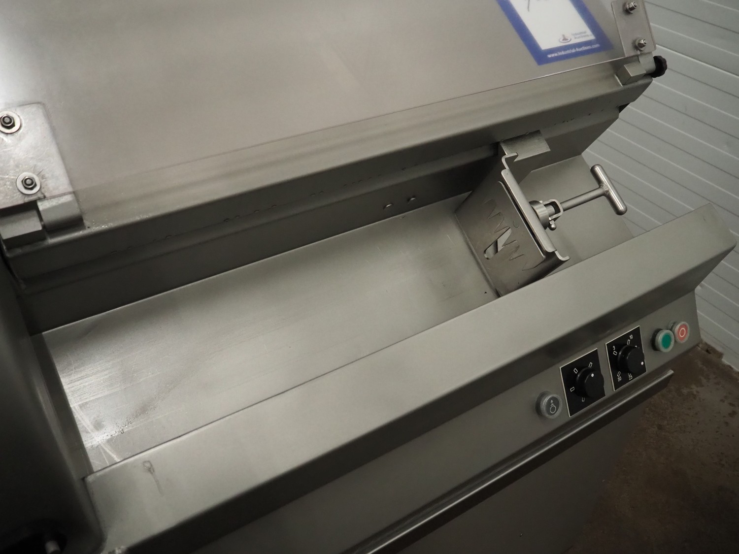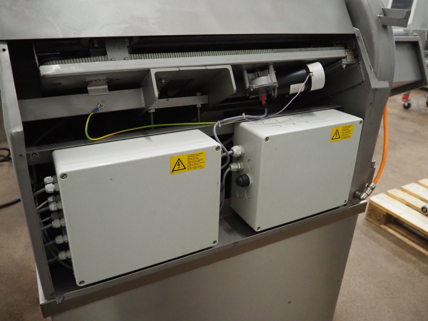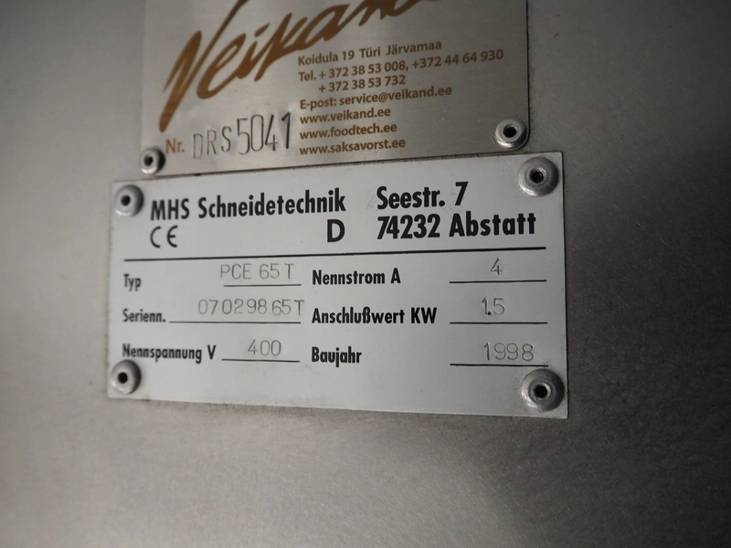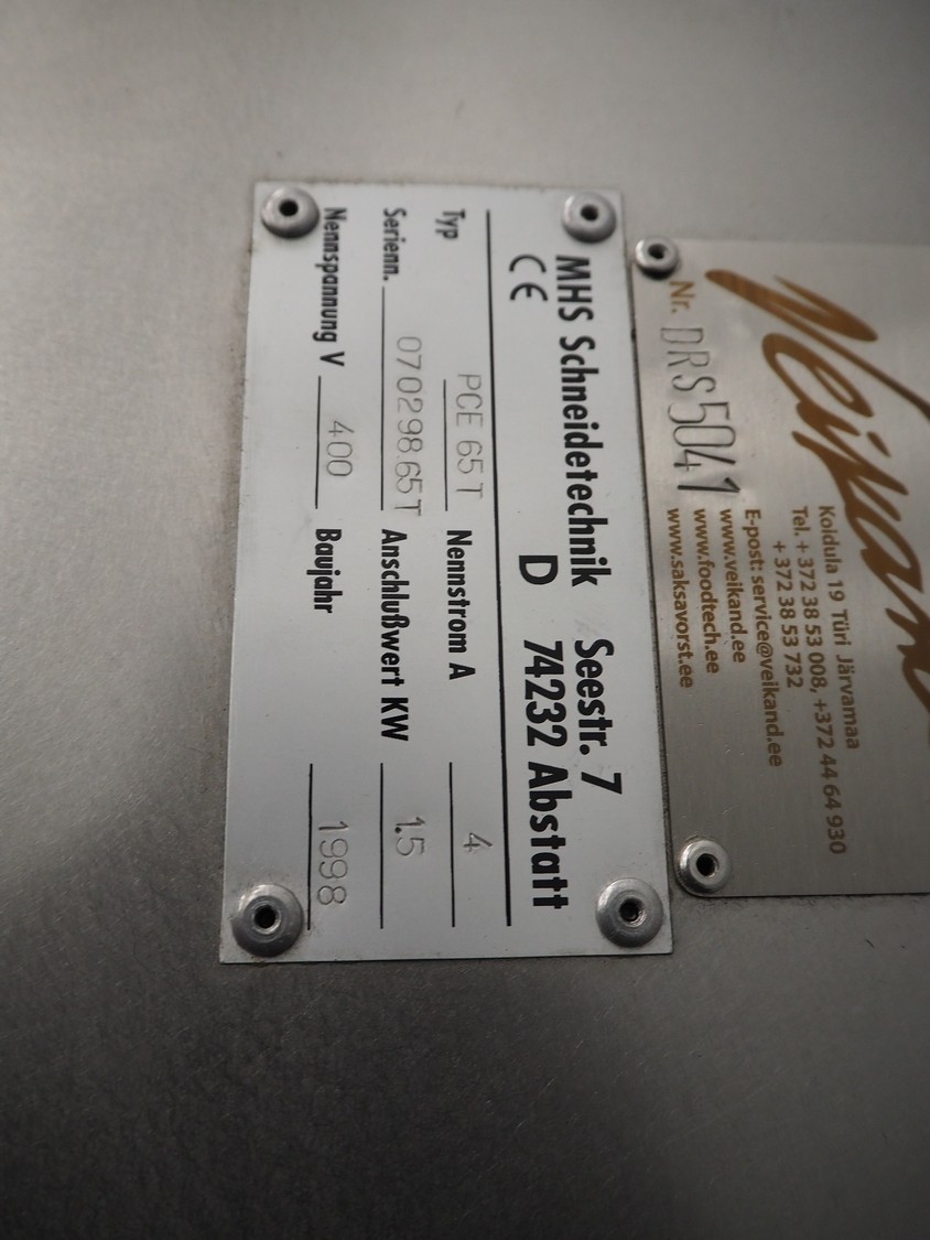 MHS Schneidetechnik slicer, type: PCE 65 T, serial number: 07029865T, year of construction: 1998, 400 V, 4 A, 1.5 kW, clearance: 180 mm x 170 mm, total dimensions: 1550 mm x 700 mm x 1320 mm.