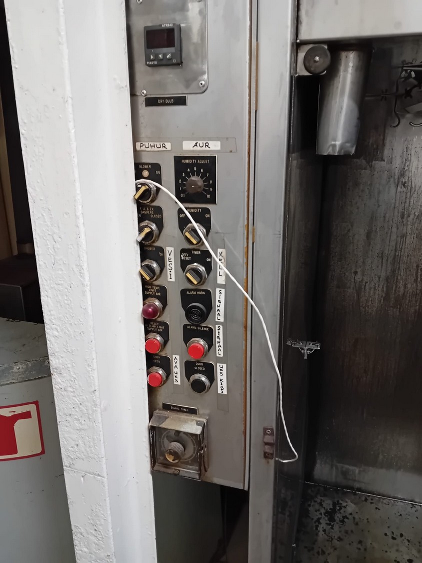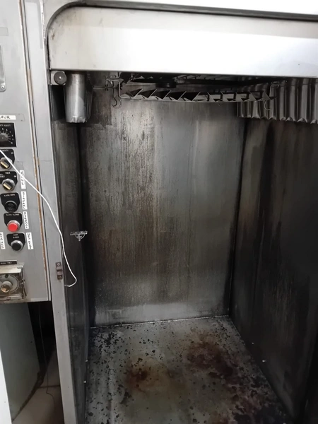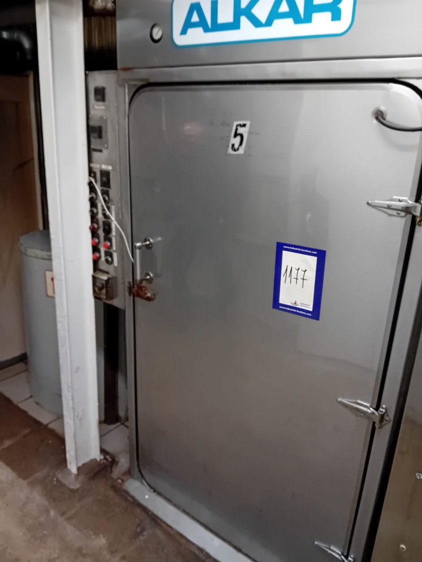 Alkar smoking chamber for 1 trolley, dimensions trolley: 900 mm x 830 mm x 1500 mm, total dimensions: 1300 mm x 1200 mm x 2300 mm.