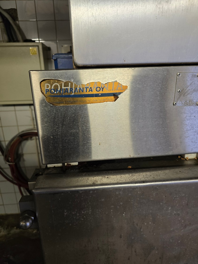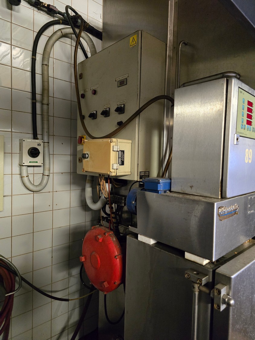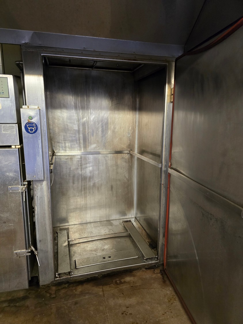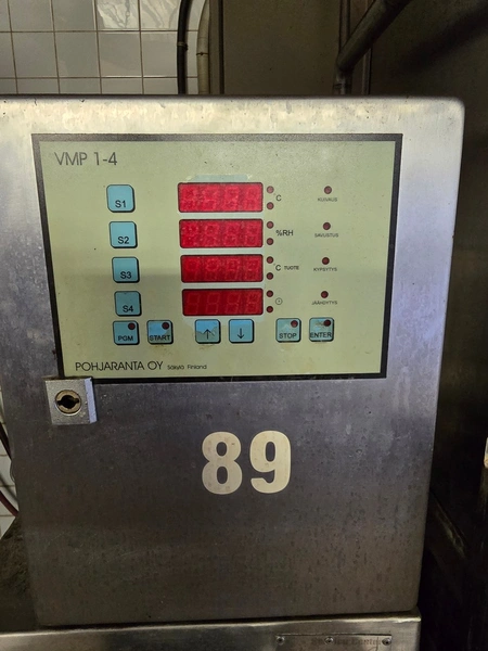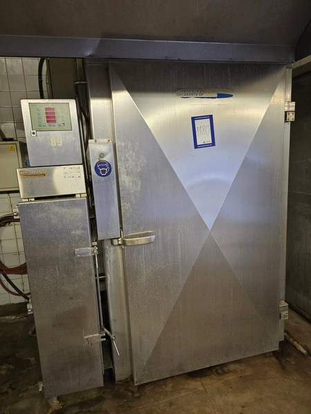 POHJARANTA OY smoke chamber for 1 trolley, inside dimensions: 1050 mm x 1000 mm x 2000 mm, total dimensions: 1900 mm x 1250 mm x 2900 mm, including s/s hood, dimensions: 2150 mm x 1210 mm x 540 mm, and ventilation unit, dimensions: 500 mm x 500 mm x 500 mm.