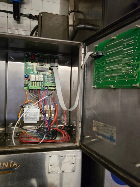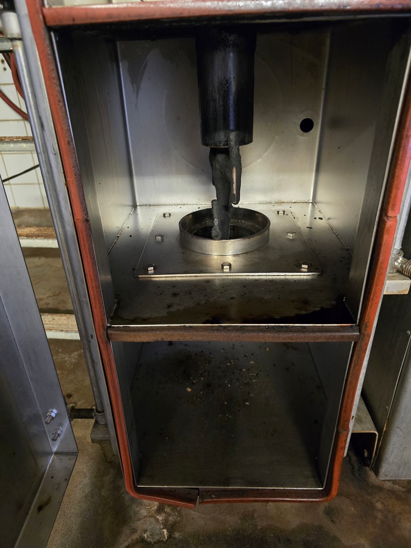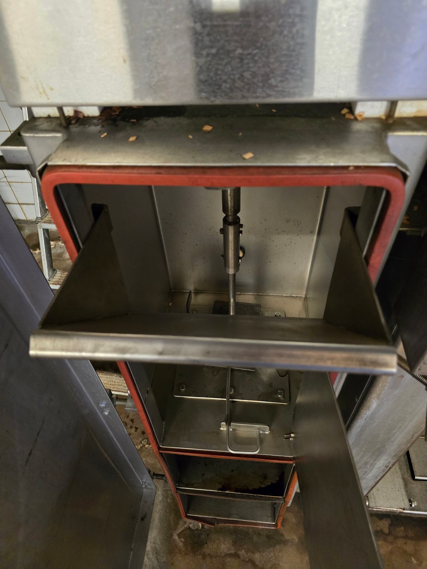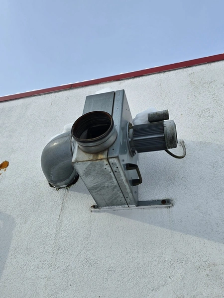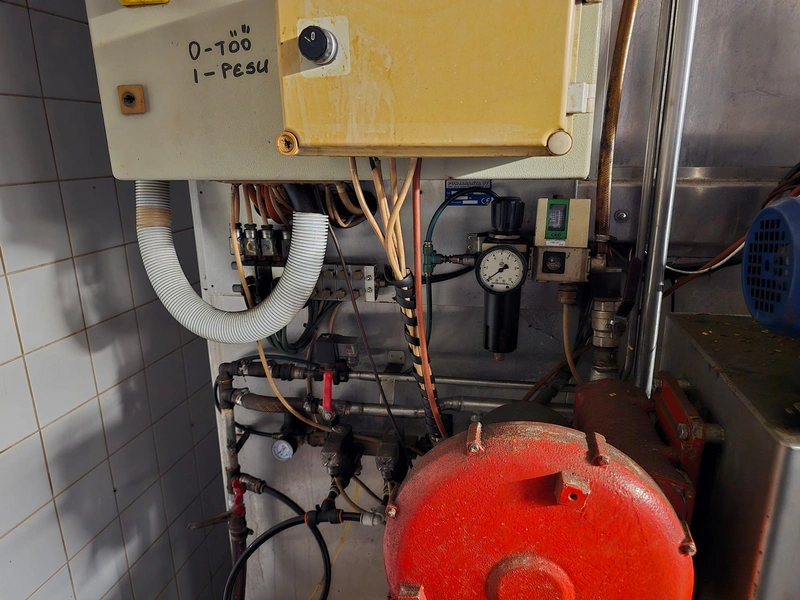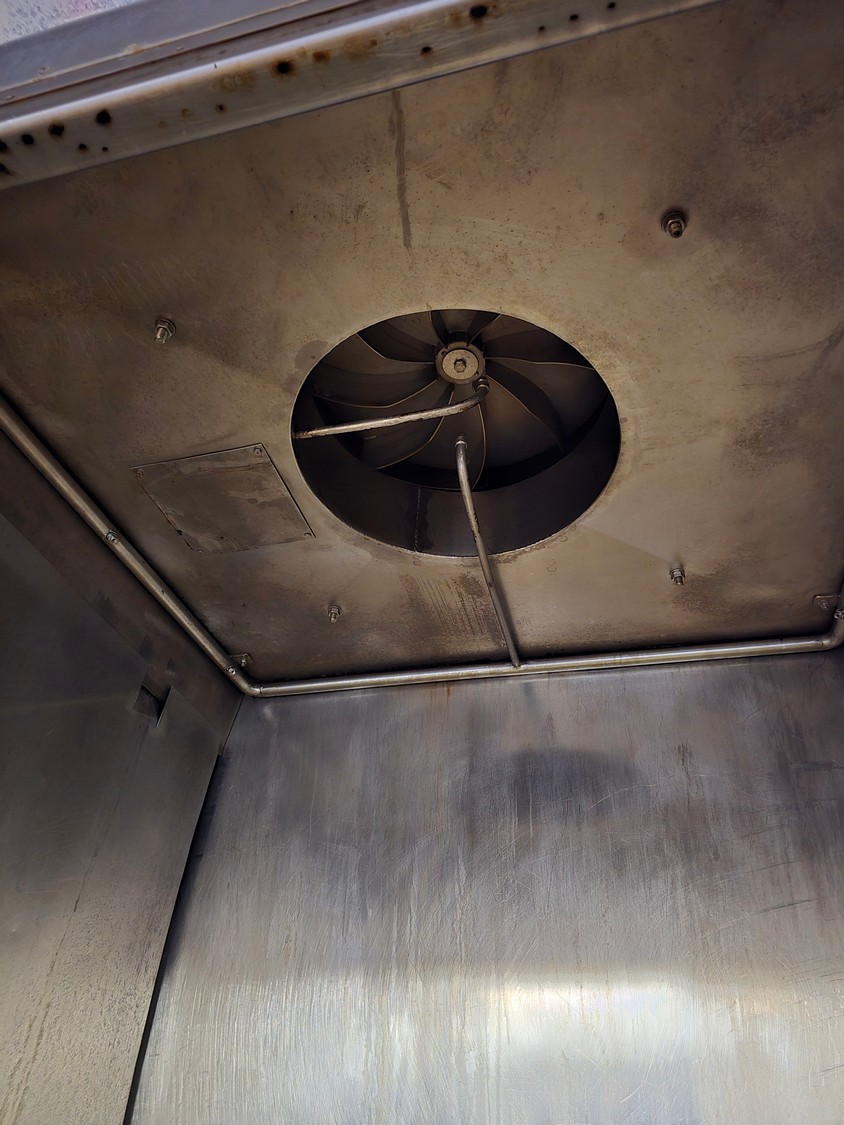 POHJARANTA OY smoke chamber for 1 trolley, inside dimensions: 1050 mm x 1000 mm x 2000 mm, total dimensions: 1900 mm x 1250 mm x 2900 mm, including s/s hood, dimensions: 2150 mm x 1210 mm x 540 mm, and ventilation unit, dimensions: 500 mm x 500 mm x 500 mm.