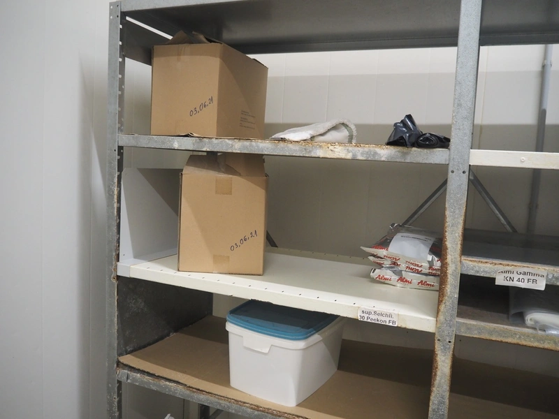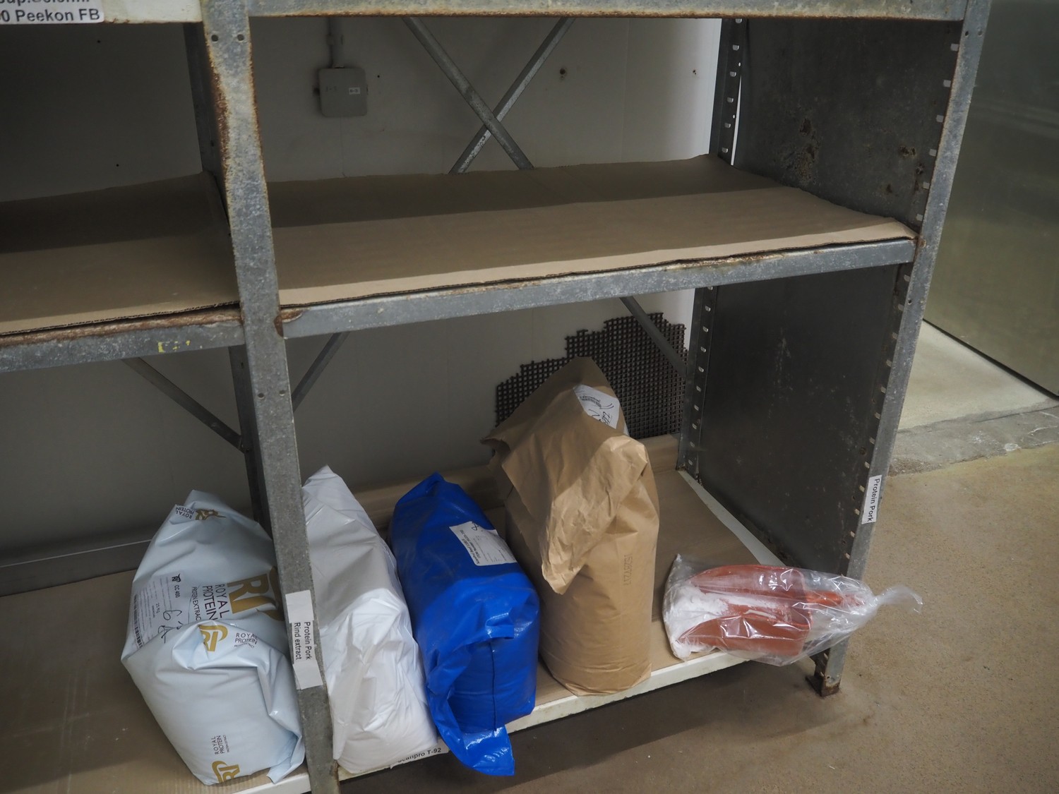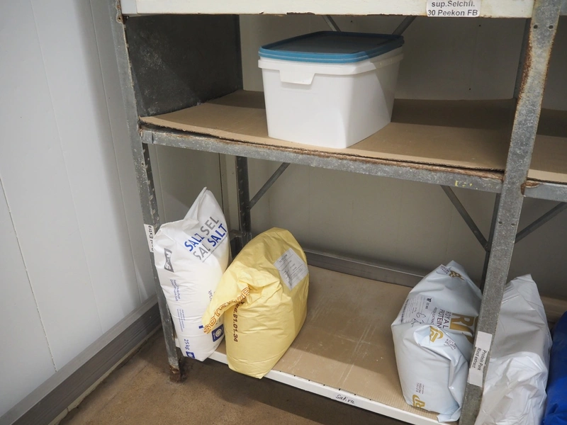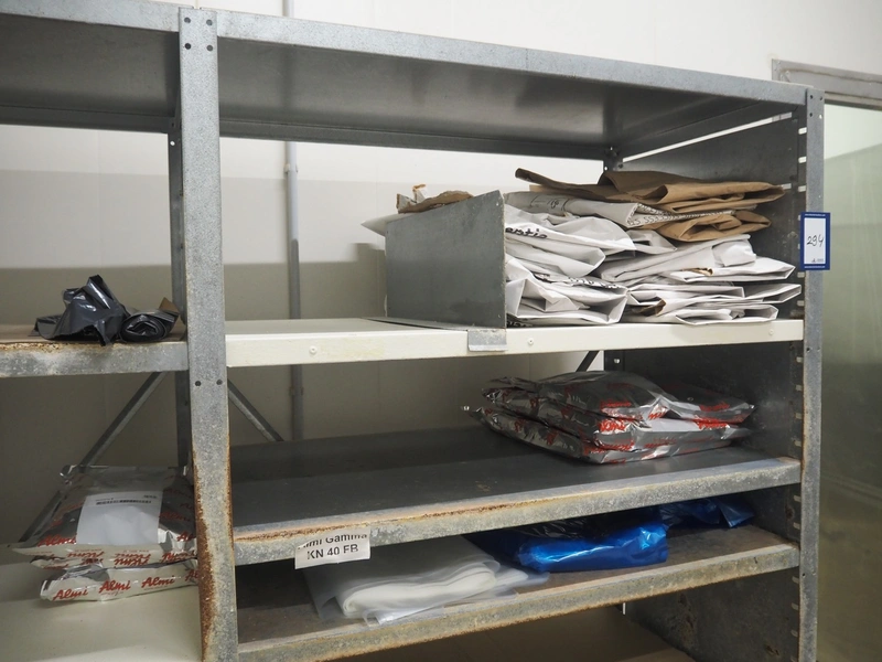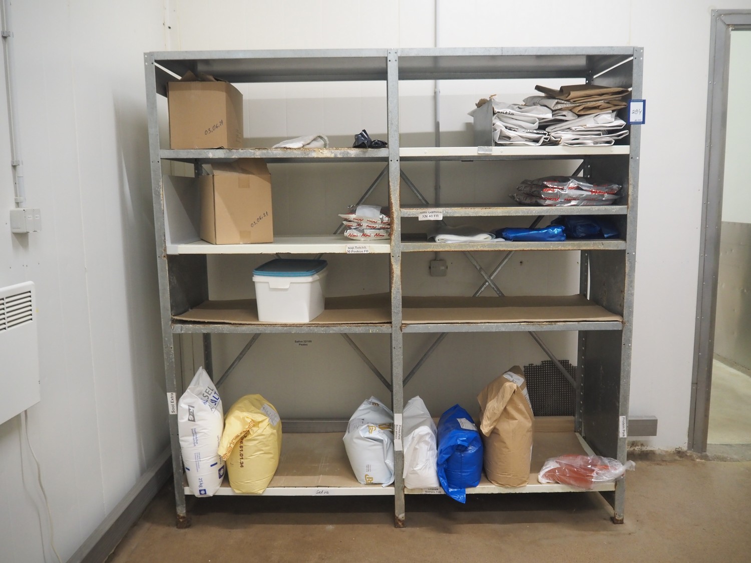 Steel rack, 4 floors, dimensions: 2040 mm x 600 mm x 2100 mm. Including content, among others: salt and various spices.