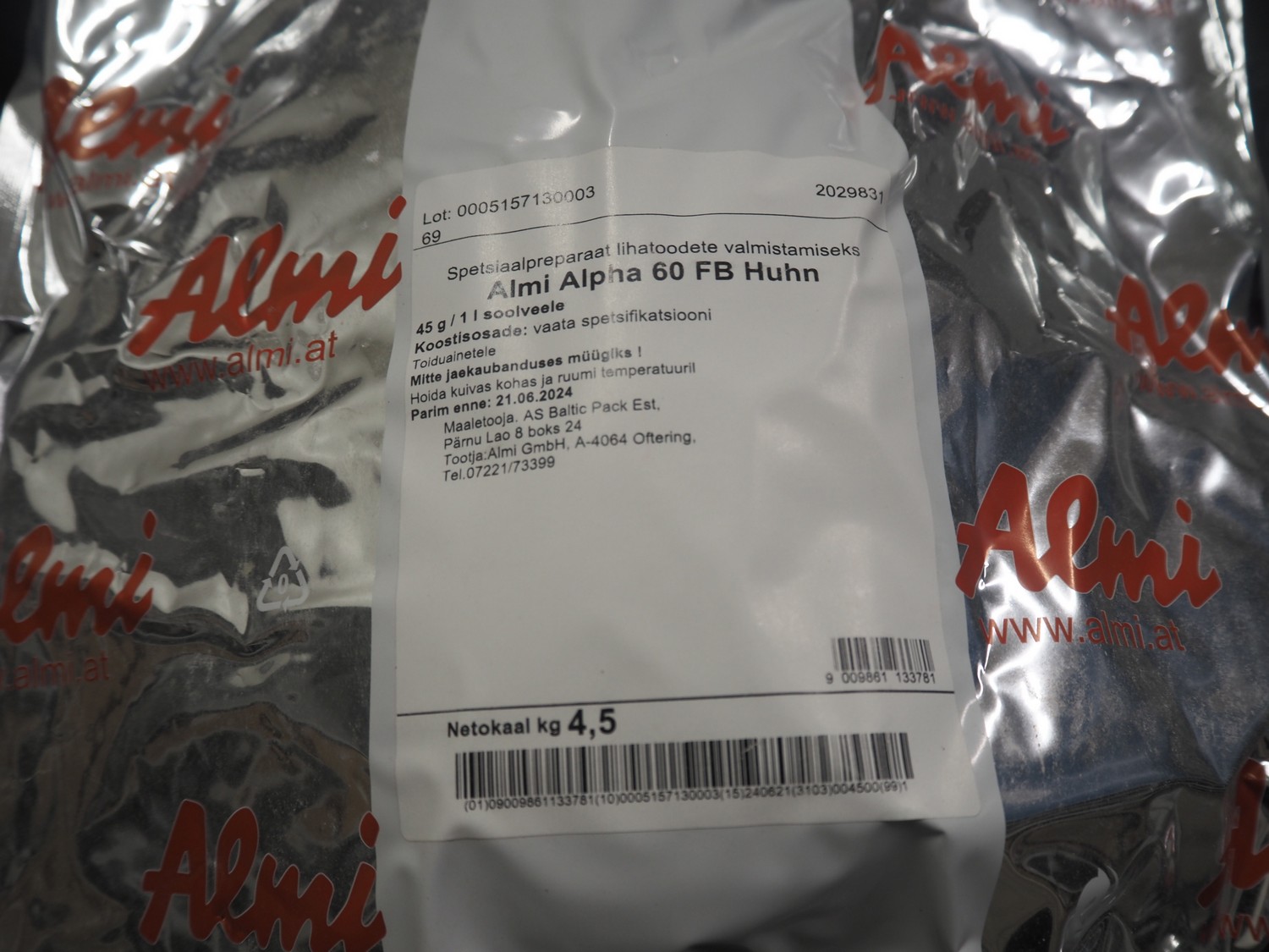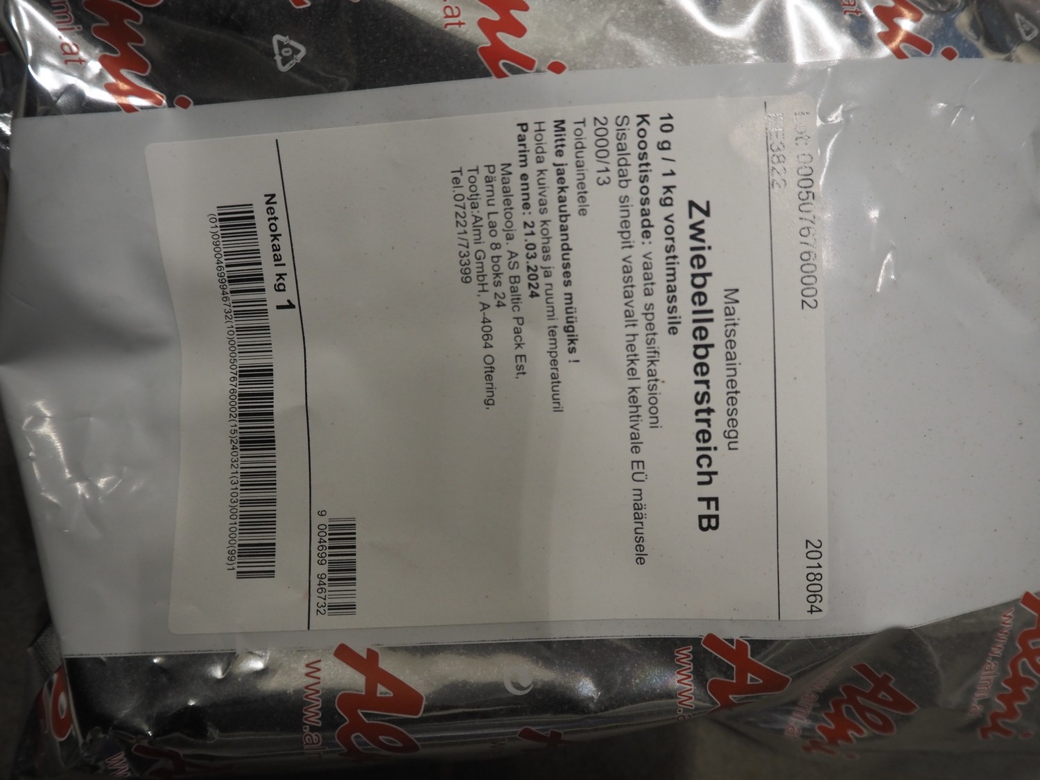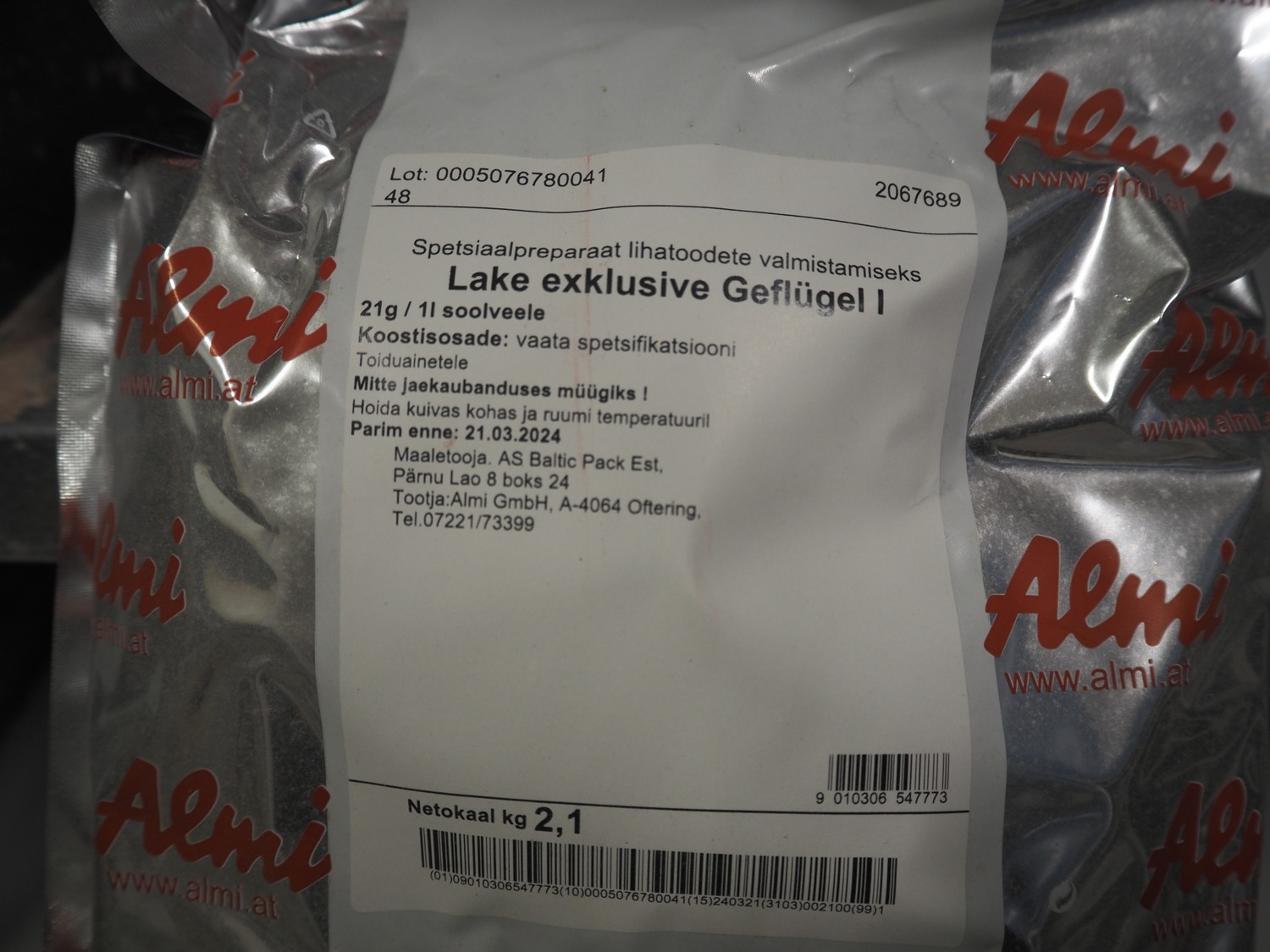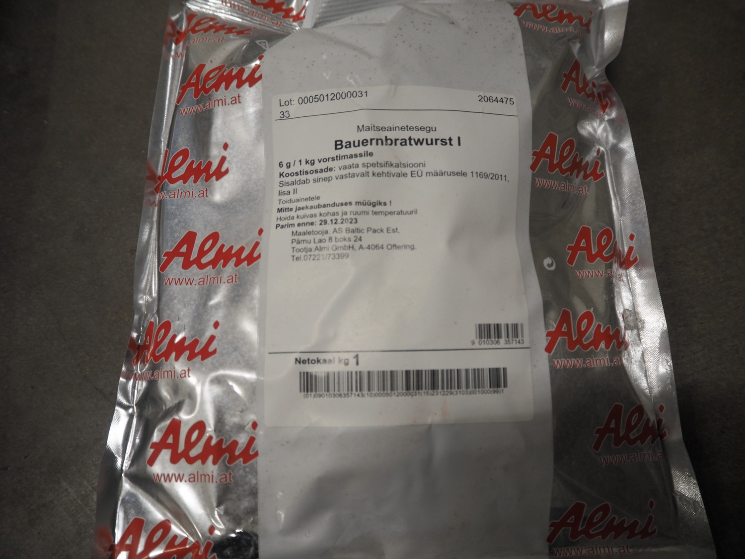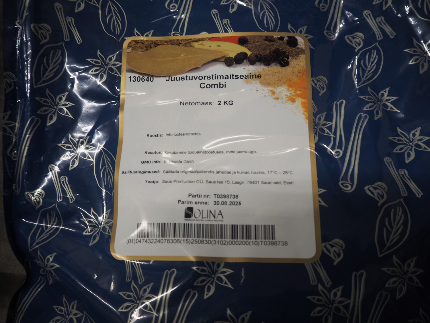 4 racks with large amount of spices, among others: Tarimix cooked salami, Bauernbratwurst I, Chinese Chili&Garlic, Juustuvorstimaiseanie Combi, Lihatarrendimaitseaine, Rohfit Hauswürstl OG, Mailänder Salami Fein FB, Spiceblend "Doktori", Mustriga Jogurtimarinaad, mustard seed, Bierwurst Combi OG, Pfeffergriller Combi OG, Dekoor, Schaschlik Combi, dimensions racks: 3040 mm x 600 mm x 2100 mm, 3100 mm x 600 mm x 2100 mm, 4050 mm x 600 mm x 2100 mm and 2040 mm x 600 mm x 2100 mm.