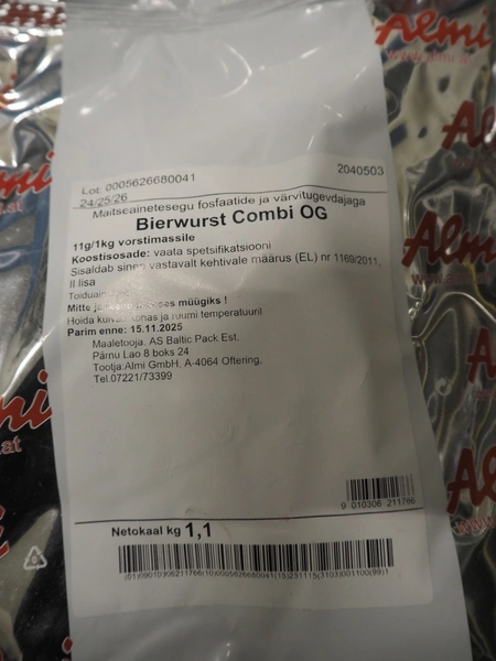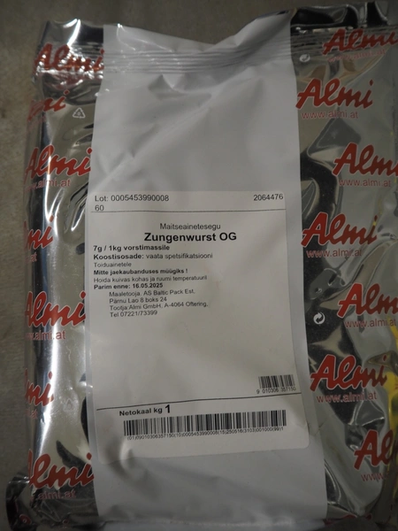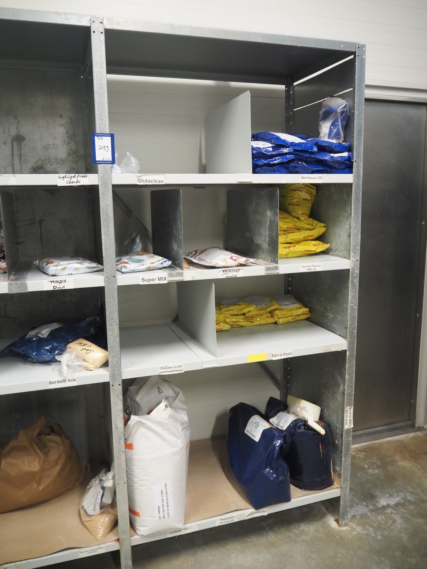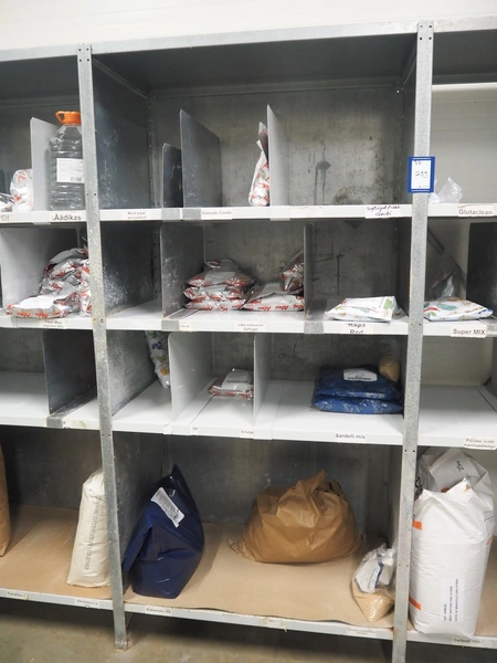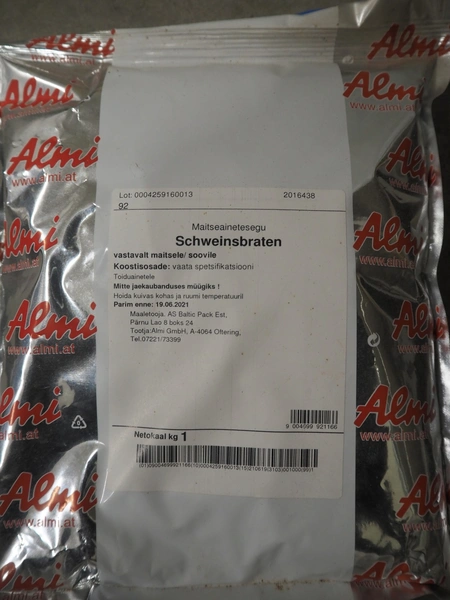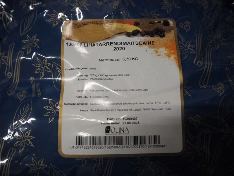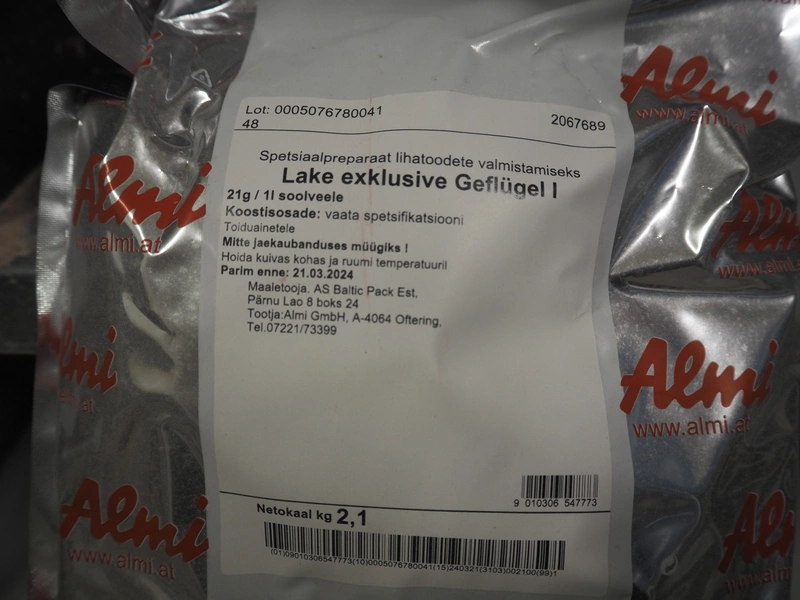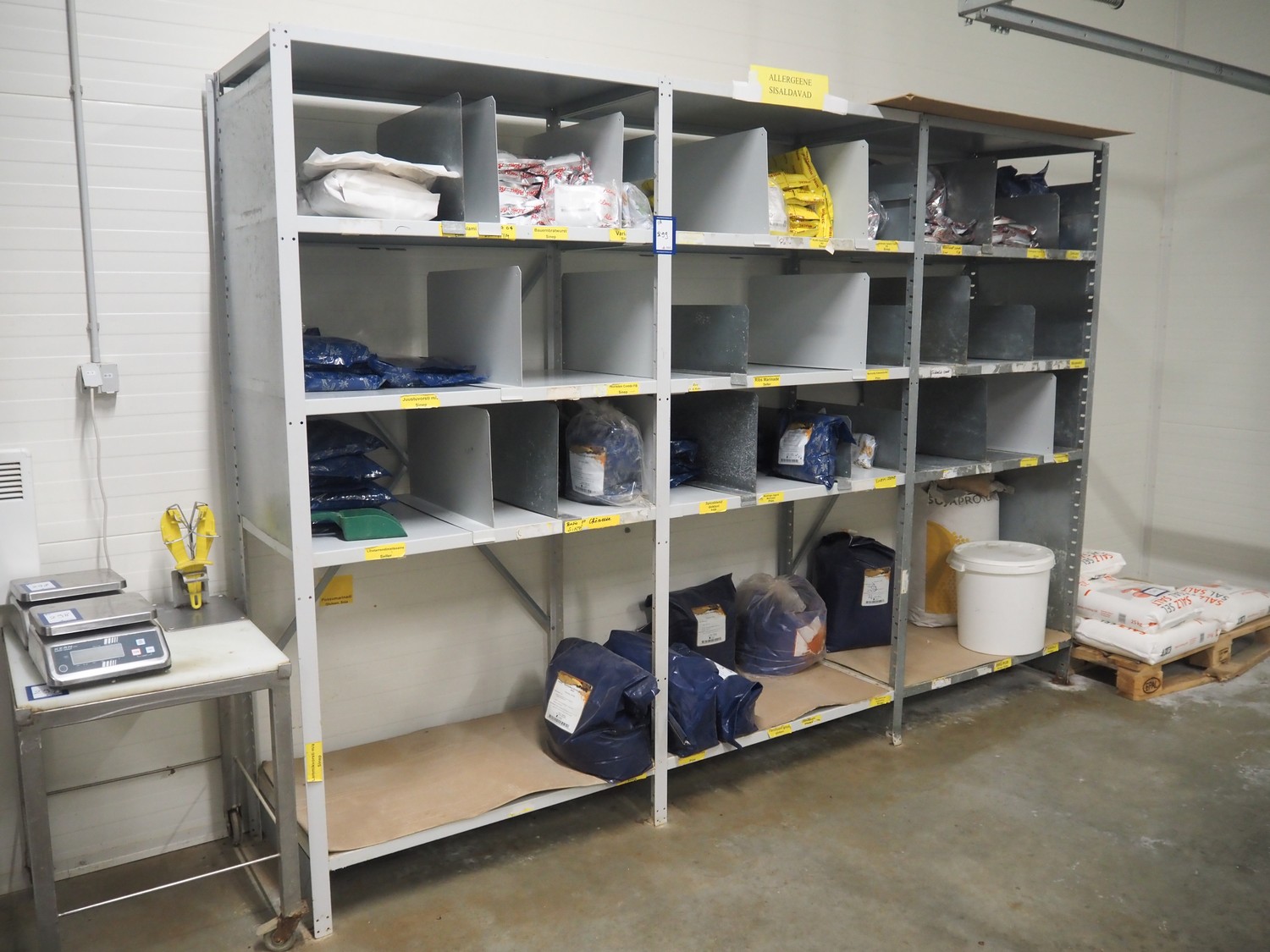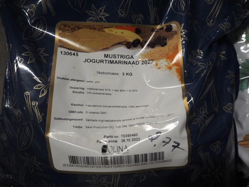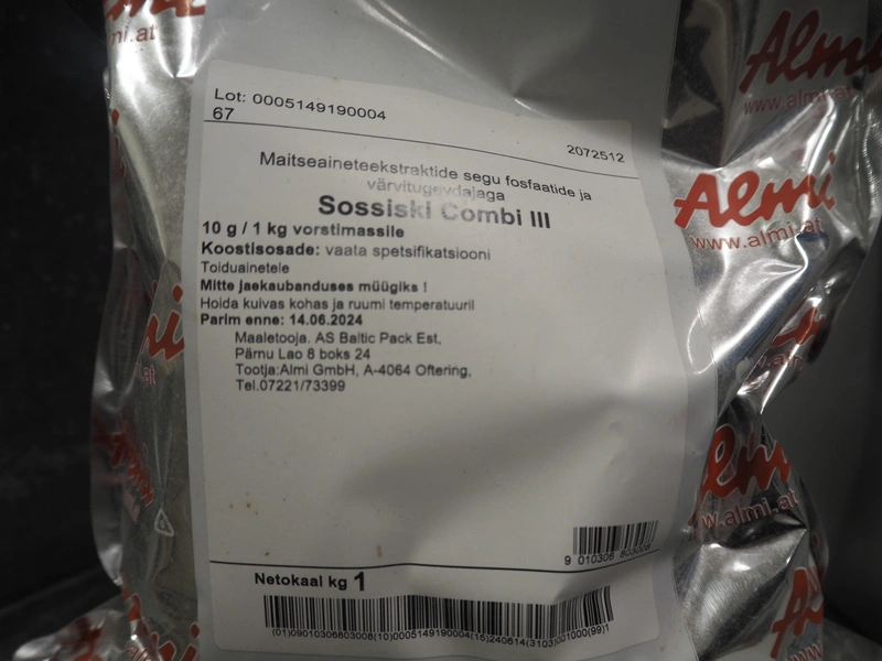 4 racks with large amount of spices, among others: Tarimix cooked salami, Bauernbratwurst I, Chinese Chili&Garlic, Juustuvorstimaiseanie Combi, Lihatarrendimaitseaine, Rohfit Hauswürstl OG, Mailänder Salami Fein FB, Spiceblend "Doktori", Mustriga Jogurtimarinaad, mustard seed, Bierwurst Combi OG, Pfeffergriller Combi OG, Dekoor, Schaschlik Combi, dimensions racks: 3040 mm x 600 mm x 2100 mm, 3100 mm x 600 mm x 2100 mm, 4050 mm x 600 mm x 2100 mm and 2040 mm x 600 mm x 2100 mm.
