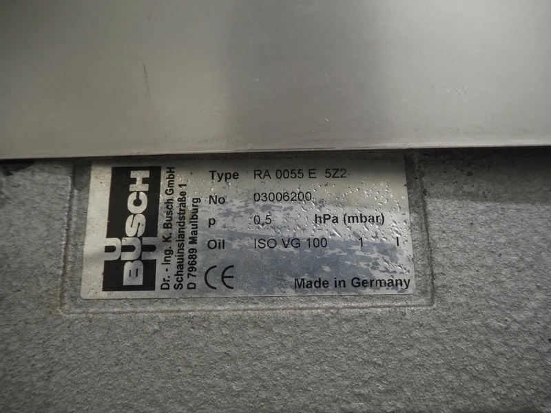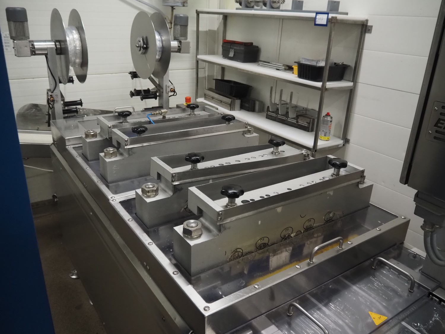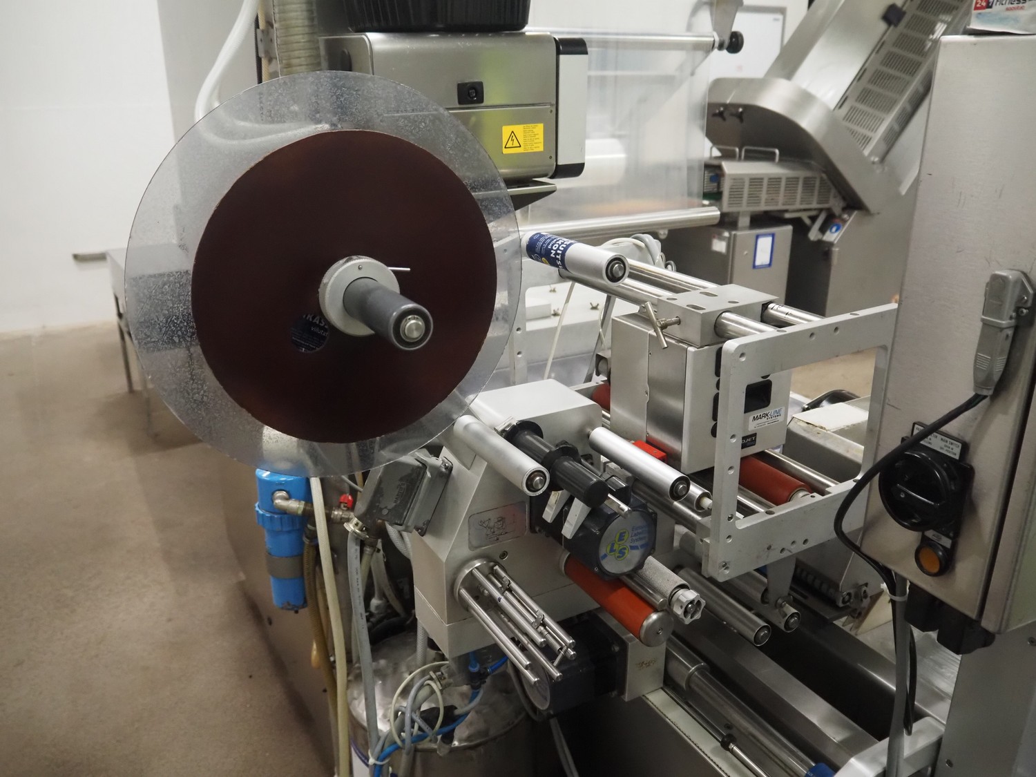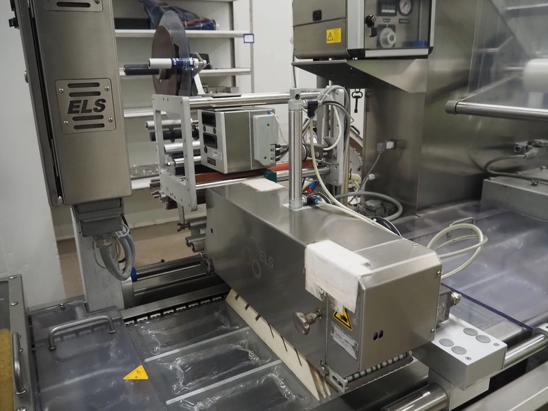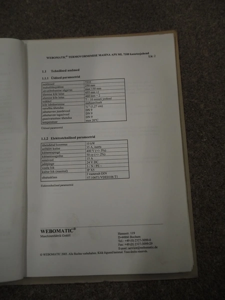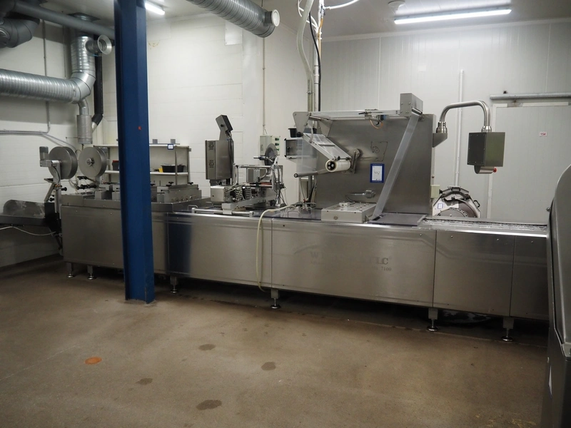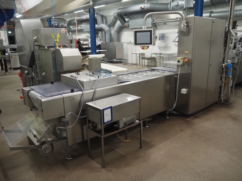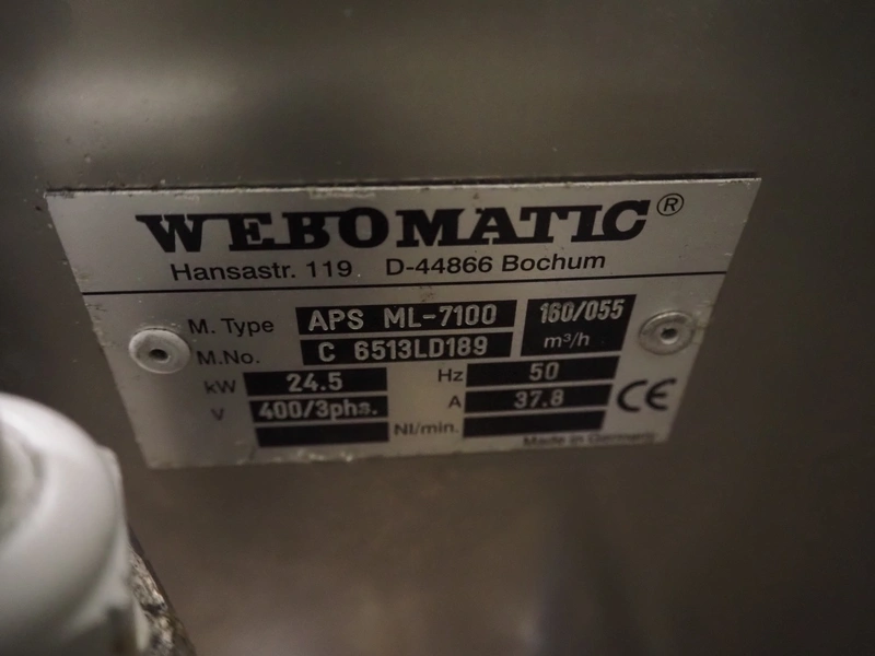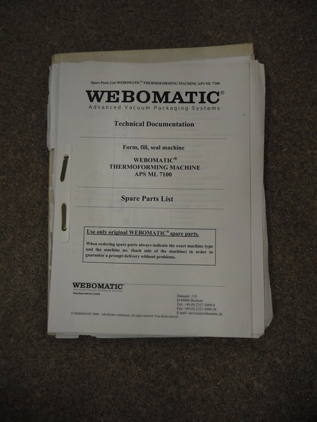 Webomatic thermoformer, type: APS ML-7100, serial number: C 6513LD189, 400 V, 3 Ph, 50 Hz, 37.8 A, 24.5 kW, film width: (bottom) 462 mm and (top) 456 mm, dye: (3x) 220 mm x 130 mm, ELS label unit, Witt gas mixing station, with Busch vacuum pump, plastic outfeed belt, belt width: 400 mm, total dimensions: 7350 mm x 1450 mm x 1950 mm. Including 2 s/s racks with parts, dimensions dye: (8x) Ø 95 mm, dimensions racks: 1800 mm x 400 mm x 1970 mm and 1500 mm x 300 mm x 1590 mm.