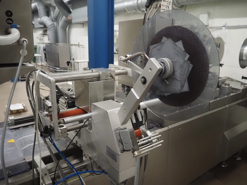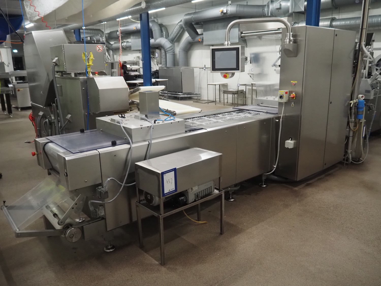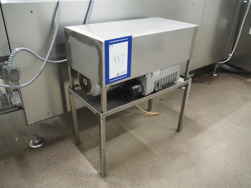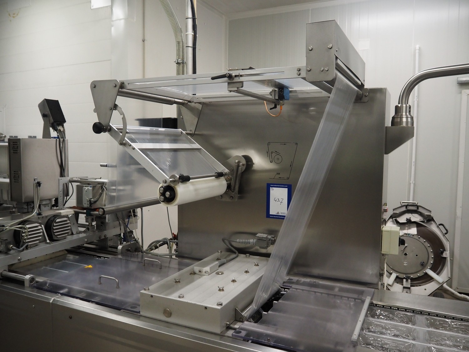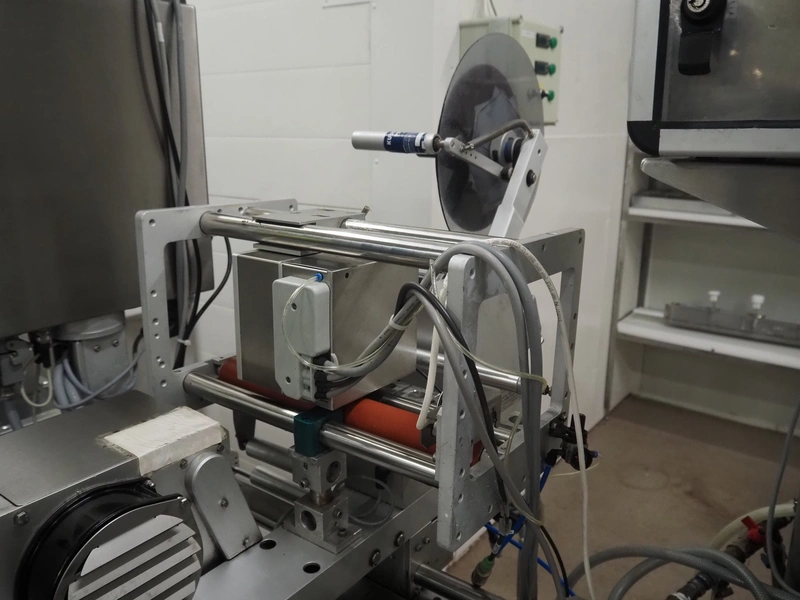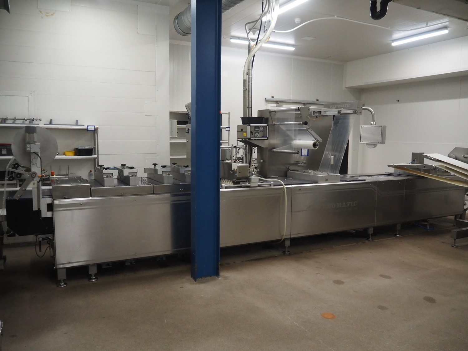 Webomatic thermoformer, type: APS ML-7100, serial number: C 6513LD189, 400 V, 3 Ph, 50 Hz, 37.8 A, 24.5 kW, film width: (bottom) 462 mm and (top) 456 mm, dye: (3x) 220 mm x 130 mm, ELS label unit, Witt gas mixing station, with Busch vacuum pump, plastic outfeed belt, belt width: 400 mm, total dimensions: 7350 mm x 1450 mm x 1950 mm. Including 2 s/s racks with parts, dimensions dye: (8x) Ø 95 mm, dimensions racks: 1800 mm x 400 mm x 1970 mm and 1500 mm x 300 mm x 1590 mm.