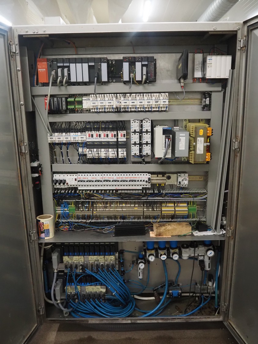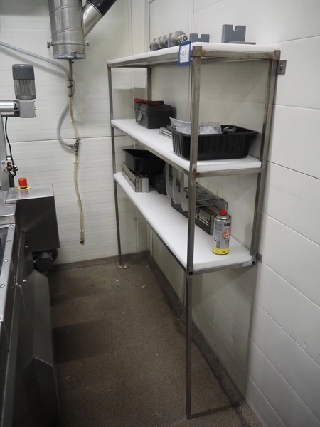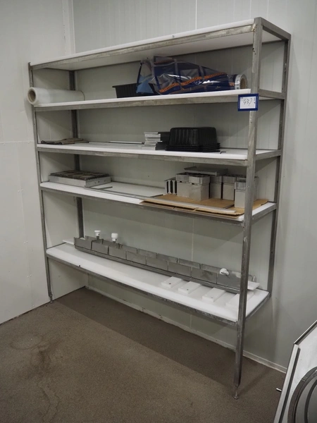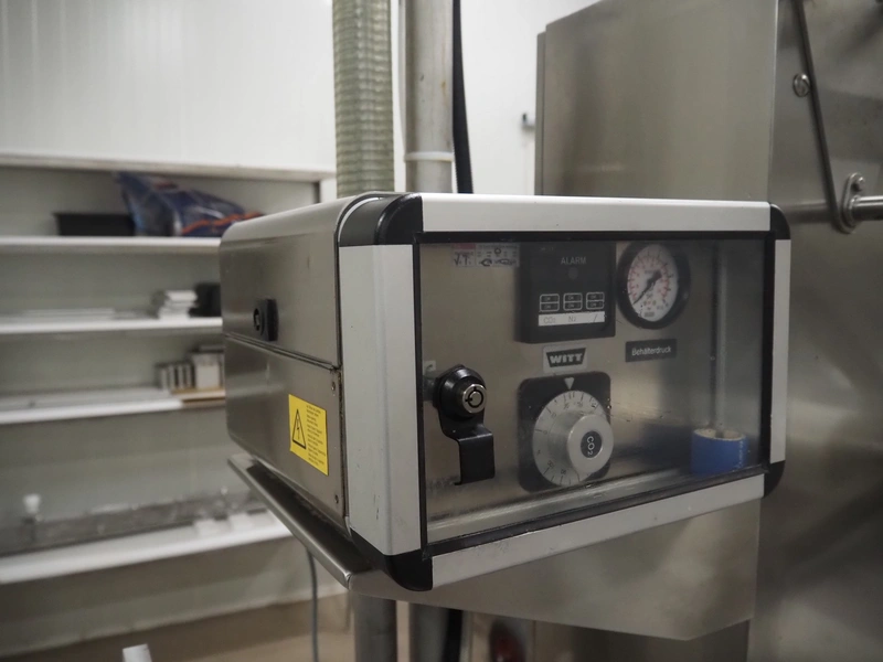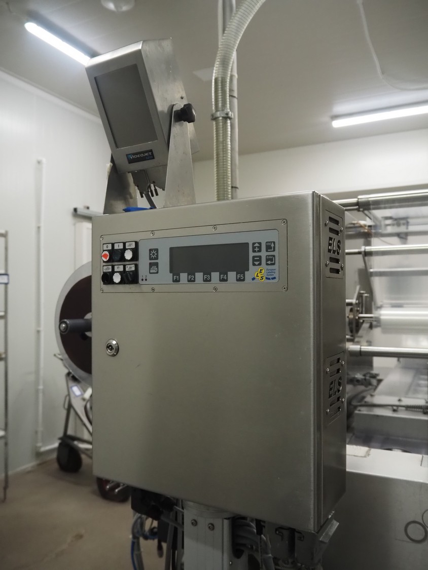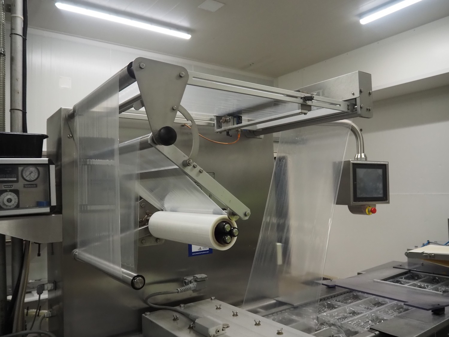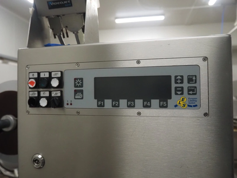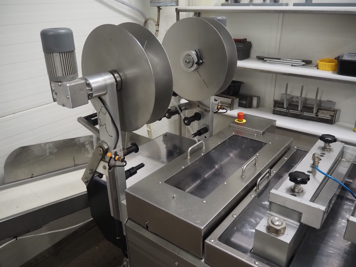 Webomatic thermoformer, type: APS ML-7100, serial number: C 6513LD189, 400 V, 3 Ph, 50 Hz, 37.8 A, 24.5 kW, film width: (bottom) 462 mm and (top) 456 mm, dye: (3x) 220 mm x 130 mm, ELS label unit, Witt gas mixing station, with Busch vacuum pump, plastic outfeed belt, belt width: 400 mm, total dimensions: 7350 mm x 1450 mm x 1950 mm. Including 2 s/s racks with parts, dimensions dye: (8x) Ø 95 mm, dimensions racks: 1800 mm x 400 mm x 1970 mm and 1500 mm x 300 mm x 1590 mm.