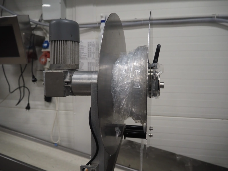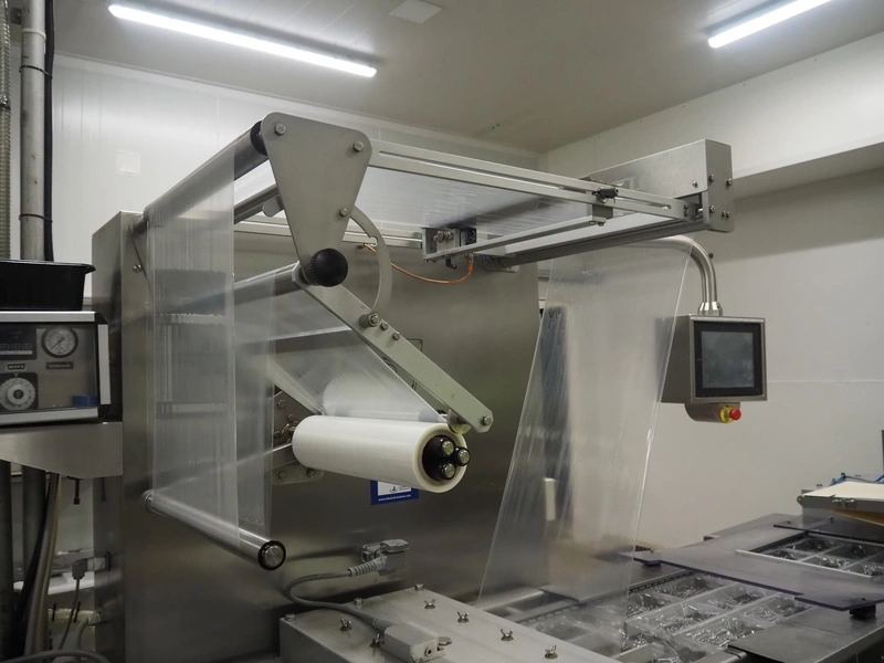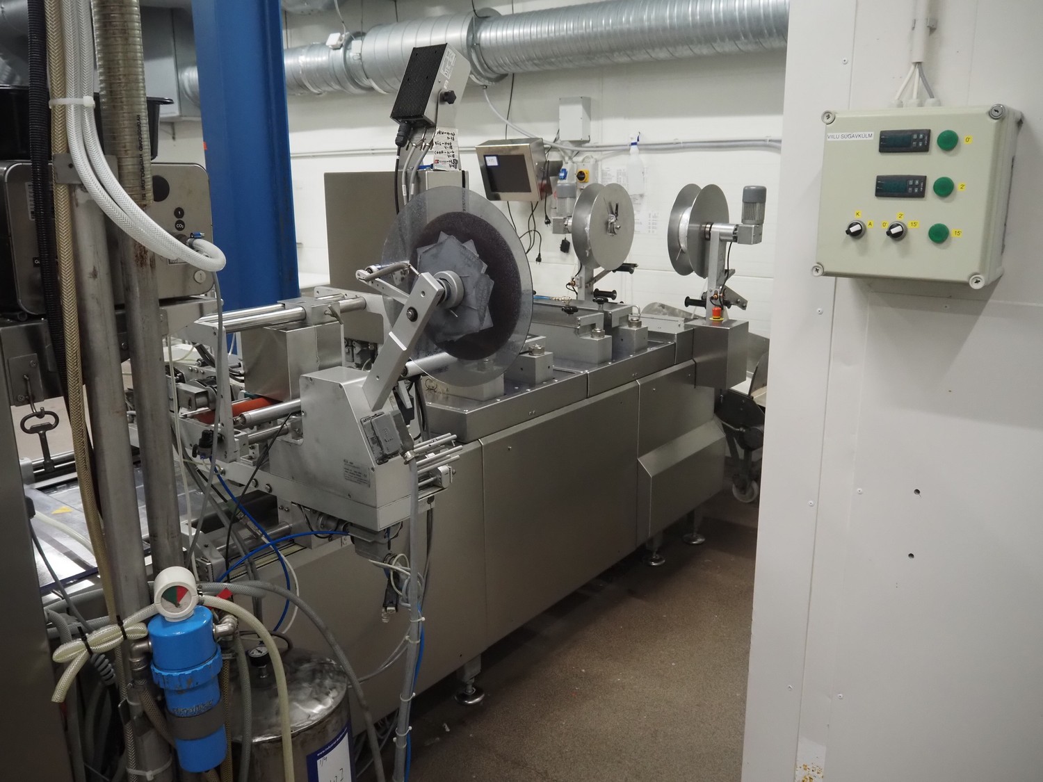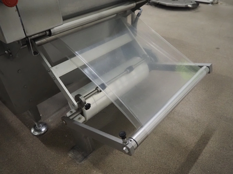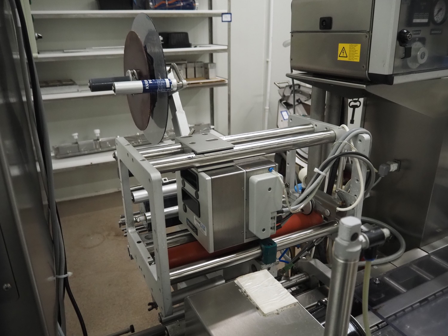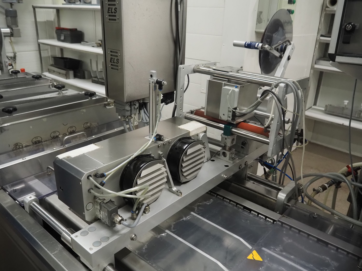 Webomatic thermoformer, type: APS ML-7100, serial number: C 6513LD189, 400 V, 3 Ph, 50 Hz, 37.8 A, 24.5 kW, film width: (bottom) 462 mm and (top) 456 mm, dye: (3x) 220 mm x 130 mm, ELS label unit, Witt gas mixing station, with Busch vacuum pump, plastic outfeed belt, belt width: 400 mm, total dimensions: 7350 mm x 1450 mm x 1950 mm. Including 2 s/s racks with parts, dimensions dye: (8x) Ø 95 mm, dimensions racks: 1800 mm x 400 mm x 1970 mm and 1500 mm x 300 mm x 1590 mm.