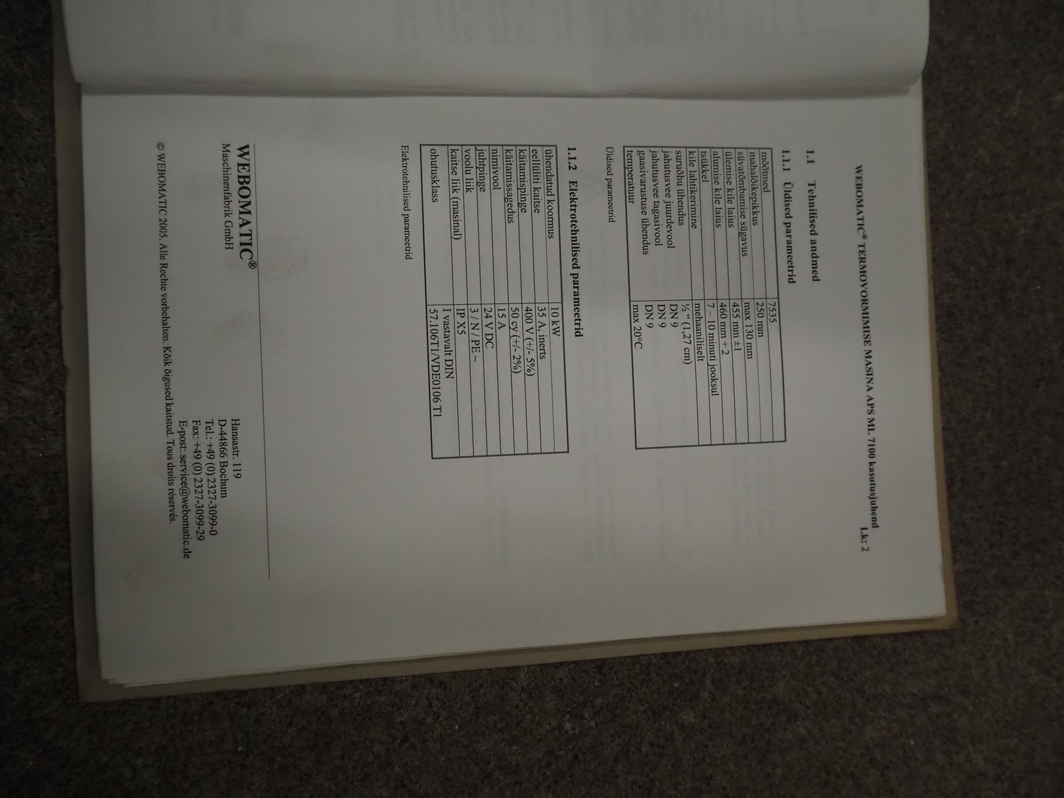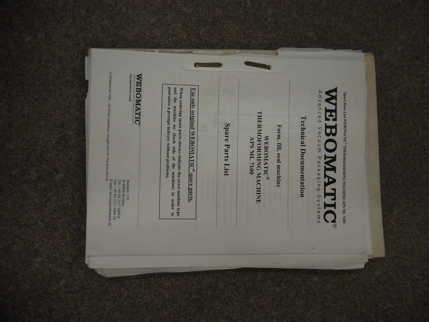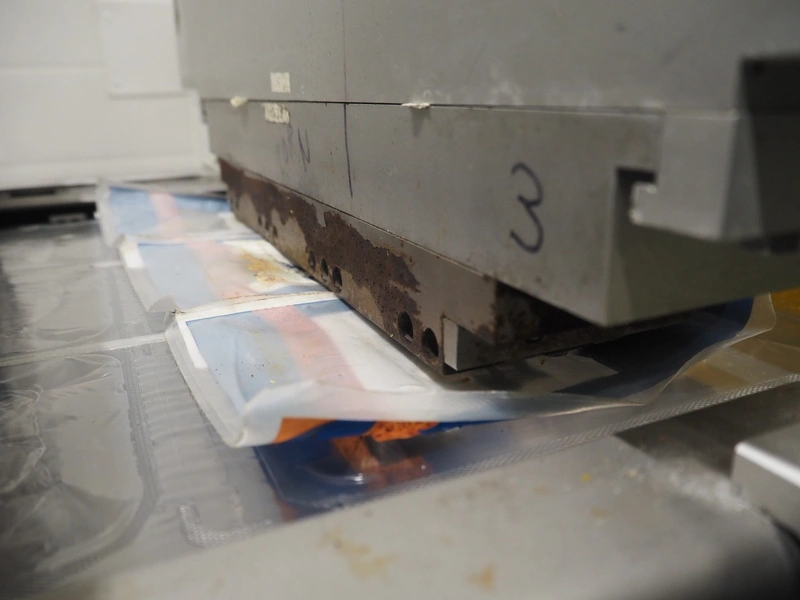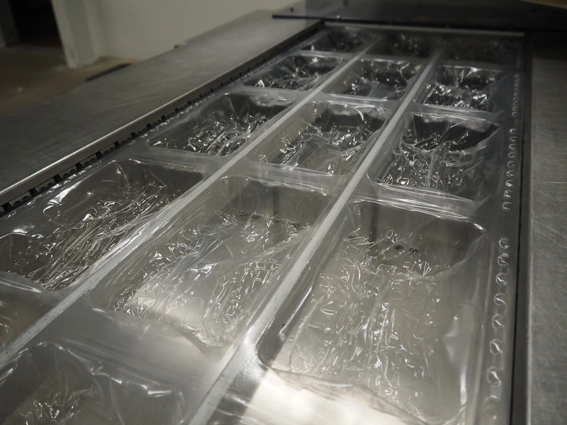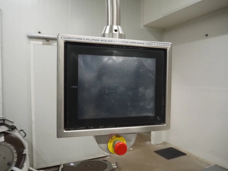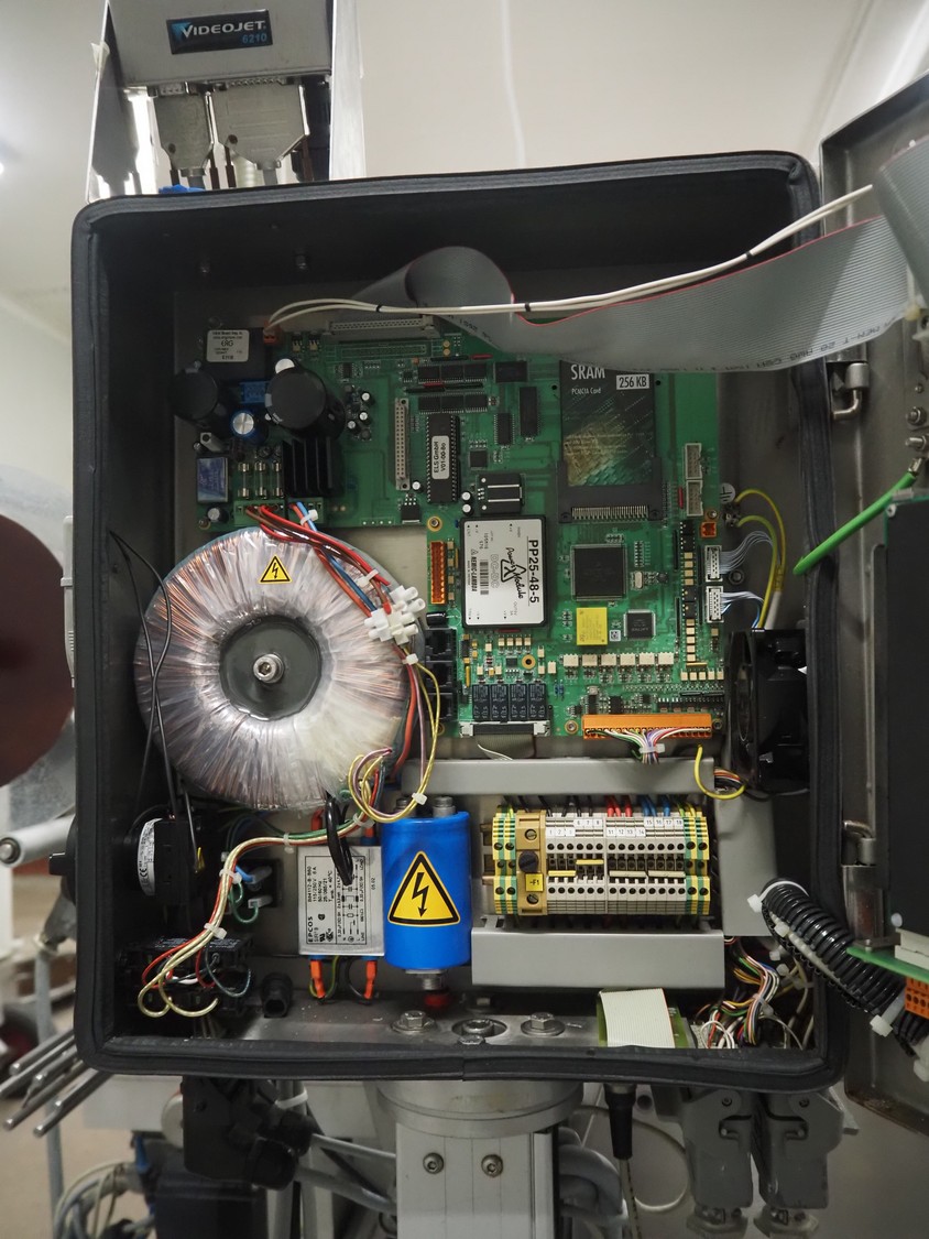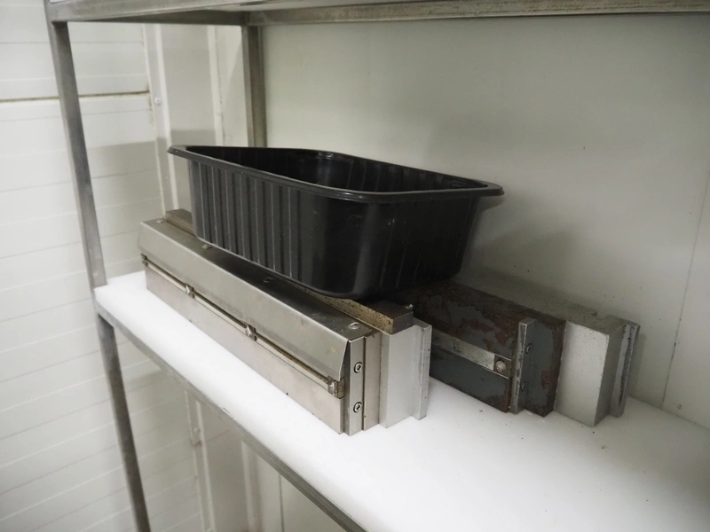 Webomatic thermoformer, type: APS ML-7100, serial number: C 6513LD189, 400 V, 3 Ph, 50 Hz, 37.8 A, 24.5 kW, film width: (bottom) 462 mm and (top) 456 mm, dye: (3x) 220 mm x 130 mm, ELS label unit, Witt gas mixing station, with Busch vacuum pump, plastic outfeed belt, belt width: 400 mm, total dimensions: 7350 mm x 1450 mm x 1950 mm. Including 2 s/s racks with parts, dimensions dye: (8x) Ø 95 mm, dimensions racks: 1800 mm x 400 mm x 1970 mm and 1500 mm x 300 mm x 1590 mm.