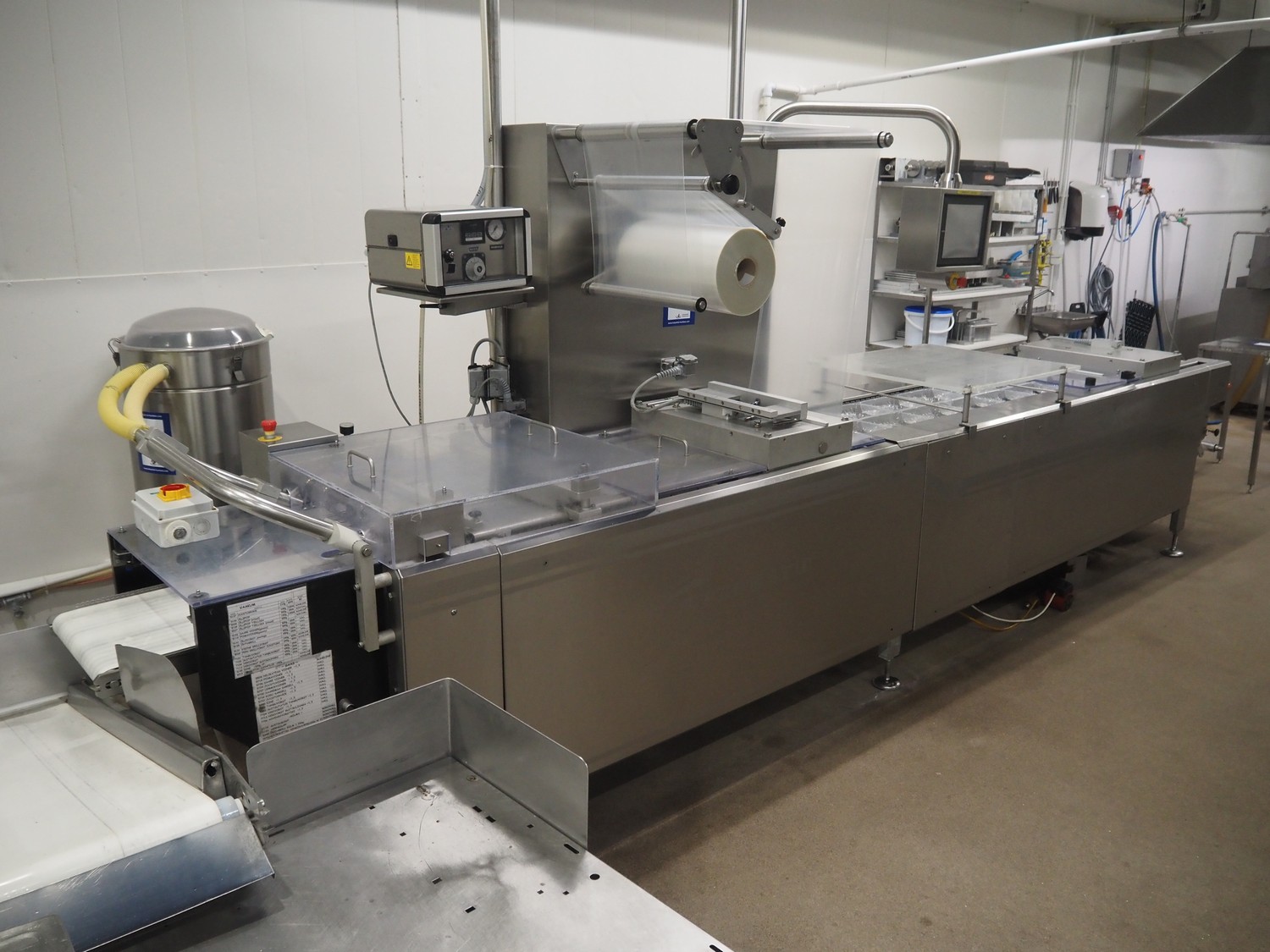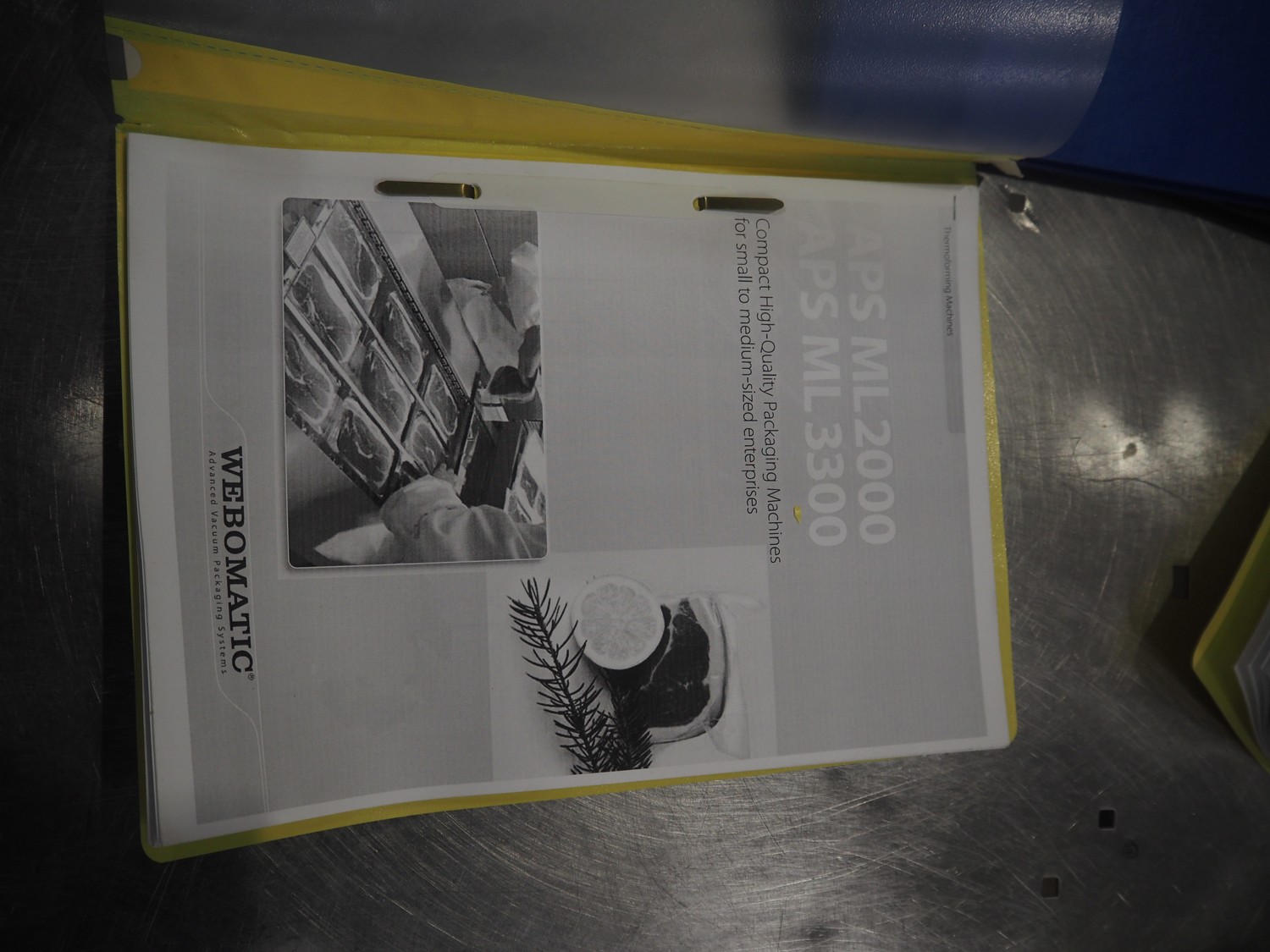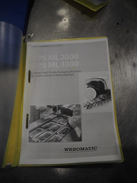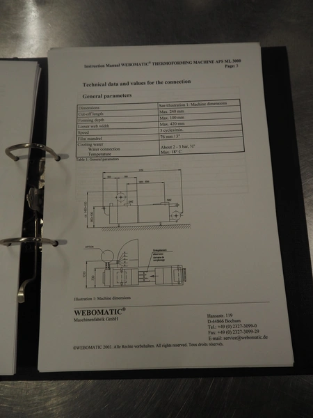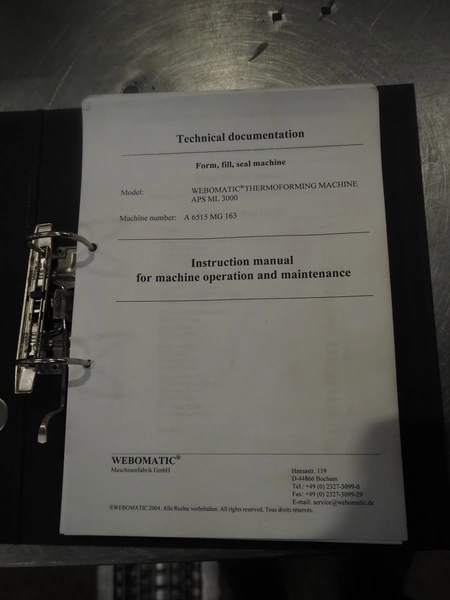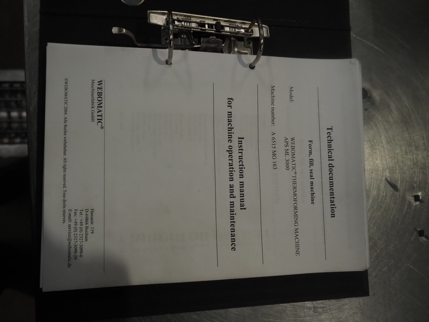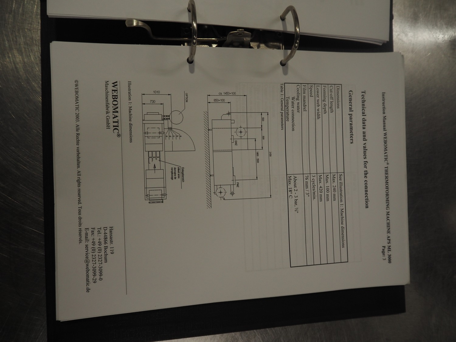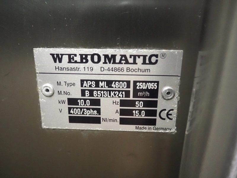 Webomatic thermoformer, model: APS ML 4600, machine number: B 6513LK241, 400 V, 3 Ph, 50 Hz, 15.0 A, 10.0 kW, film width: (bottom) 420 mm and (top) 416 mm, dimensions dye: 227 mm x 175 mm, plastic outfeed belt, belt width: 355 mm, Witt-Gasetechnik gas mixing station, total dimensions: 5400 mm x 1080 mm x 2100 mm. Including Busch suction device for rest film, dimensions Busch: Ø 470 mm x 1120 mm and S/s rack with dye's and parts, dimensions dye's: (5x) 205 mm x 60 mm and (3x) 205 mm x 110 mm, dimensions rack: 1100 mm x 400 mm x 1700 mm.