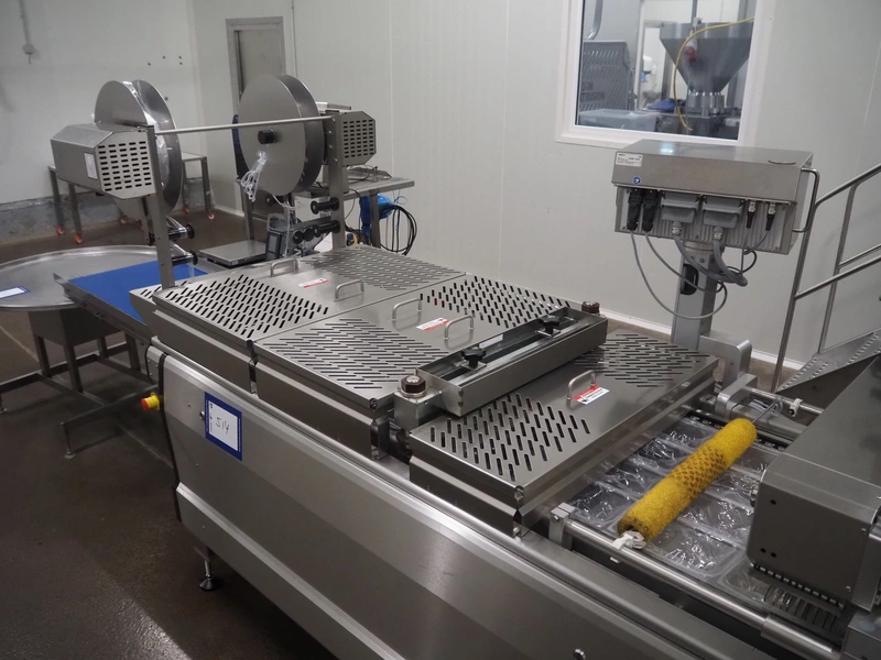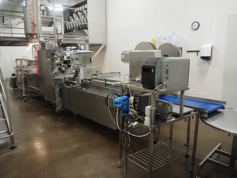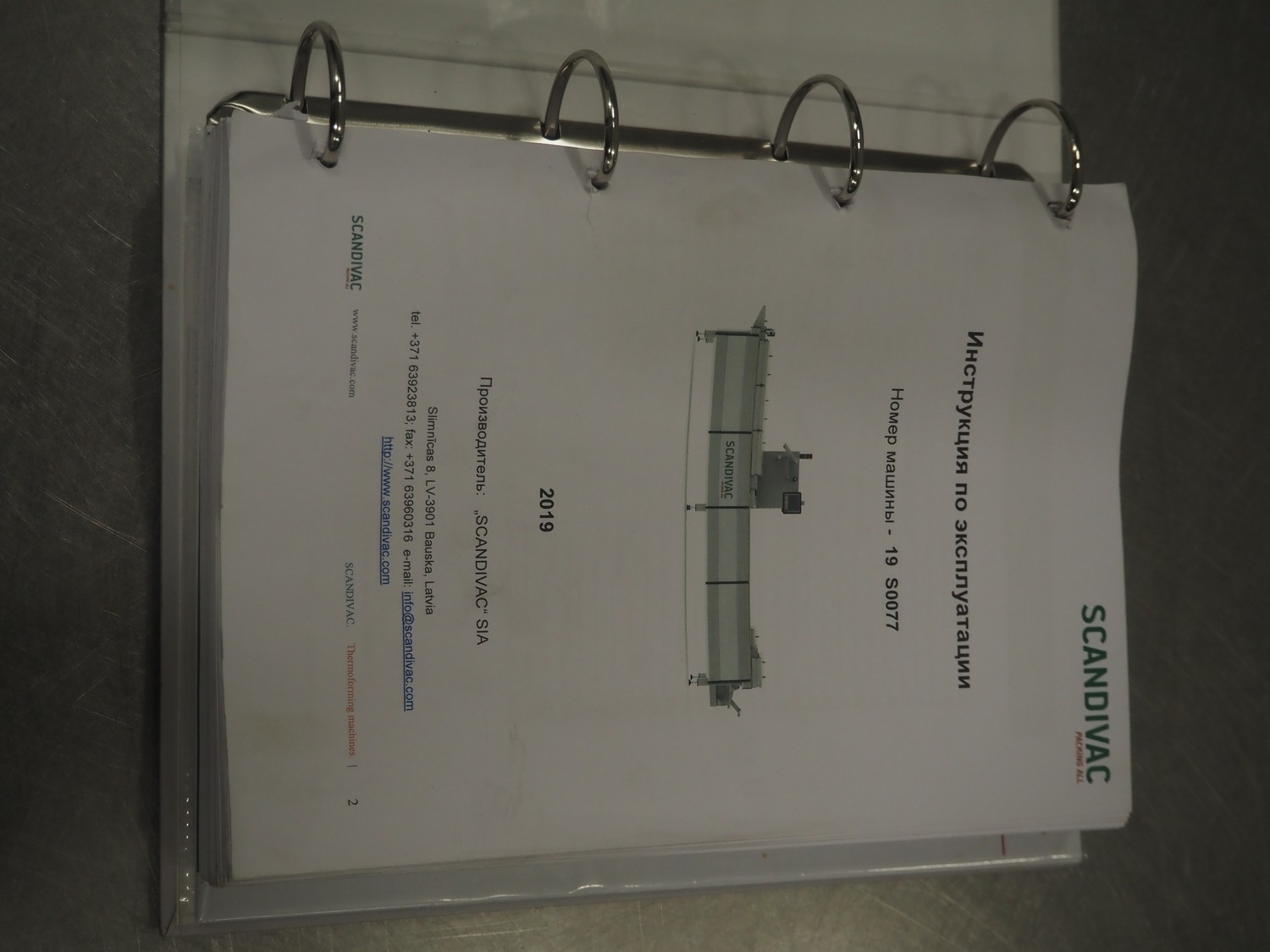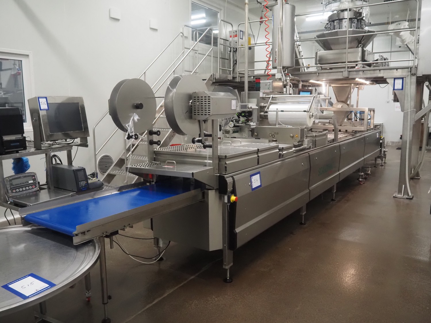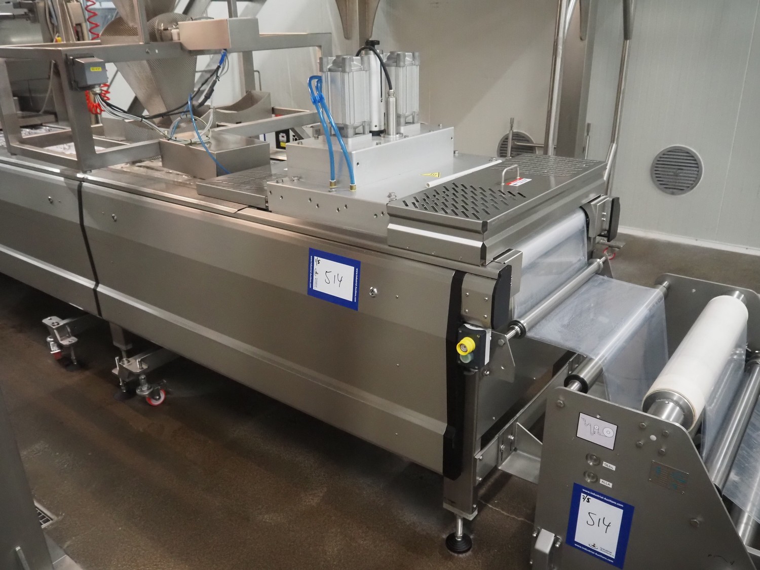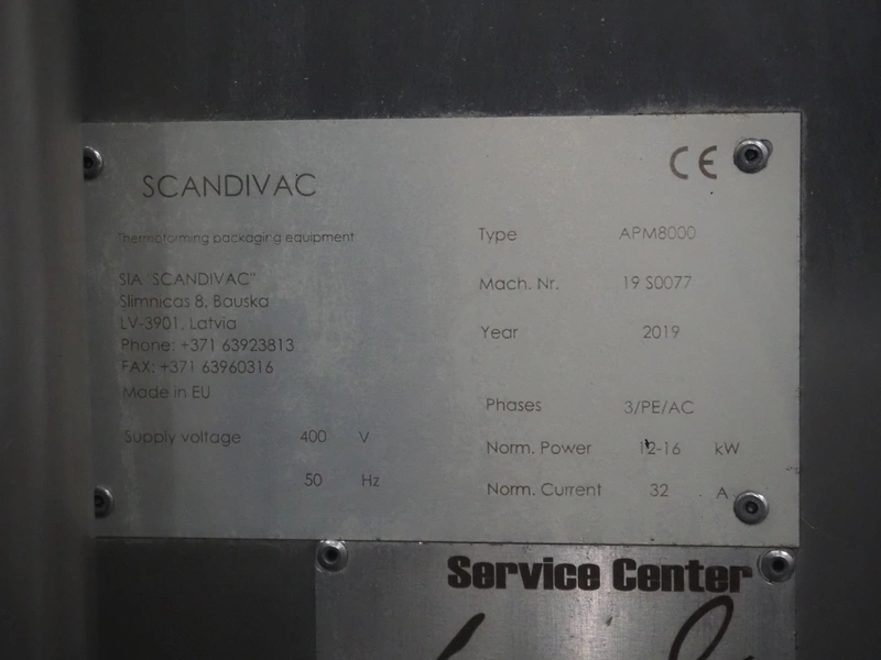 Scandivac thermoformer, type: APM8000, machine number: 19 S0077, year of construction: 2019, 400 V, 3 Ph, 50 Hz, 12-16 kW, 32 A, bottom film width: 560 mm, film width top film: 555 mm, dye: (4x) 198 mm x 106 mm, total dimensions thermoformer: 8700 mm x 1200 mm x 1900 mm, including Procon film unwinder, dimensions: 1300 mm x 2000 mm x 700 mm, ELS-European Labelling Systems GmbH & Co. KG labeller, PBI gas mixer, s/s gas flush tank, dimensions: Ø 400 mm x 1100 mm, s/s rack with various spare parts, dimensions: 1150 mm x 400 mm x 1700 mm, ERS GmbH chiller, dimensions: 760 mm x 460 mm x 680 mm. Without main vacuum pump, vacuum was centrally regulated.