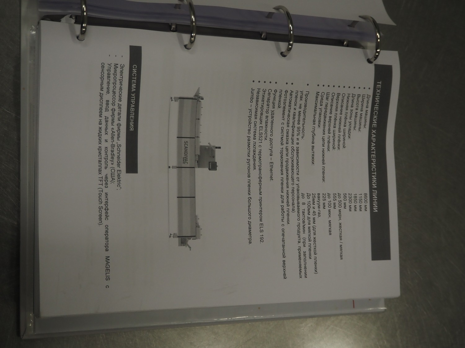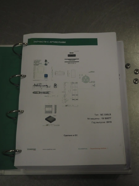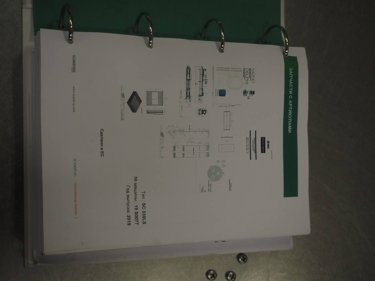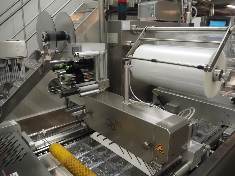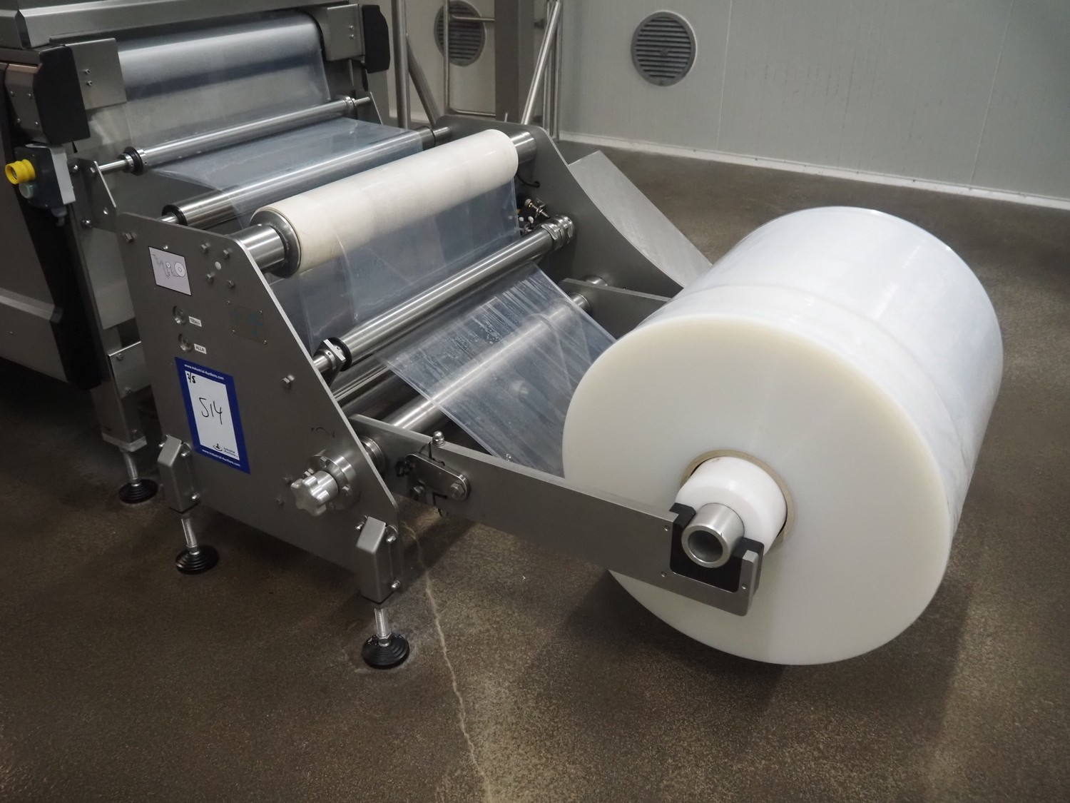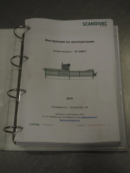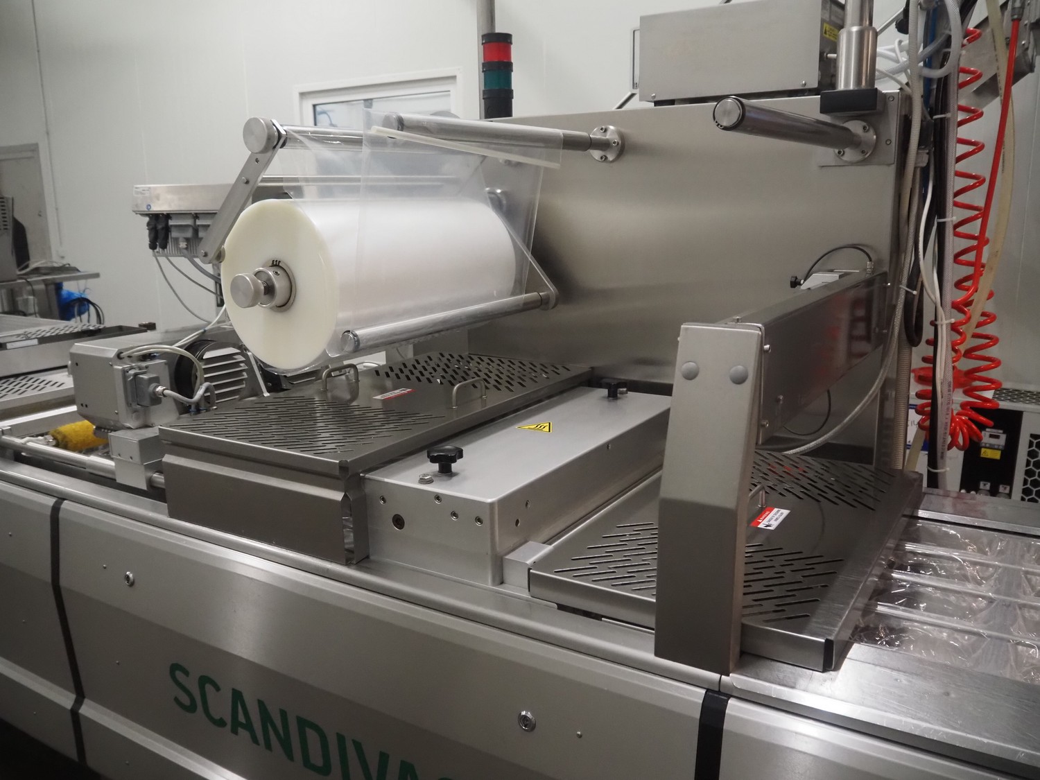 Scandivac thermoformer, type: APM8000, machine number: 19 S0077, year of construction: 2019, 400 V, 3 Ph, 50 Hz, 12-16 kW, 32 A, bottom film width: 560 mm, film width top film: 555 mm, dye: (4x) 198 mm x 106 mm, total dimensions thermoformer: 8700 mm x 1200 mm x 1900 mm, including Procon film unwinder, dimensions: 1300 mm x 2000 mm x 700 mm, ELS-European Labelling Systems GmbH & Co. KG labeller, PBI gas mixer, s/s gas flush tank, dimensions: Ø 400 mm x 1100 mm, s/s rack with various spare parts, dimensions: 1150 mm x 400 mm x 1700 mm, ERS GmbH chiller, dimensions: 760 mm x 460 mm x 680 mm. Without main vacuum pump, vacuum was centrally regulated.