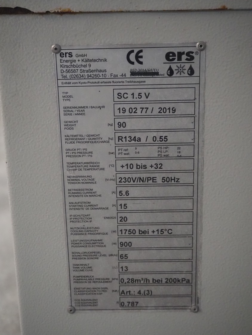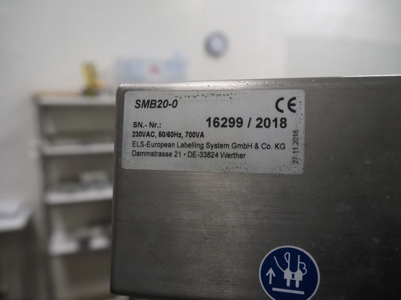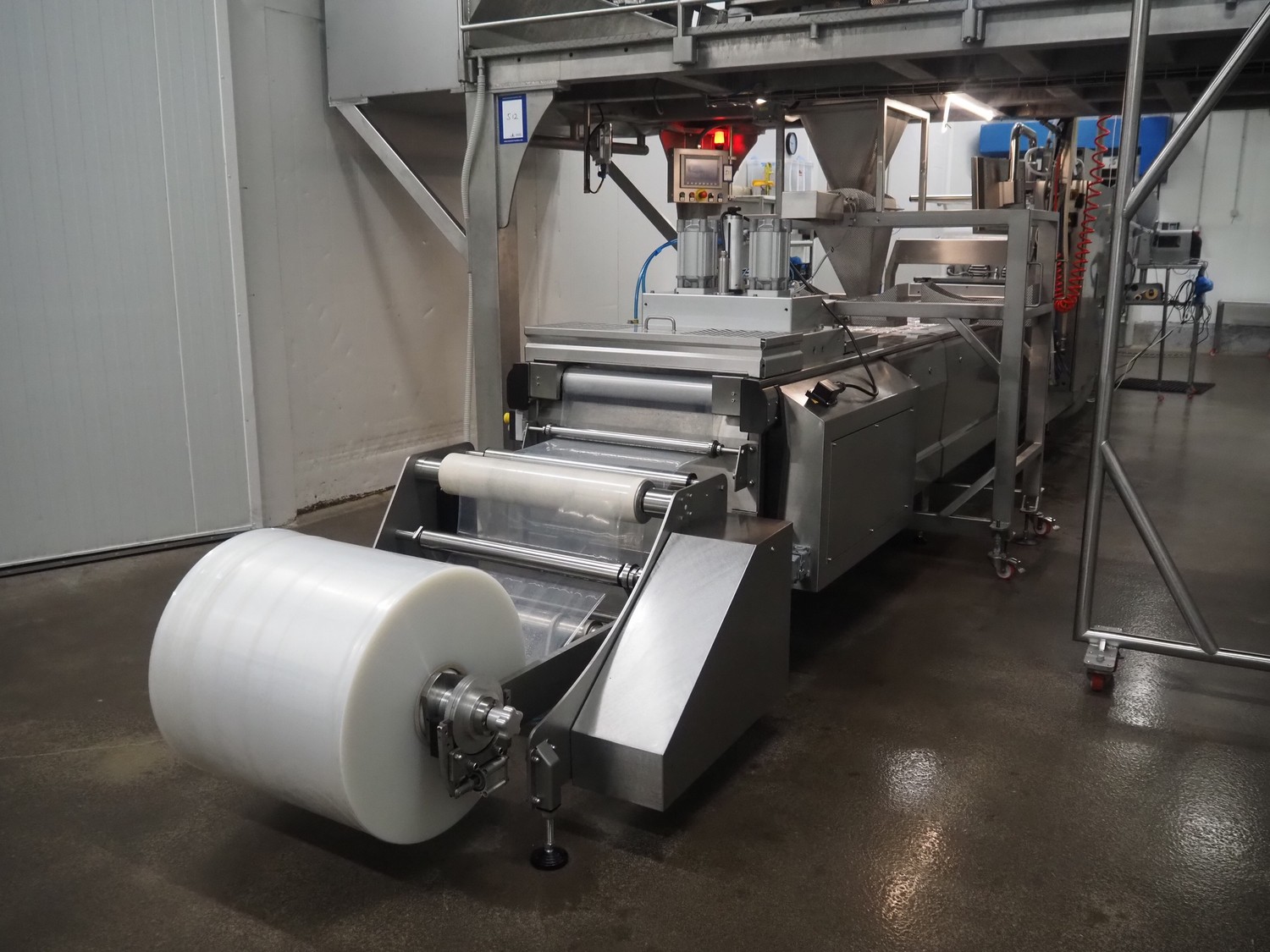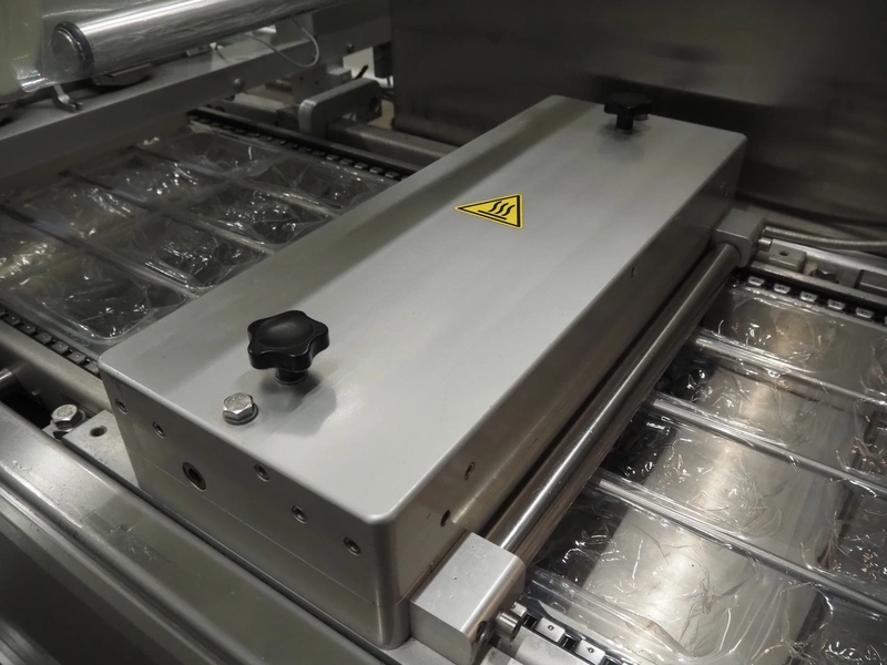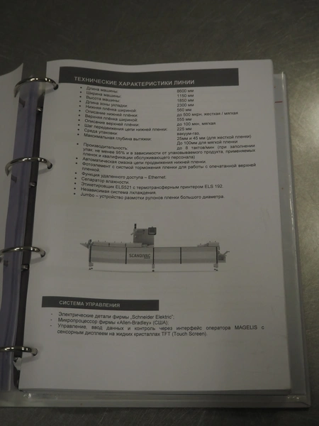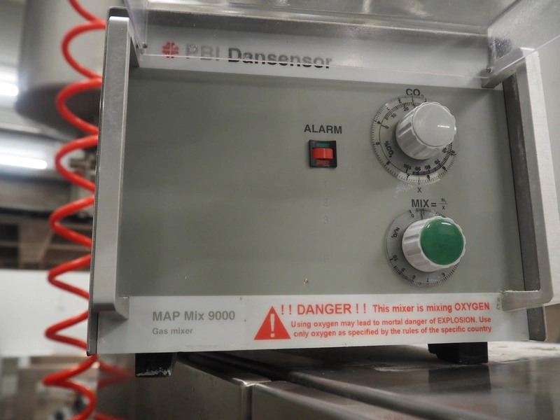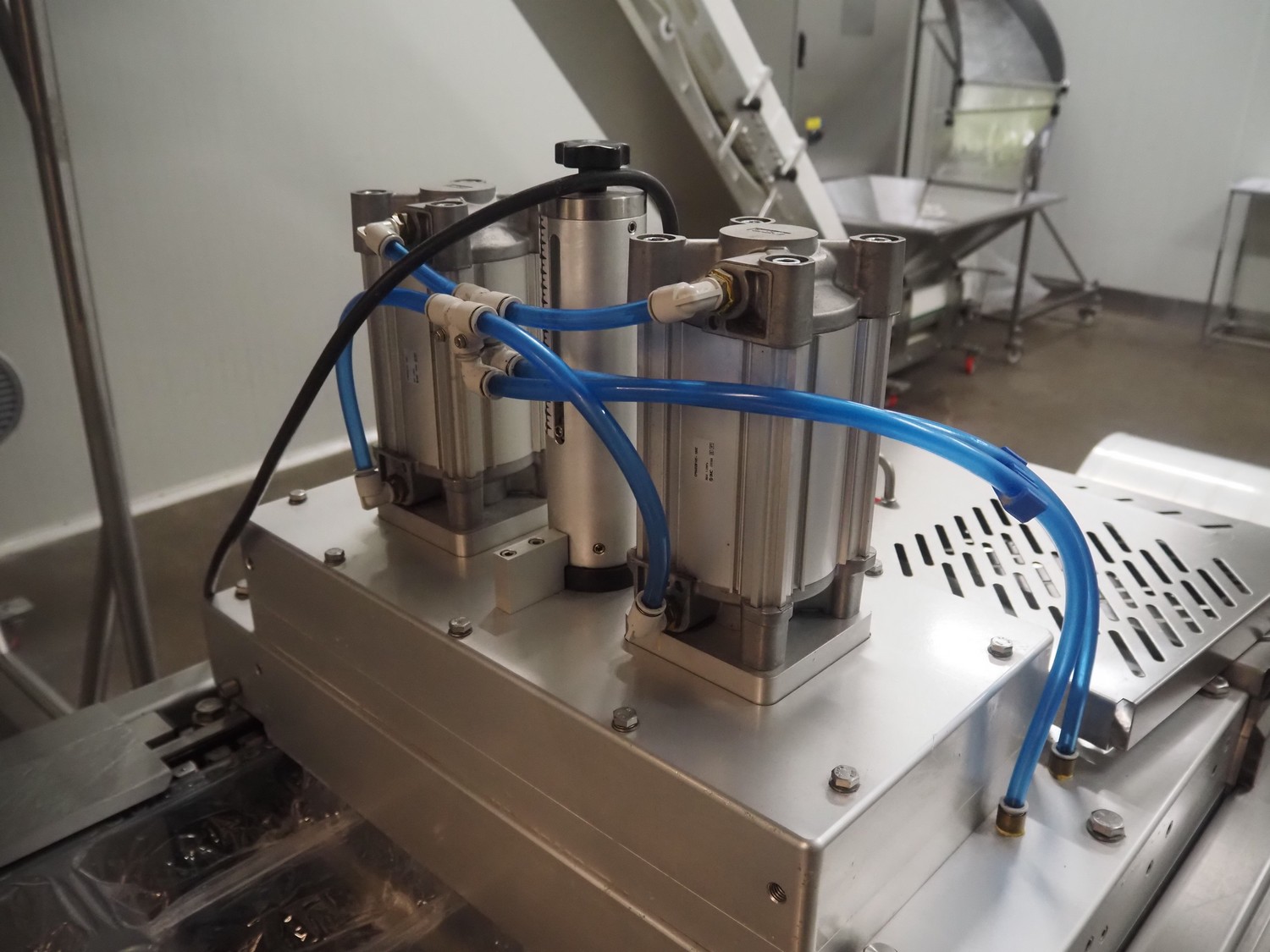Scandivac thermoformer, type: APM8000, machine number: 19 S0077, year of construction: 2019, 400 V, 3 Ph, 50 Hz, 12-16 kW, 32 A, bottom film width: 560 mm, film width top film: 555 mm, dye: (4x) 198 mm x 106 mm, total dimensions thermoformer: 8700 mm x 1200 mm x 1900 mm, including Procon film unwinder, dimensions: 1300 mm x 2000 mm x 700 mm, ELS-European Labelling Systems GmbH & Co. KG labeller, PBI gas mixer, s/s gas flush tank, dimensions: Ø 400 mm x 1100 mm, s/s rack with various spare parts, dimensions: 1150 mm x 400 mm x 1700 mm, ERS GmbH chiller, dimensions: 760 mm x 460 mm x 680 mm. Without main vacuum pump, vacuum was centrally regulated.
