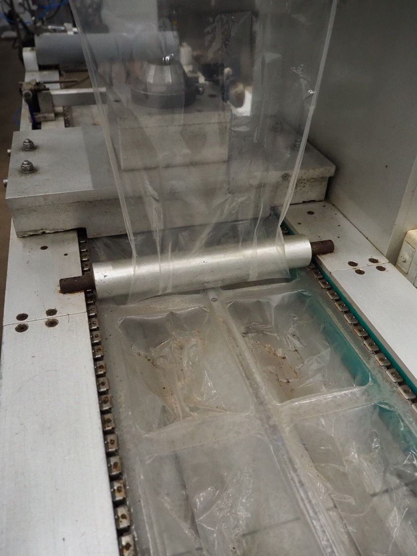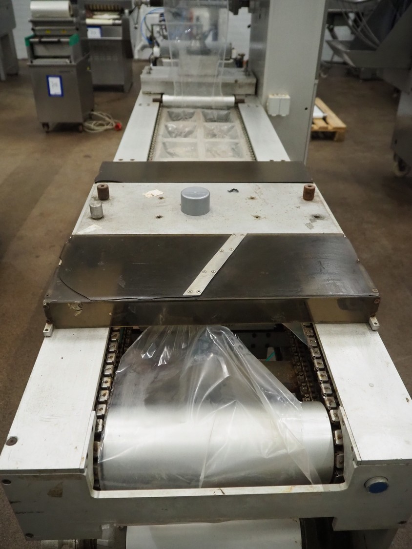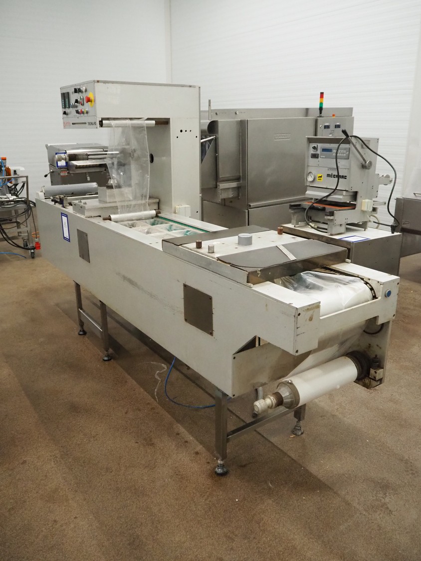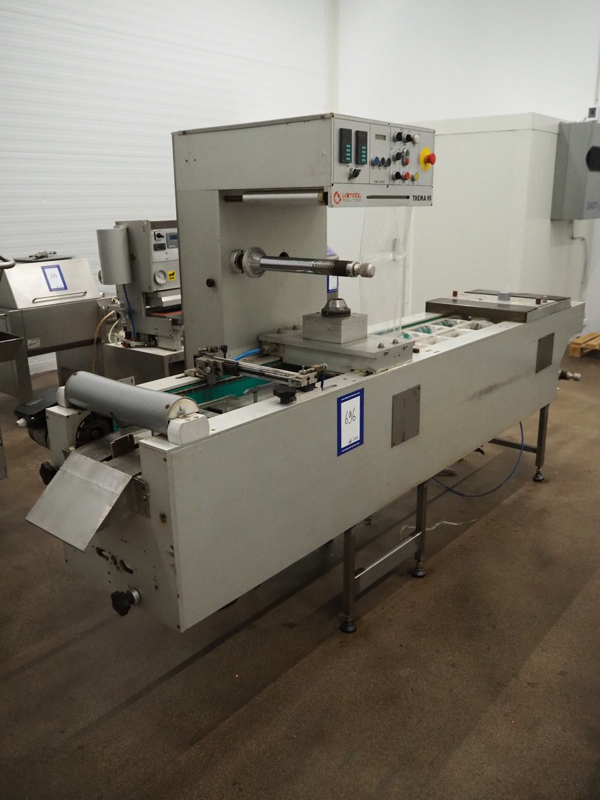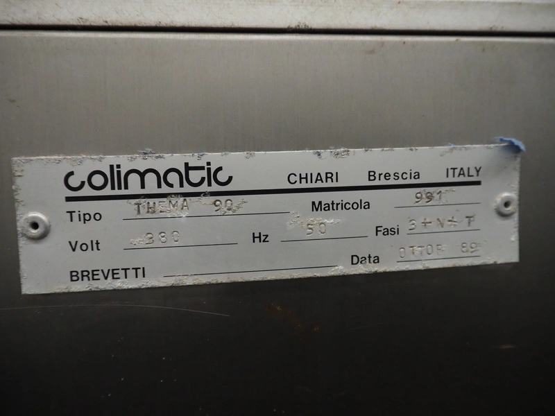 Colimatic thermoformer, type: THEMA 90, serial number: 991, year of construction: 1989, 380 V, 3 Ph, 50 Hz, film width: 320 mm, dye: (2x) 175 mm x 130 mm, total dimensions: 3300 mm x 780 mm x 1740 mm. Without main vacuum pump.