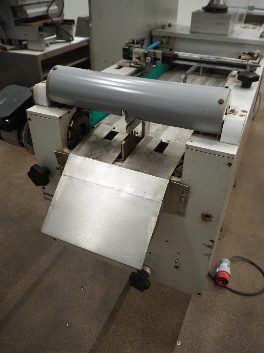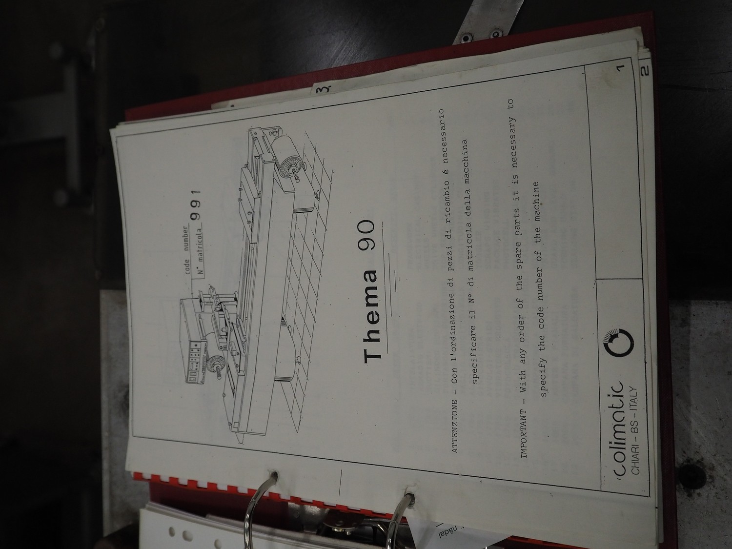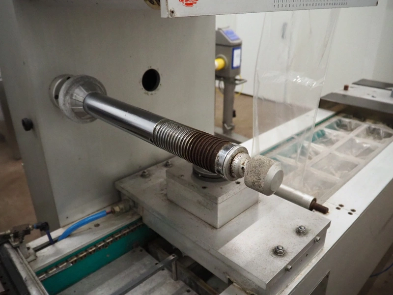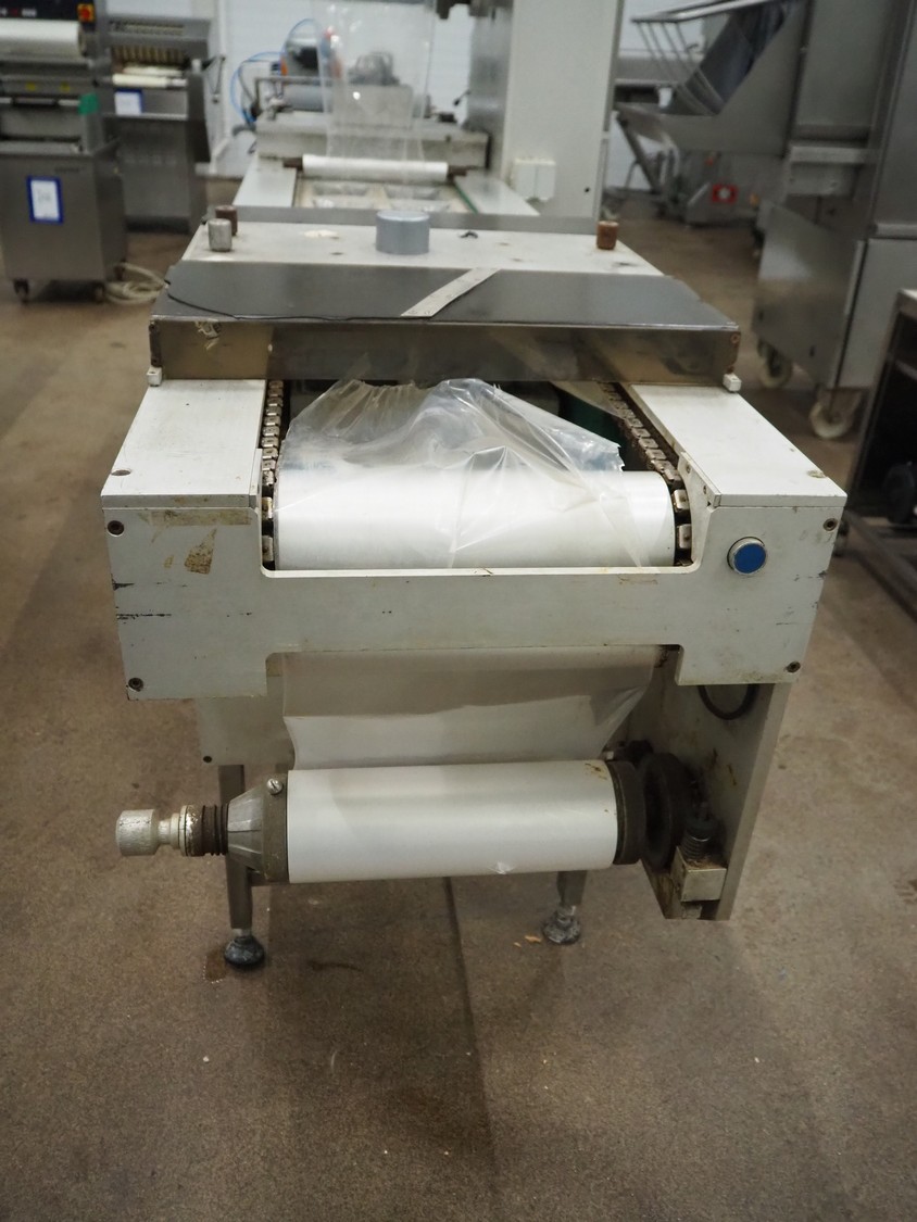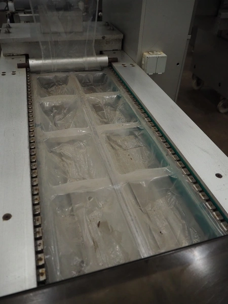Colimatic thermoformer, type: THEMA 90, serial number: 991, year of construction: 1989, 380 V, 3 Ph, 50 Hz, film width: 320 mm, dye: (2x) 175 mm x 130 mm, total dimensions: 3300 mm x 780 mm x 1740 mm. Without main vacuum pump.