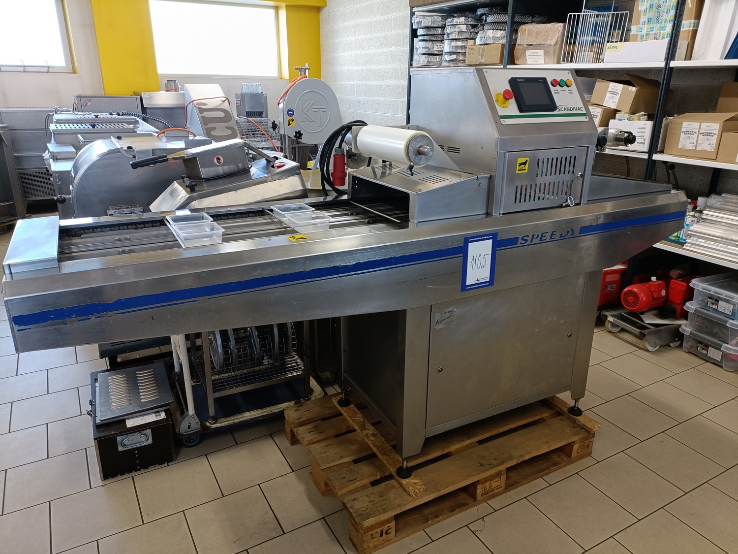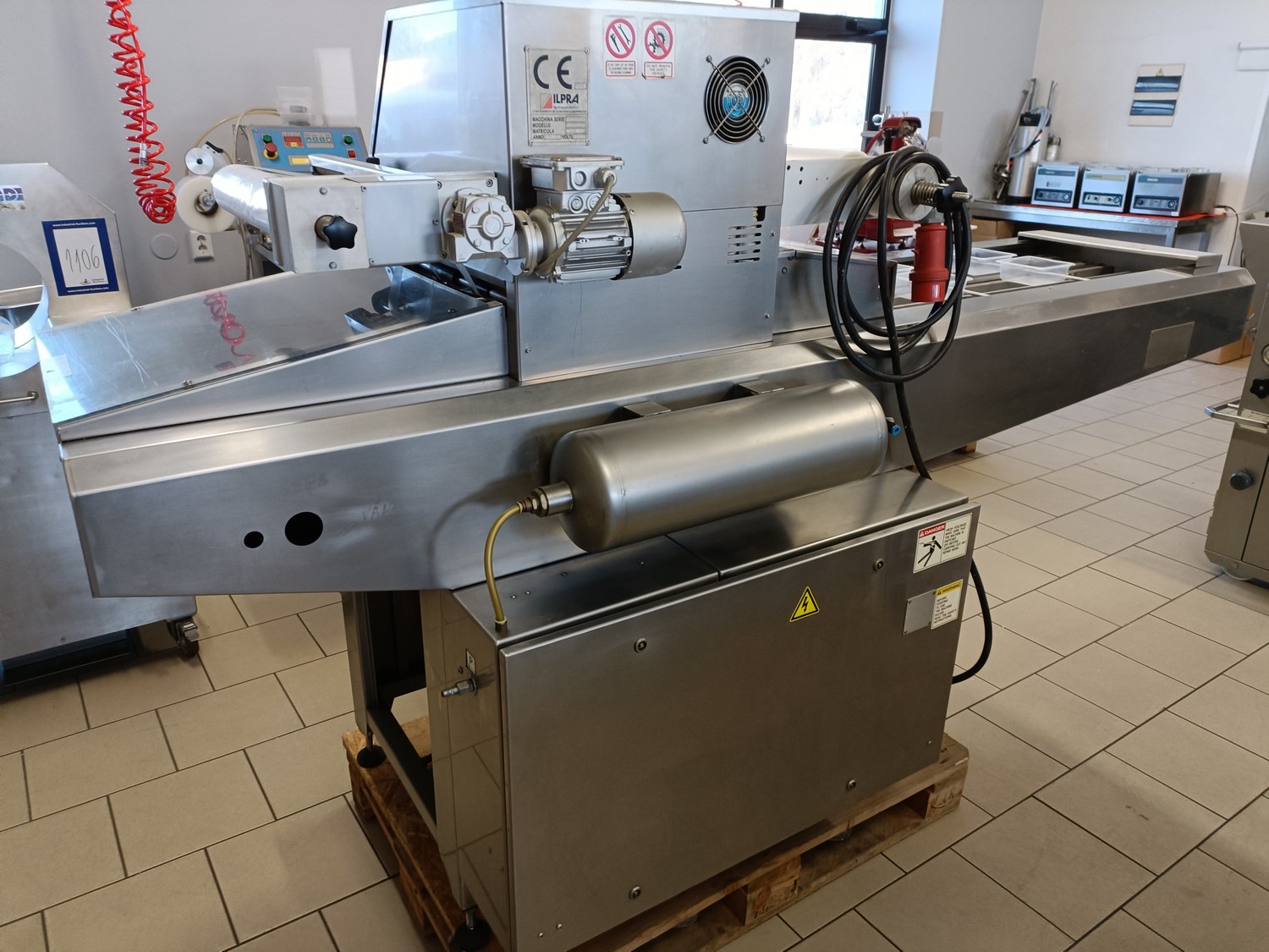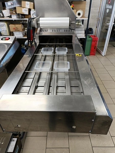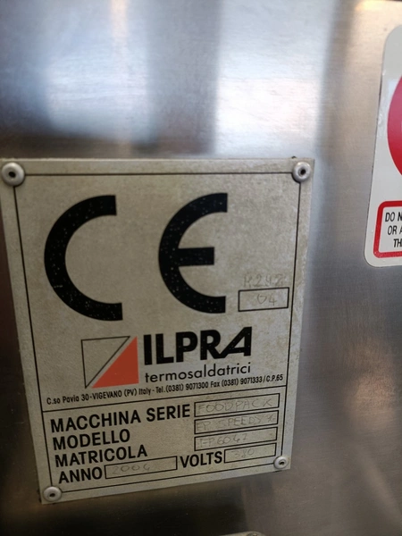 Ilpra traysealer, model: FD SPEEDY v/g, serial number: FP6047, year of construction: 2004, 380 V, film width: 355 mm, dimensions dye: (2x) 127 mm x 127 mm, total dimensions: 2460 mm x 810 mm x 1500 mm.
