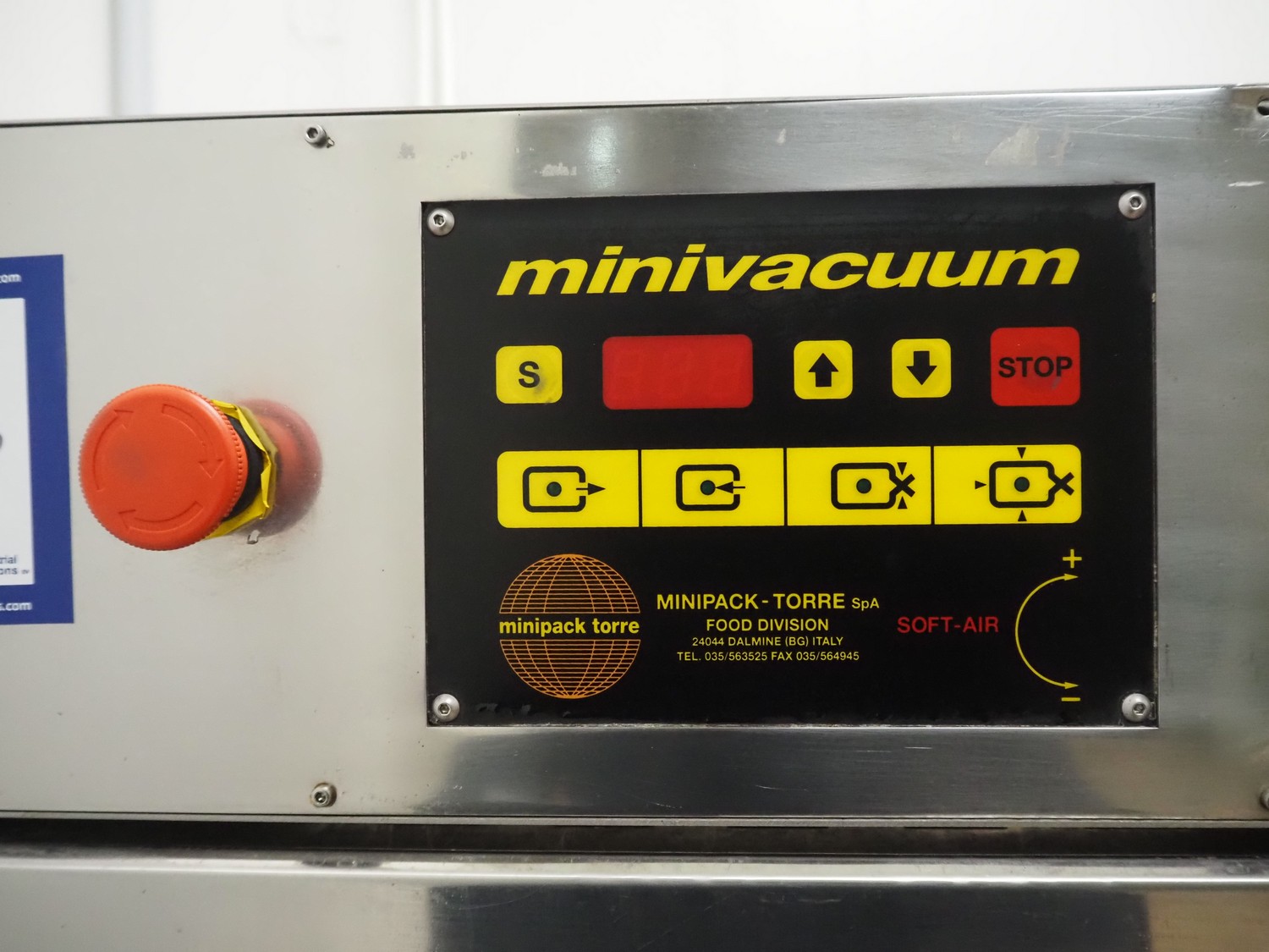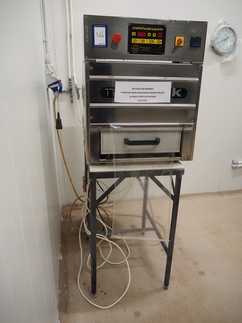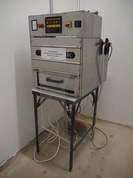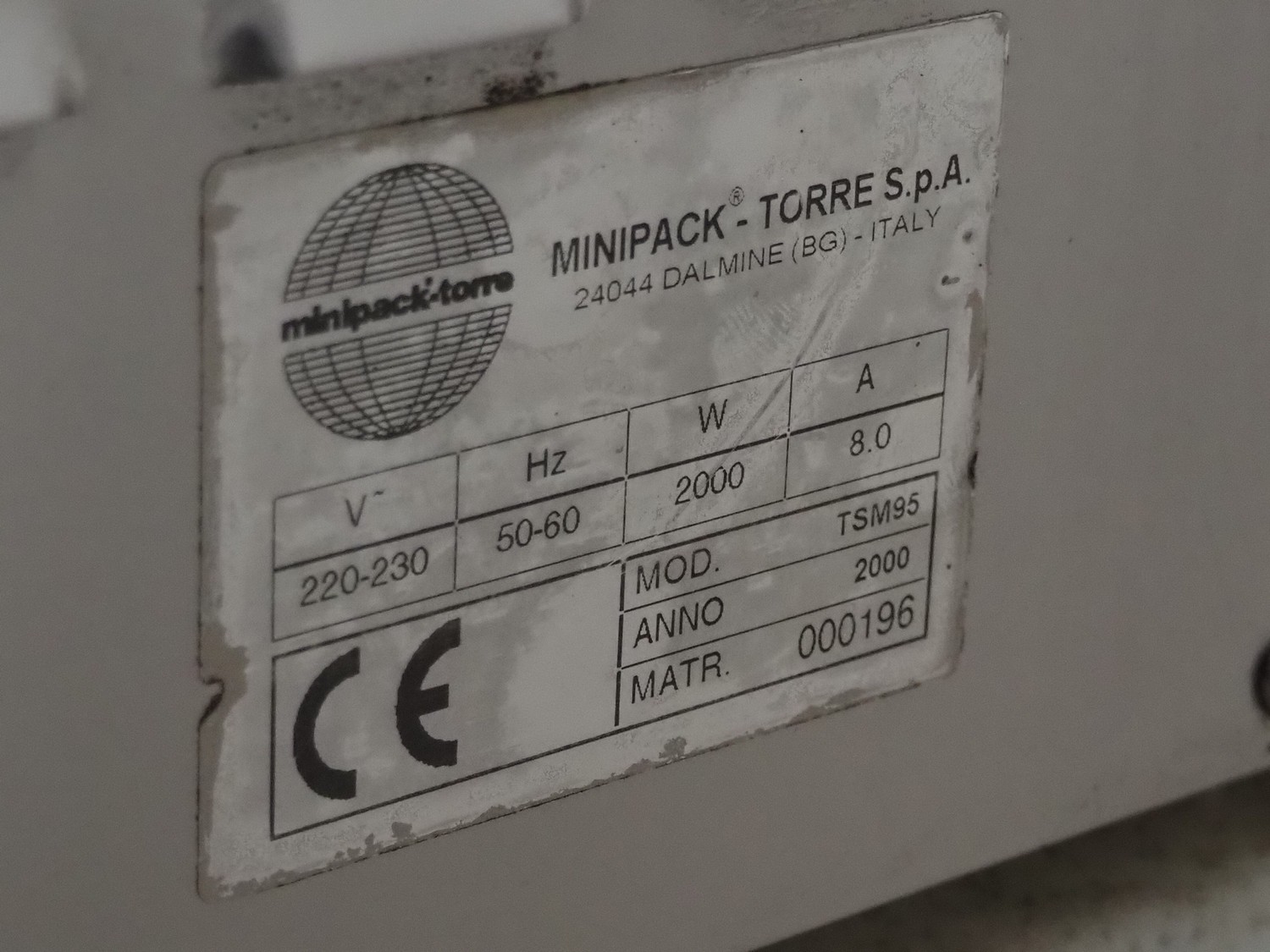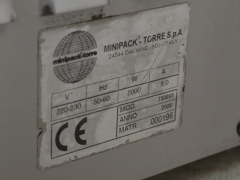 MINIPACK-TORRE S.p.A. mobile traysealer, model: TSM95, serial number: 000196, year of construction: 2000, 220-230 V, 50-60 Hz, 8.0 A, 2000 W, film width: 380 mm, with Busch vacuum pump, total dimensions: 730 mm x 640 mm x 1700 mm.