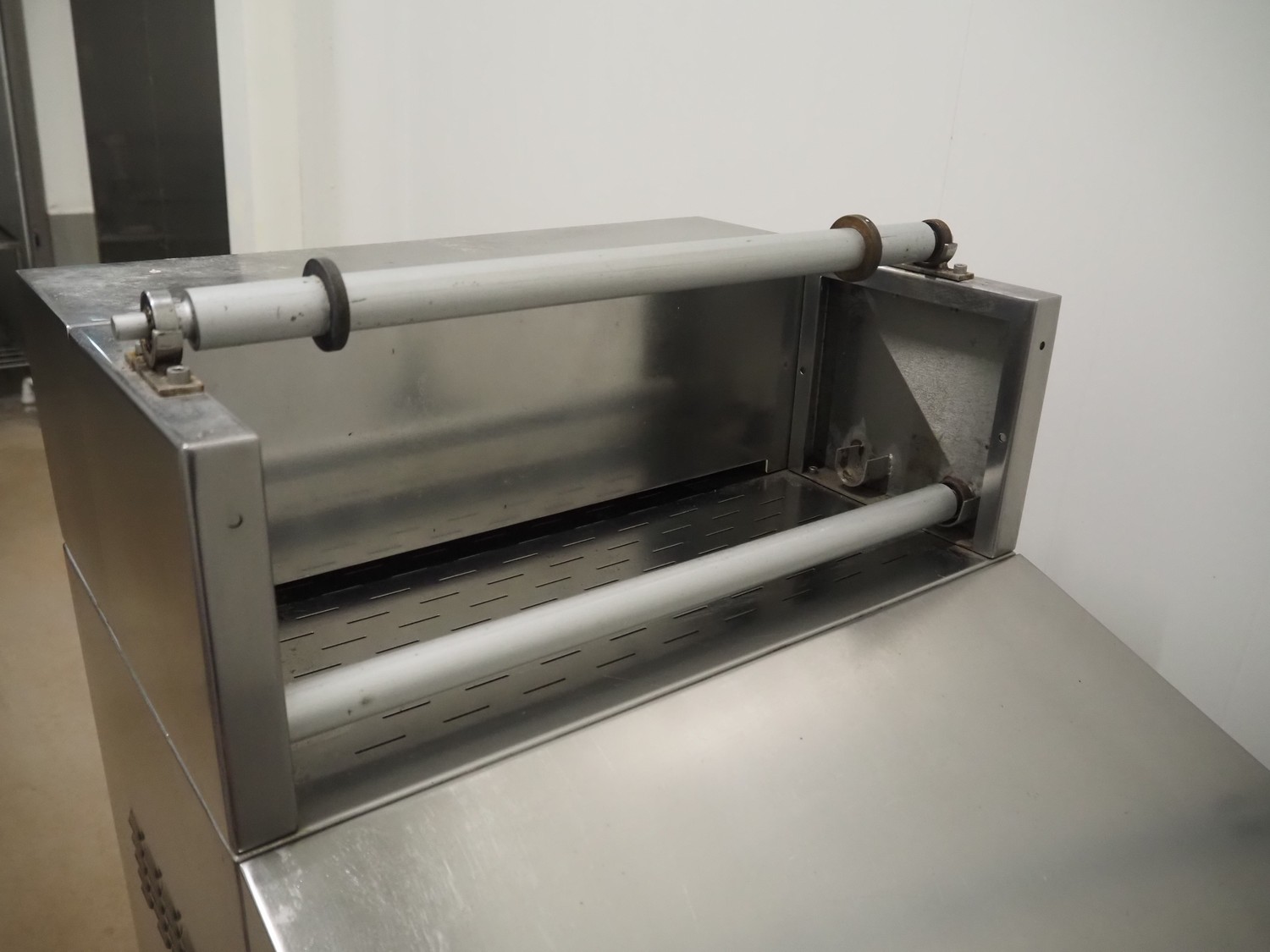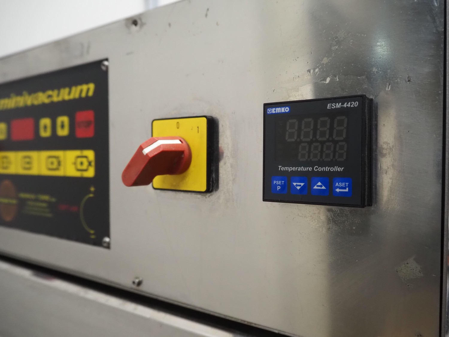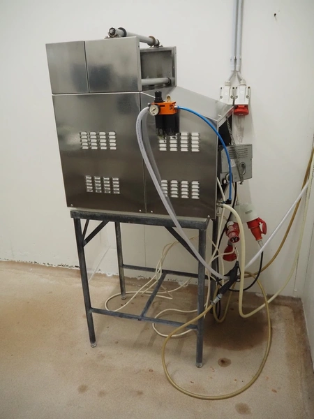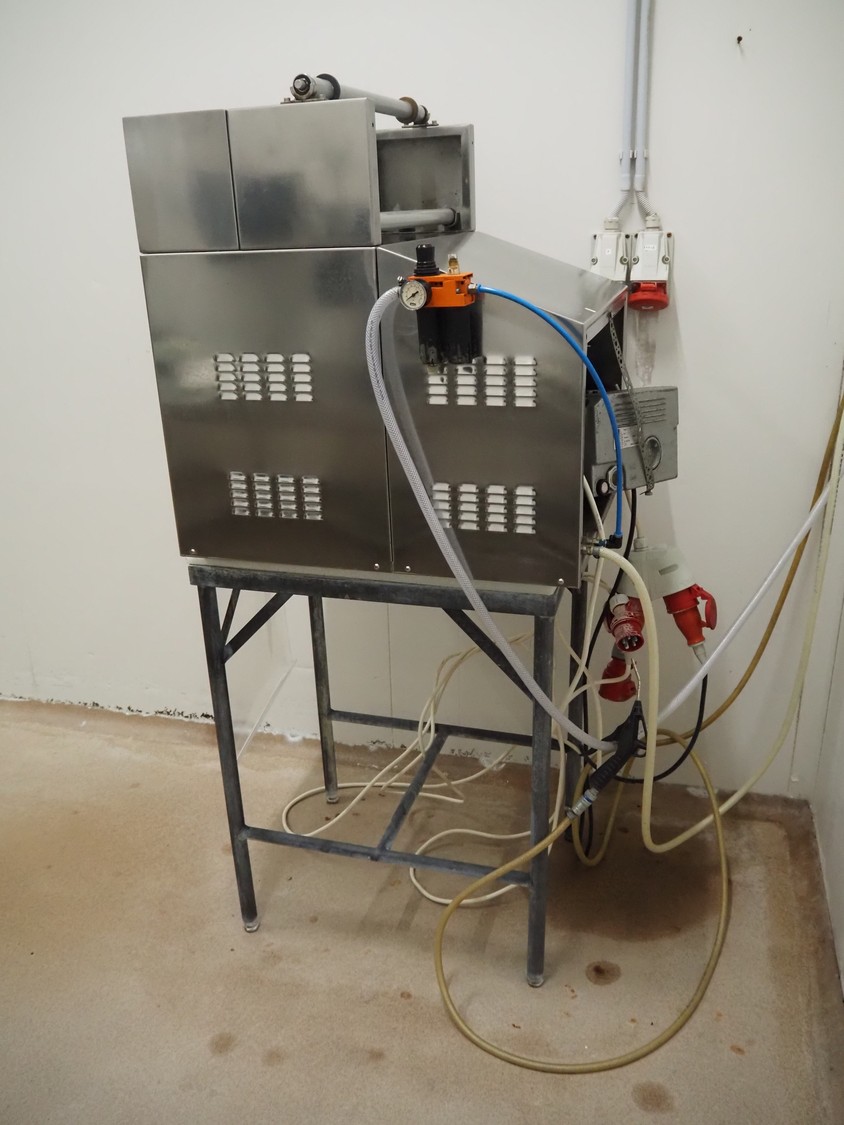 MINIPACK-TORRE S.p.A. mobile traysealer, model: TSM95, serial number: 000196, year of construction: 2000, 220-230 V, 50-60 Hz, 8.0 A, 2000 W, film width: 380 mm, with Busch vacuum pump, total dimensions: 730 mm x 640 mm x 1700 mm.