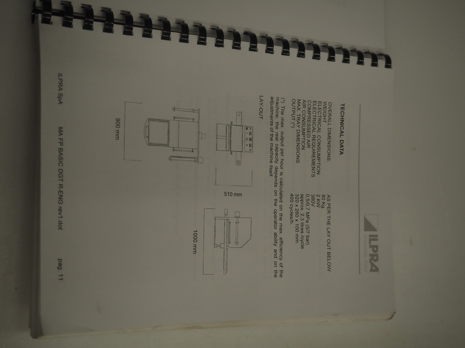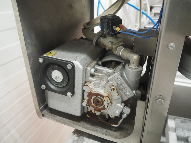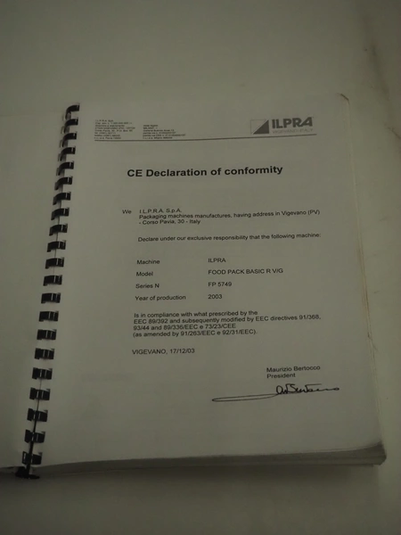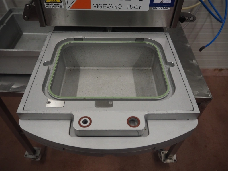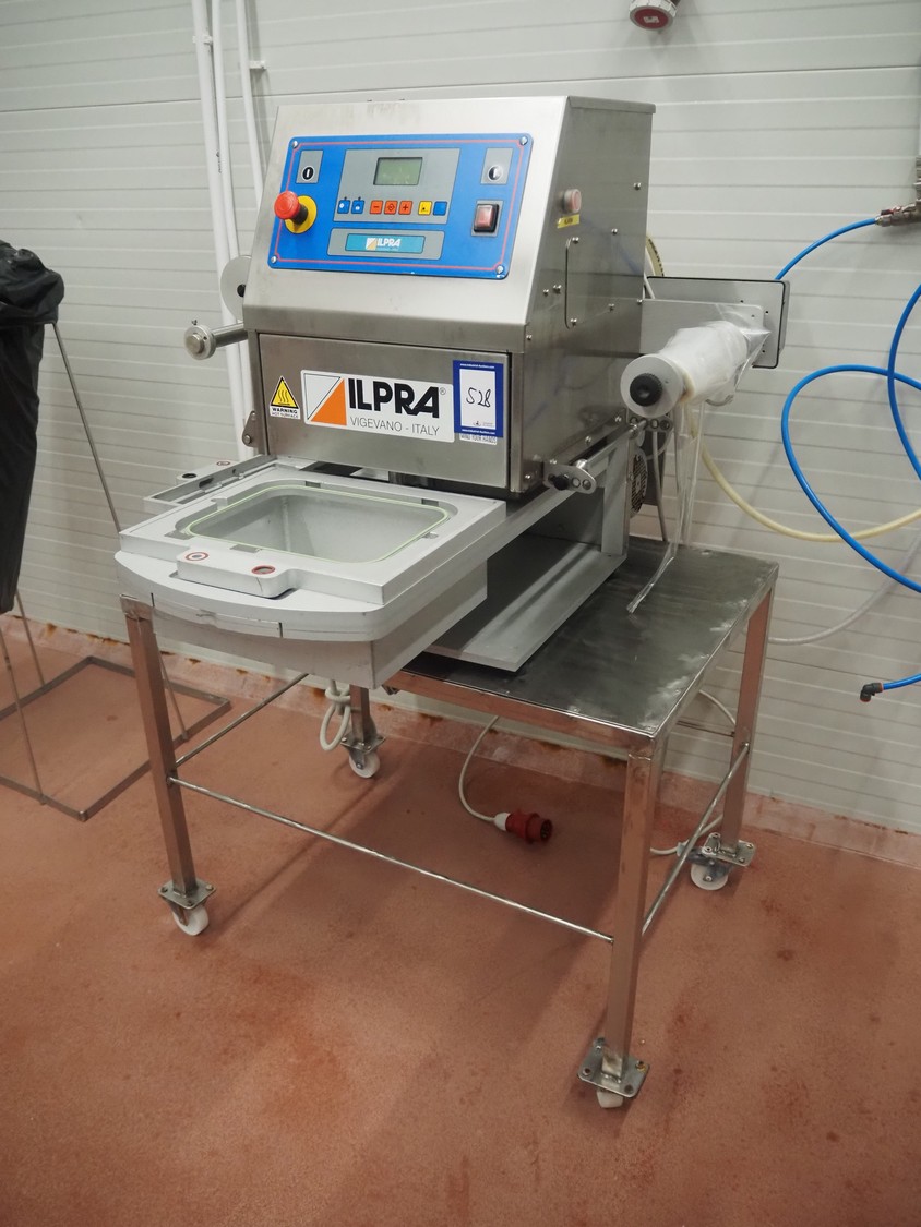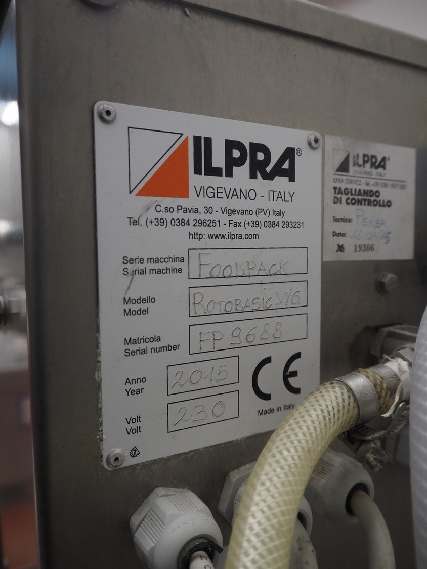 Ilpra mobile traysealer, serial machine: Foodpack, model: Rotobasic V/G, serial number: FP9688, year of construction: 2015, 230 V, dye: 220 mm x 290 mm, with Busch vacuum pump, total dimensions: 1000 mm x 1200 mm x 1600 mm.