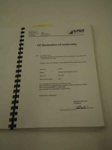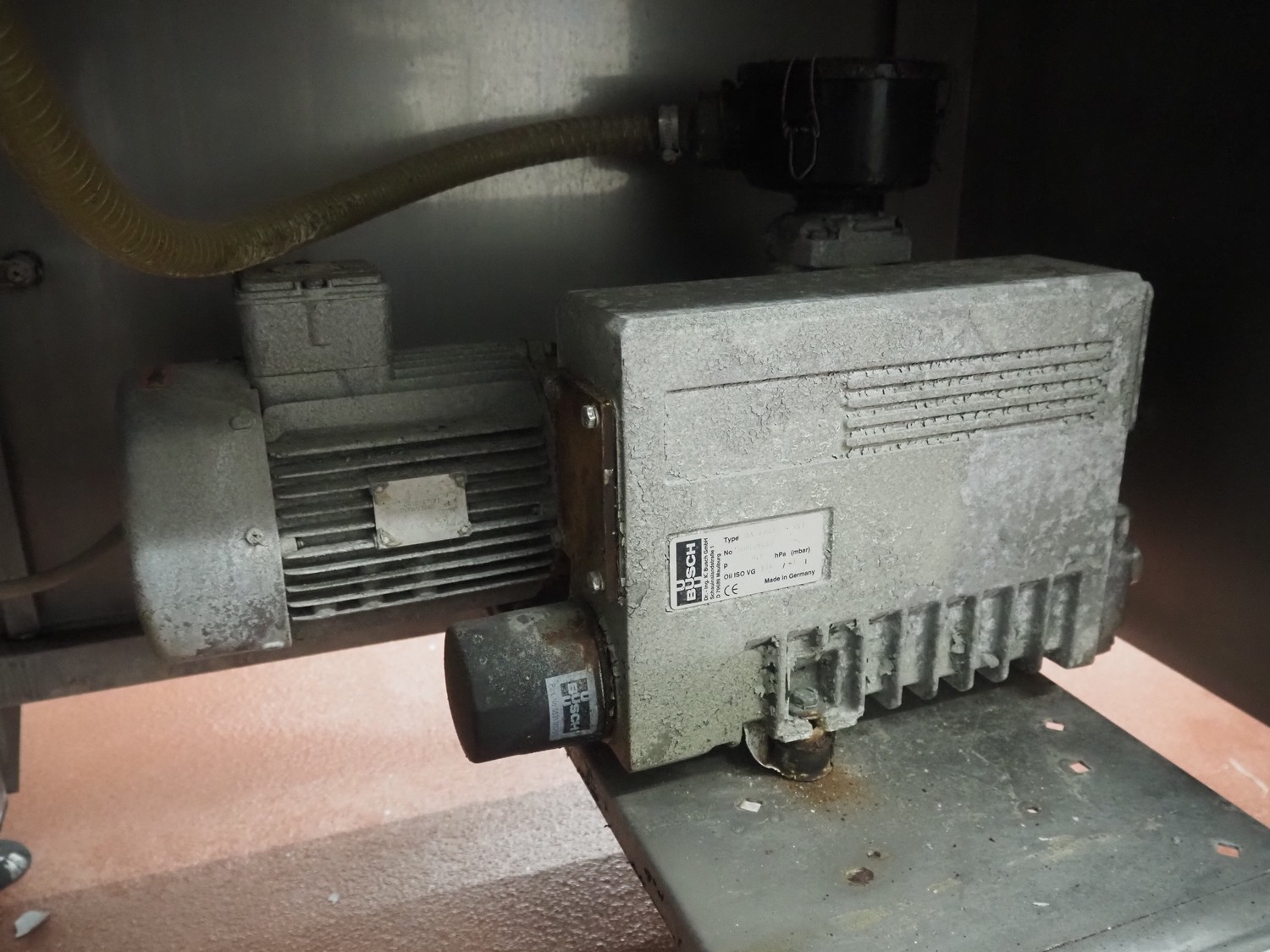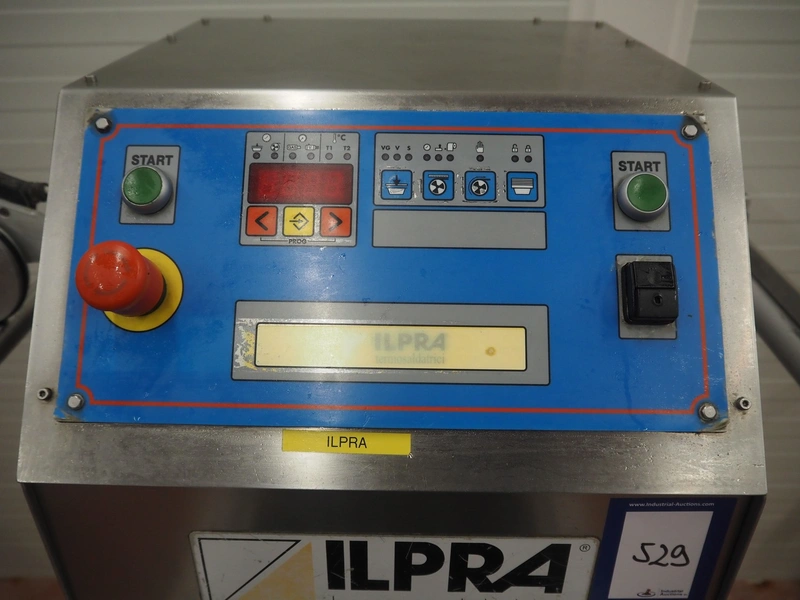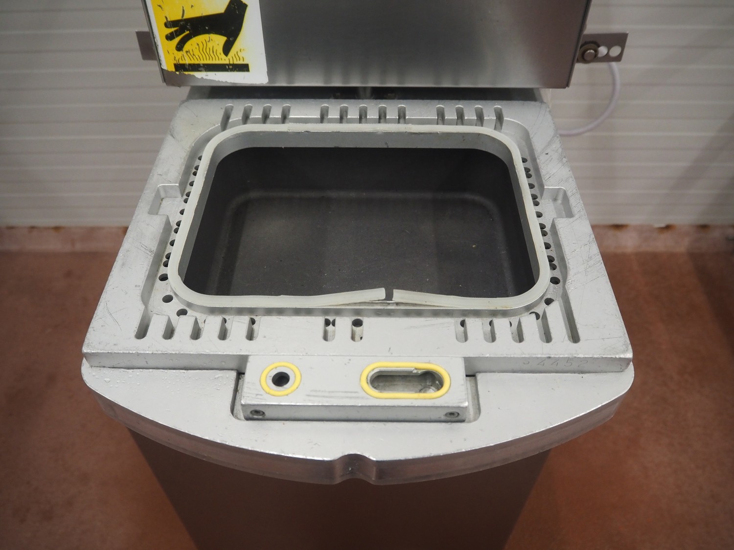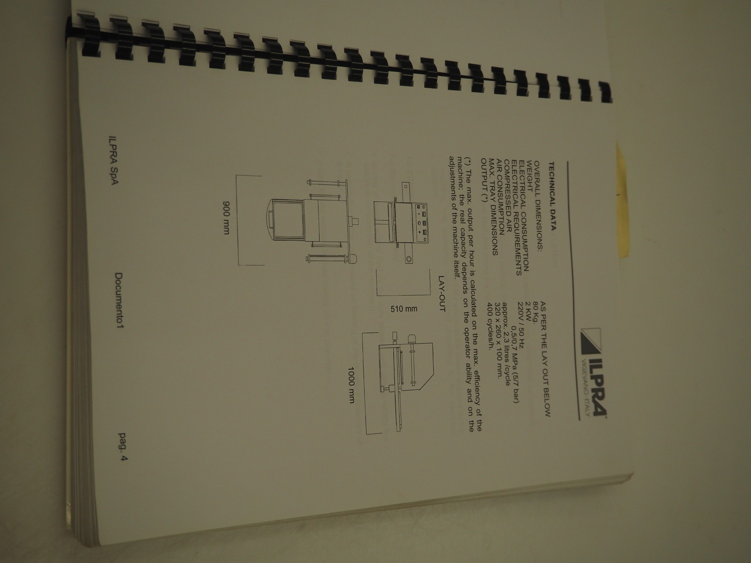Ilpra mobile traysealer, serial machine: Foodpack, model: Rotobasic V/G, serial number: FP4387, year of construction: 2001, 230 V, dye: 220 mm x 290 mm, with Busch vacuum pump, total dimensions: 800 mm x 1100 mm x 1450 mm.