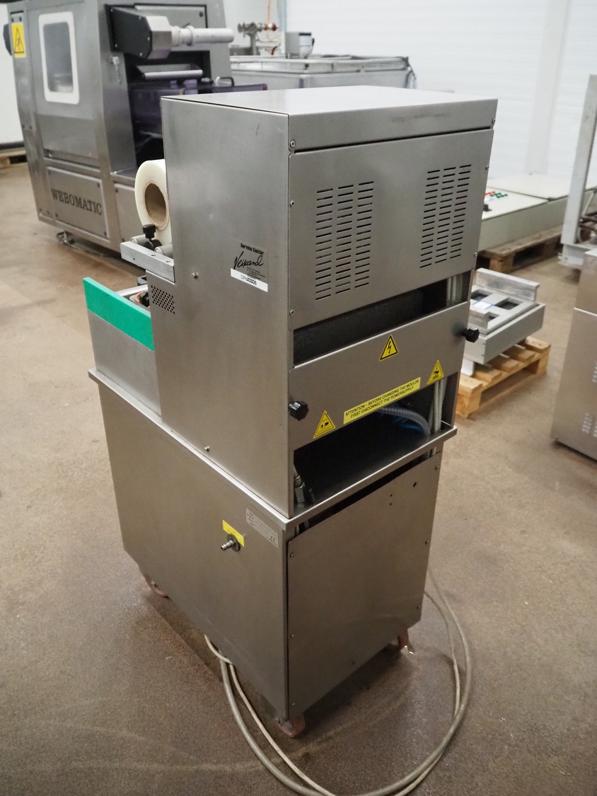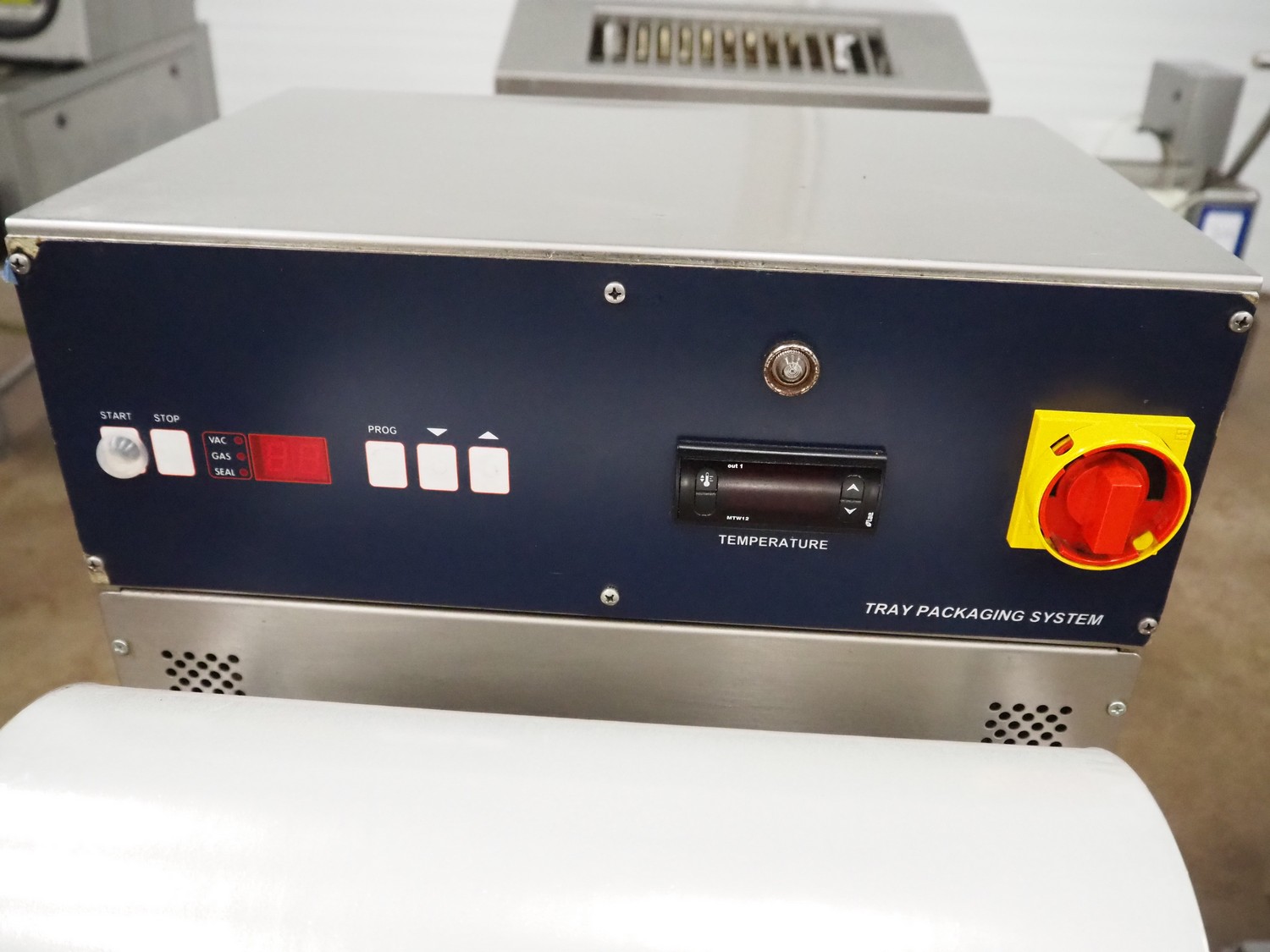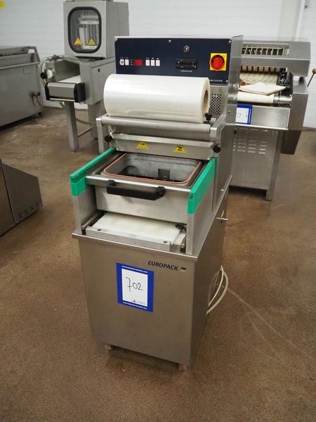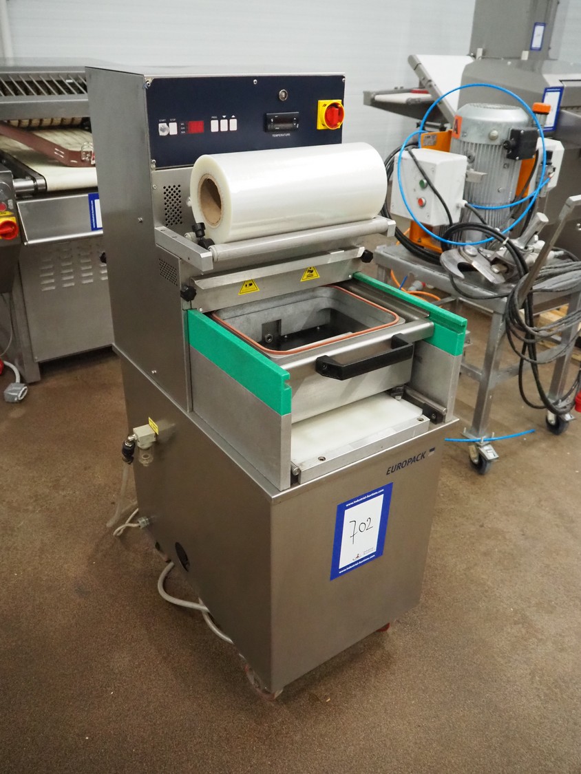 Europack mobile traysealer, film width: 340 mm, dye: 300 mm x 250 mm, total dimensions: 720 mm x 460 mm x 1300 mm.
