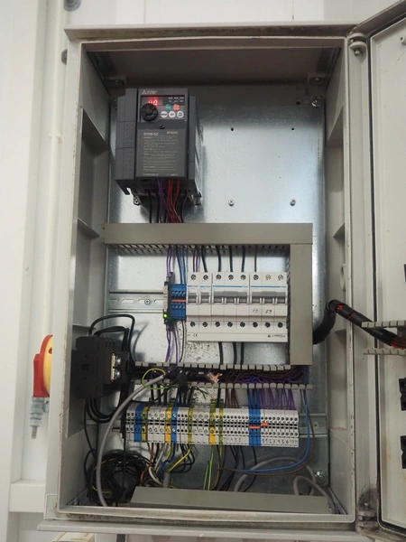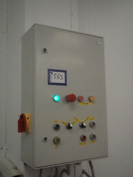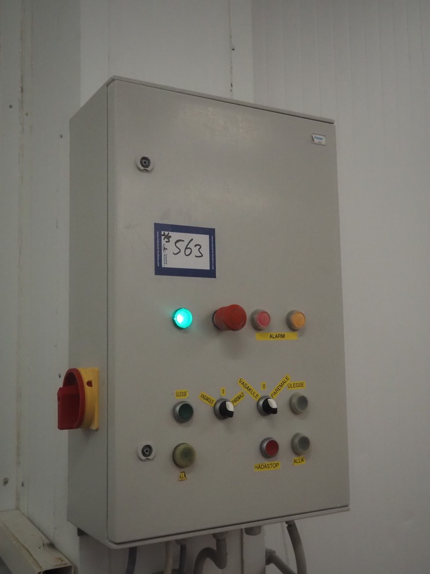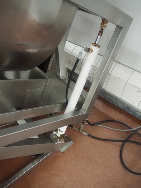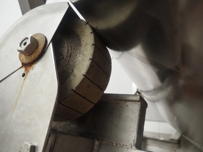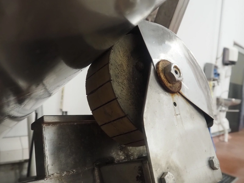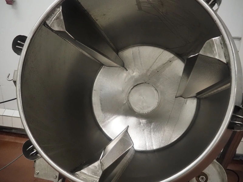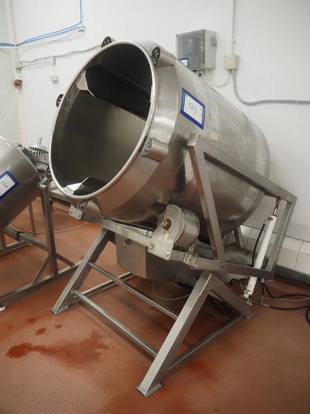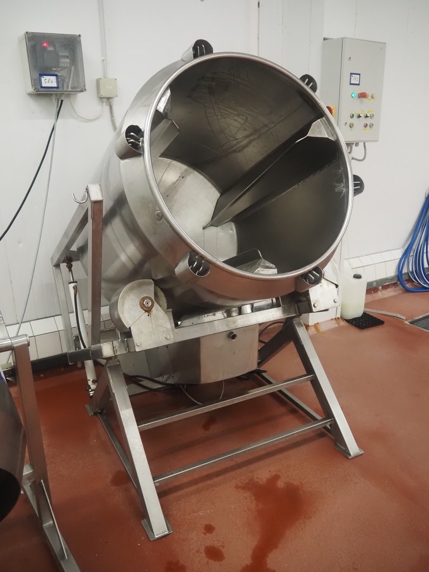 S/s tumbler, dimensions drum: Ø 1000 mm x 1000 mm, total dimensions: 1400 mm x 1700 mm x 1800 mm, including switch cabinet, dimensions: 400 mm x 200 mm x 650 mm and hydraulic unit, dimensions: 600 mm x 300 mm x 400 mm. Without lid.