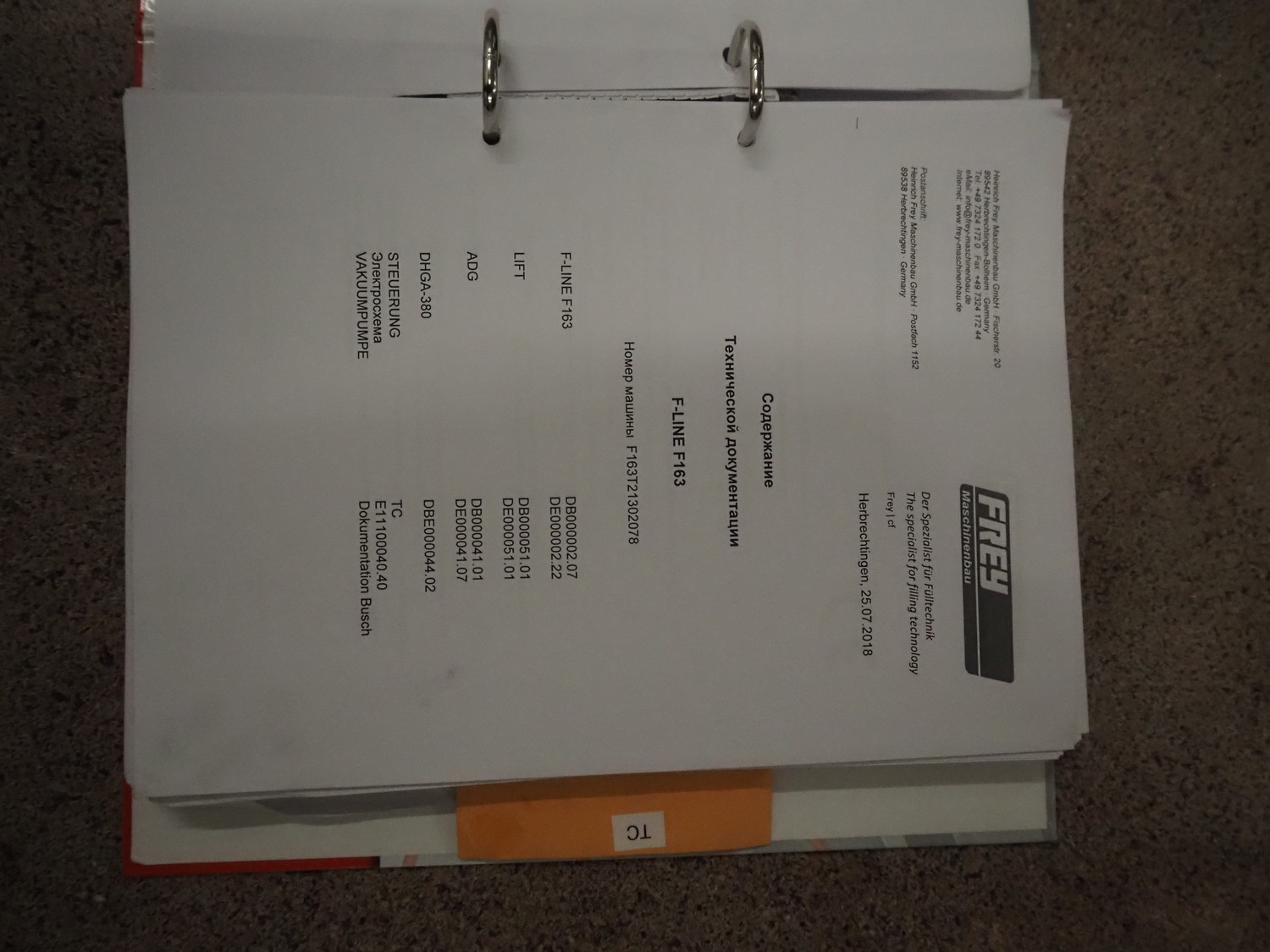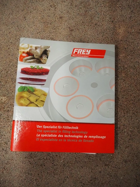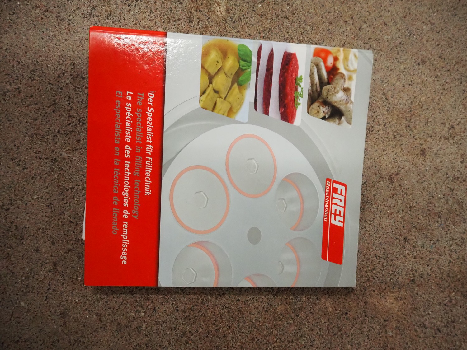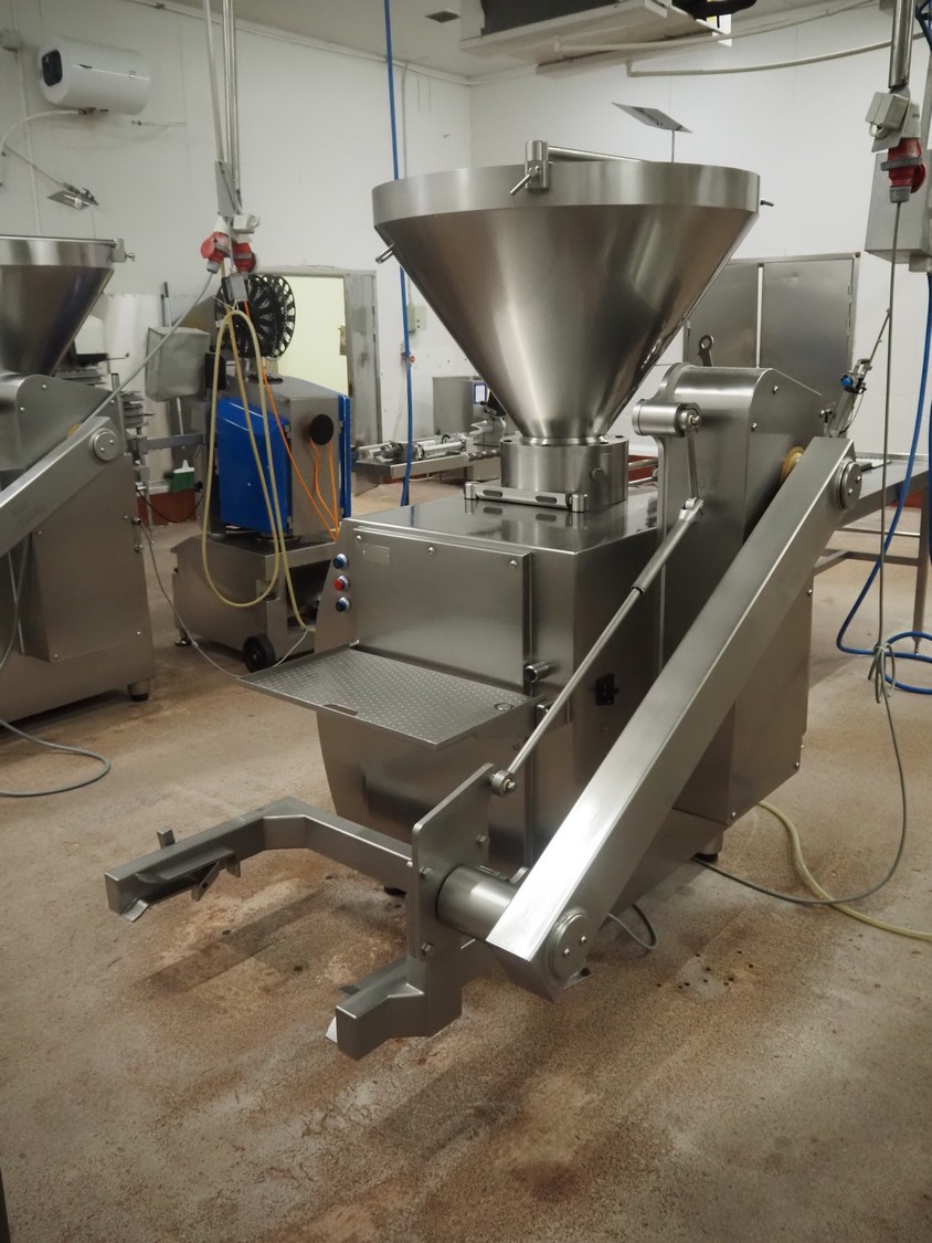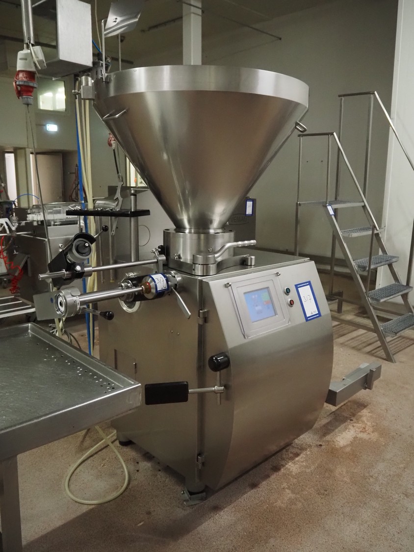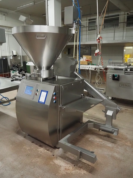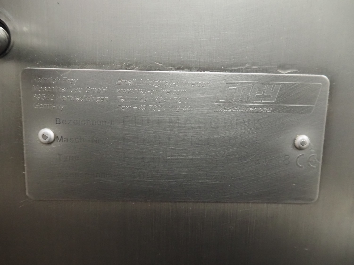 Frey Maschinenbau vacuum filling machine with lifter for meat bins, type: F-LINE F163, serial number: F163T21302078, year of construction: 2018, 400 V, 50/60 Hz, filling, portioning and linking, dimensions: 1800 mm x 1300 mm x 2250 mm. Including Frey linking gearbox with case spooling device, type: ADG04/1 / DA 2013, number: 1855 X / DA 201310816, dimensions: 570 mm x 390 mm x 340 mm and plastic crate with parts.