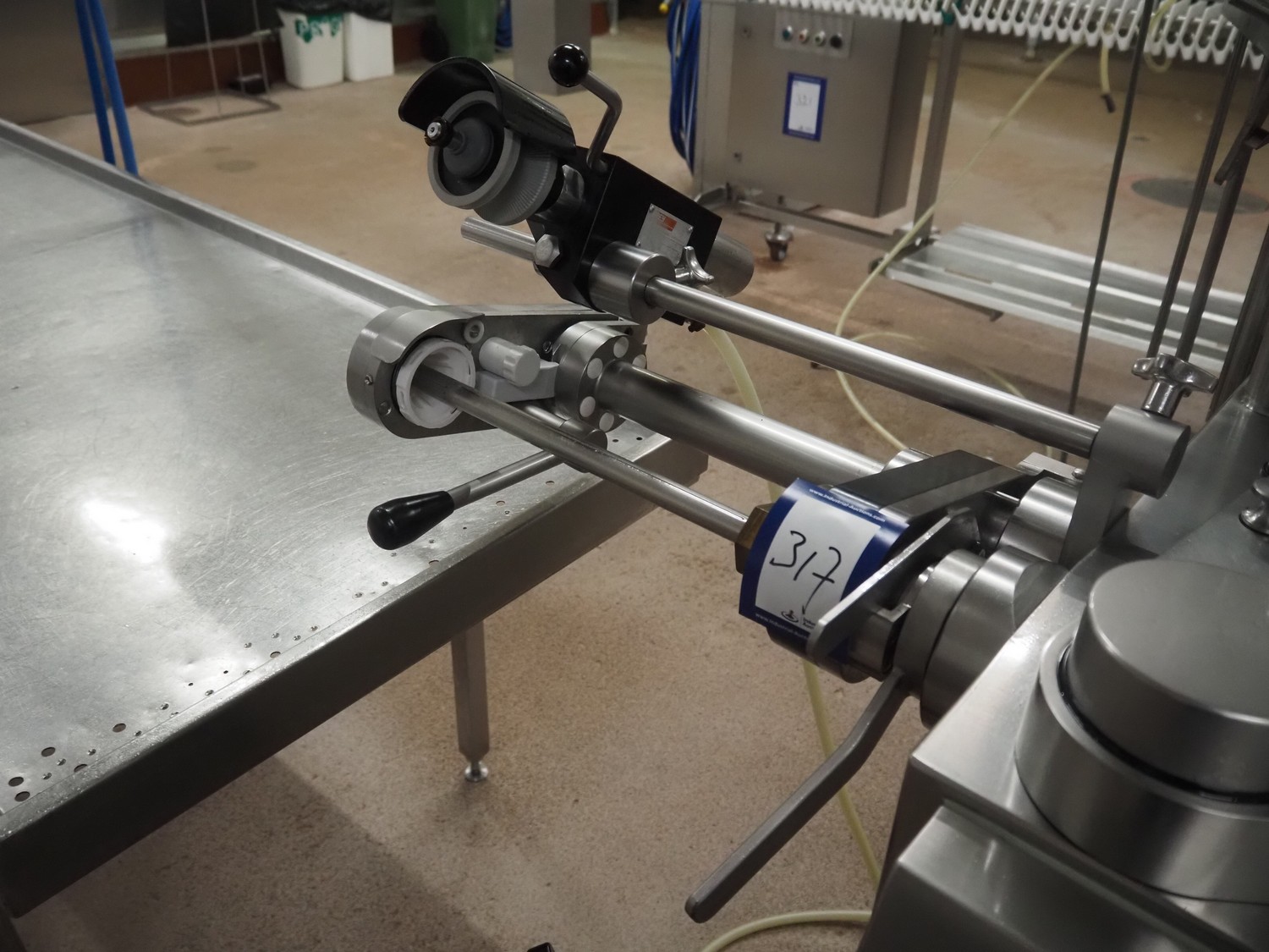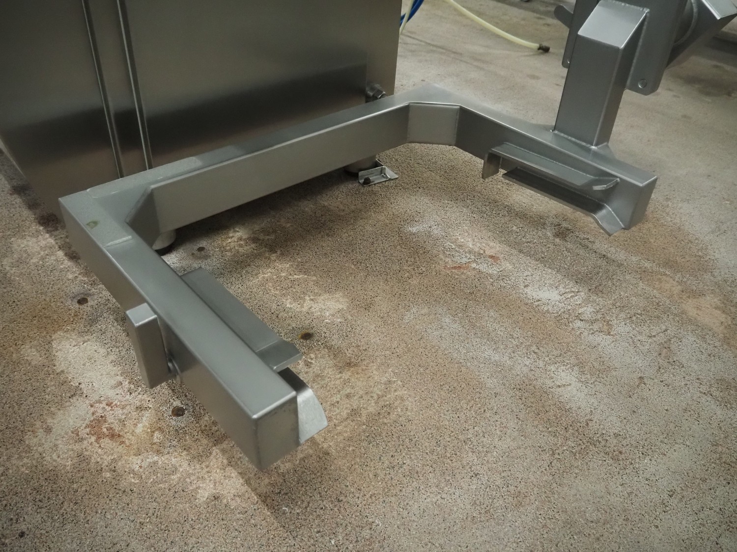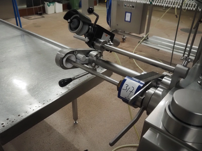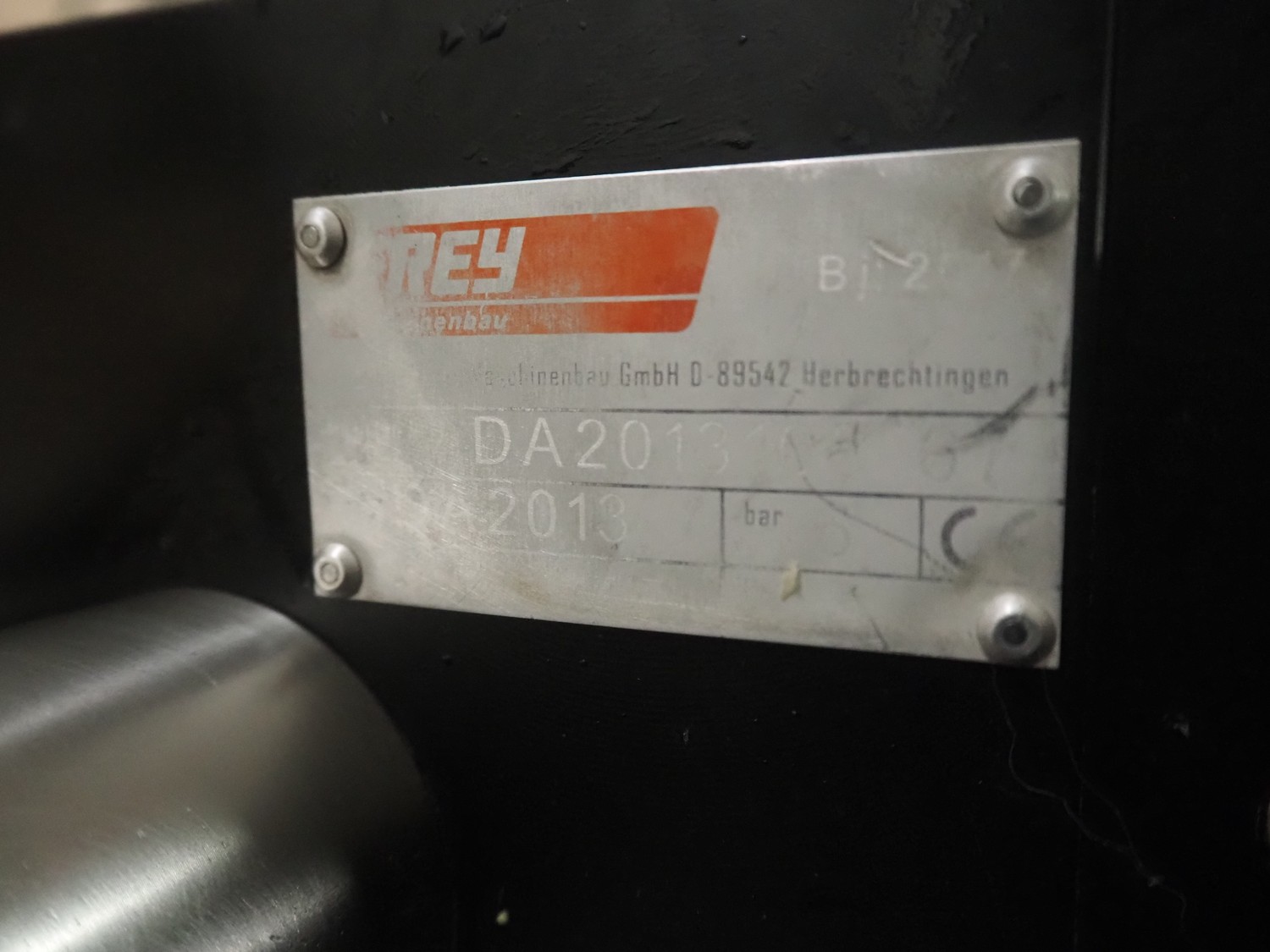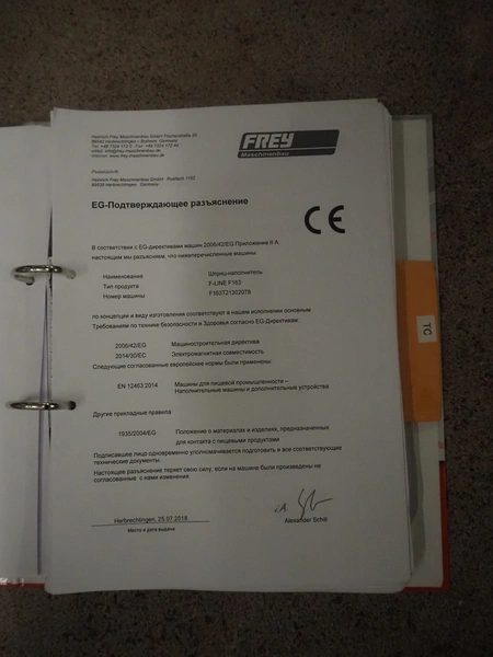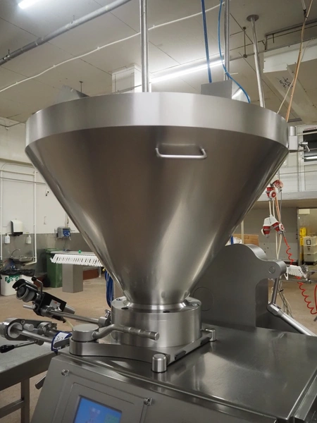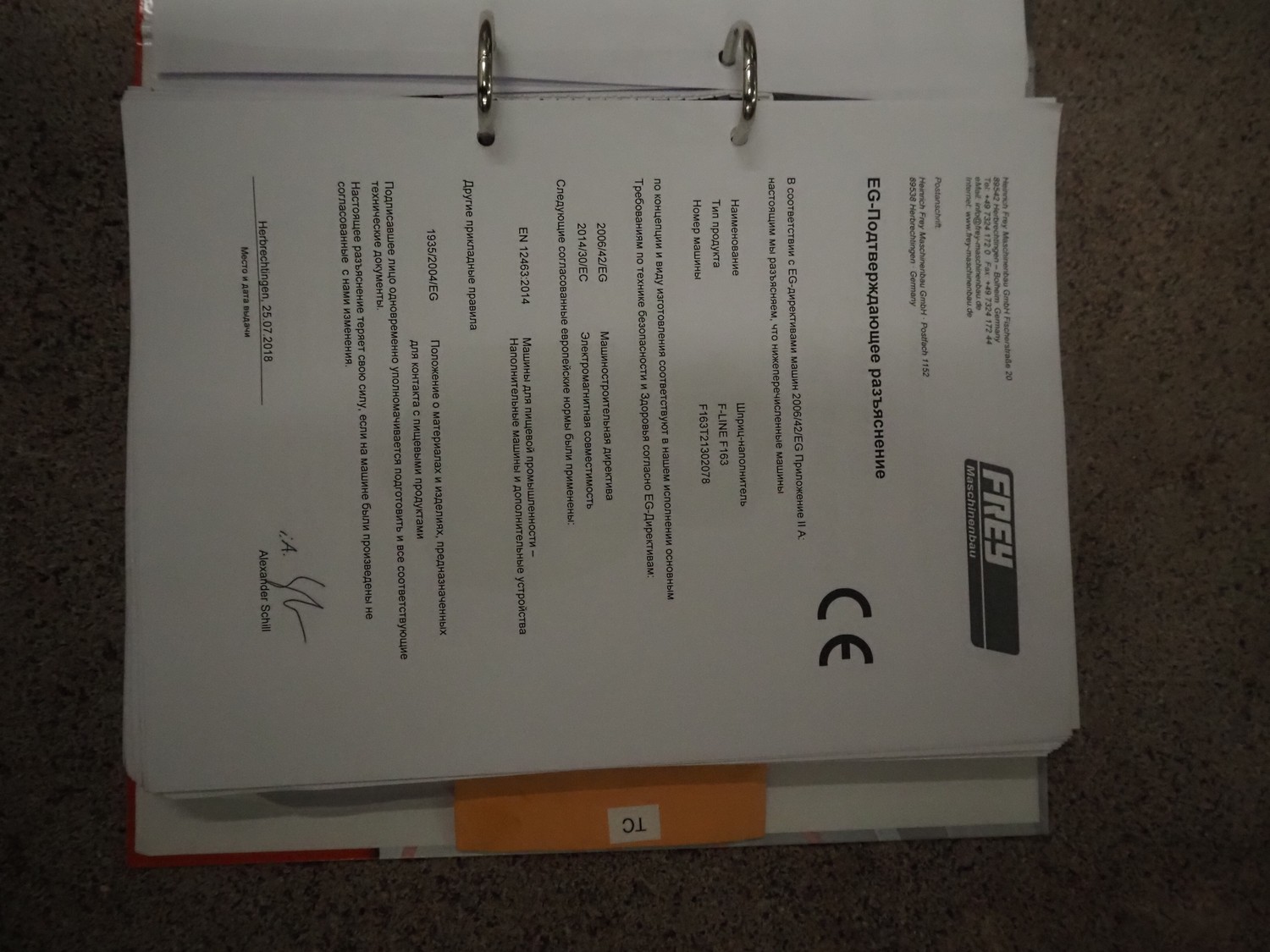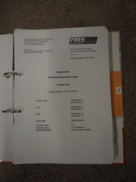 Frey Maschinenbau vacuum filling machine with lifter for meat bins, type: F-LINE F163, serial number: F163T21302078, year of construction: 2018, 400 V, 50/60 Hz, filling, portioning and linking, dimensions: 1800 mm x 1300 mm x 2250 mm. Including Frey linking gearbox with case spooling device, type: ADG04/1 / DA 2013, number: 1855 X / DA 201310816, dimensions: 570 mm x 390 mm x 340 mm and plastic crate with parts.