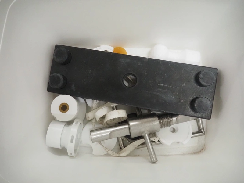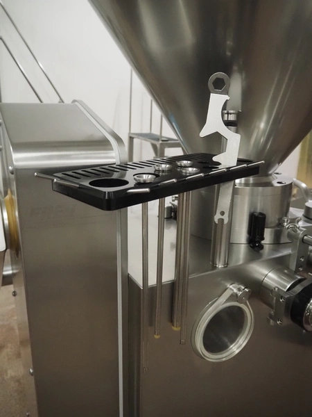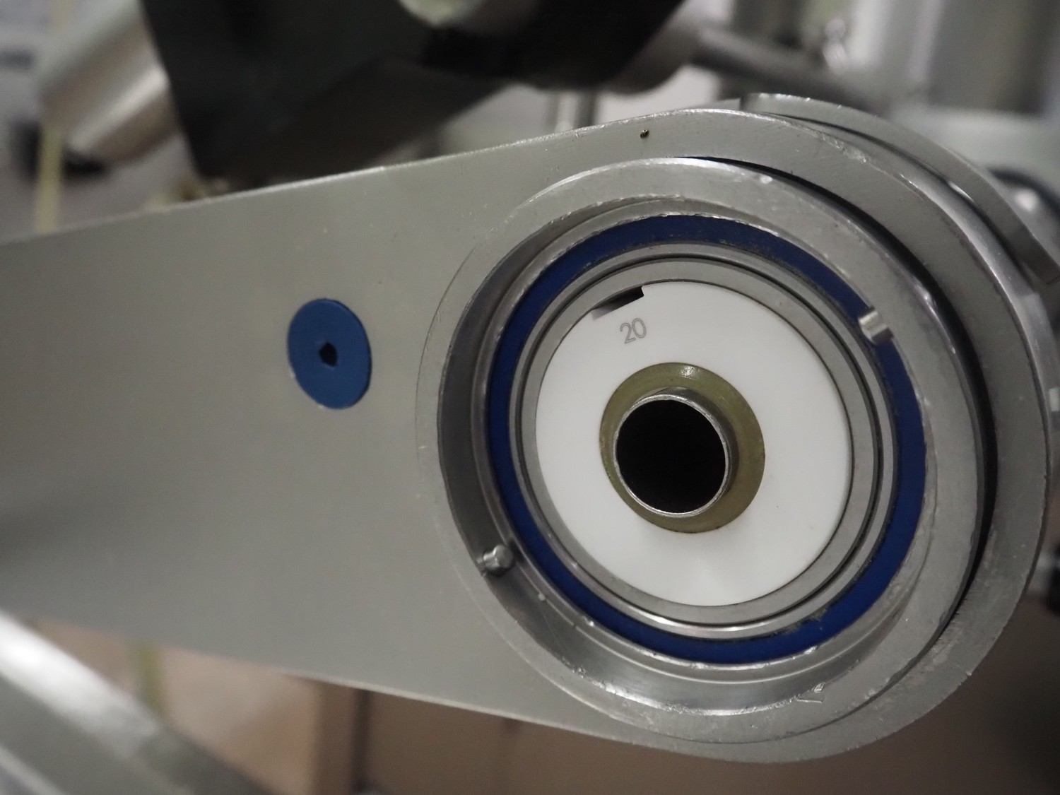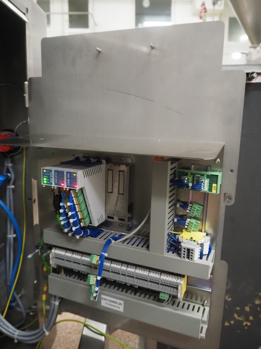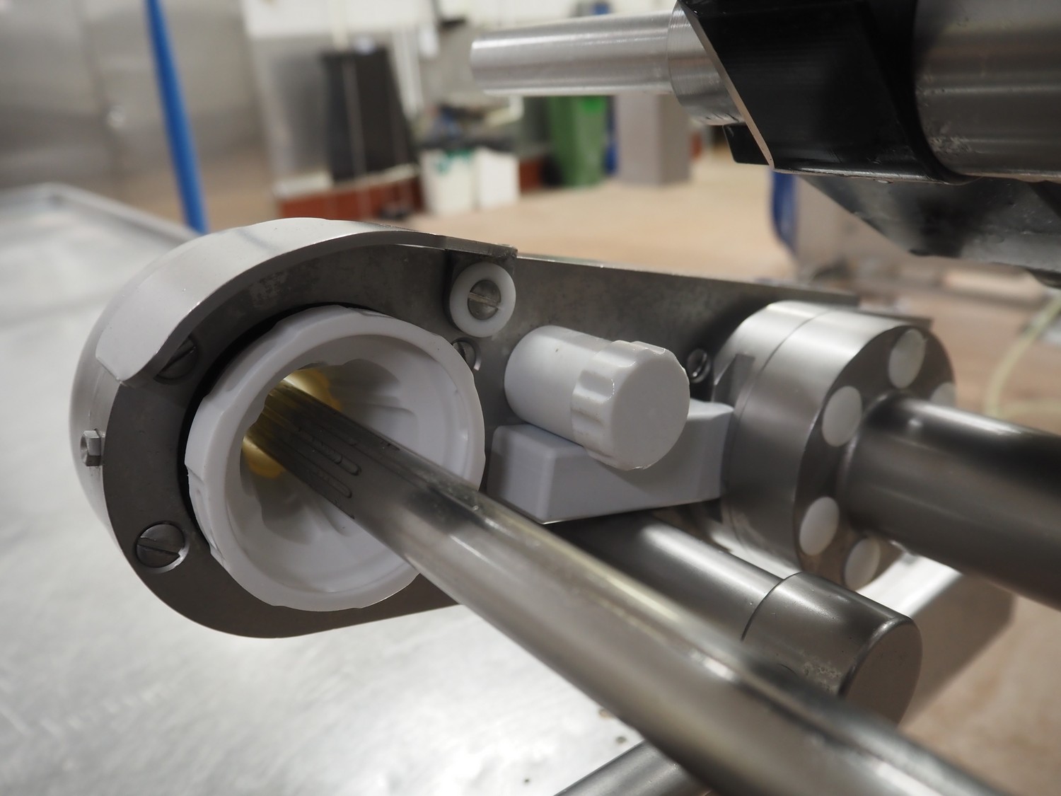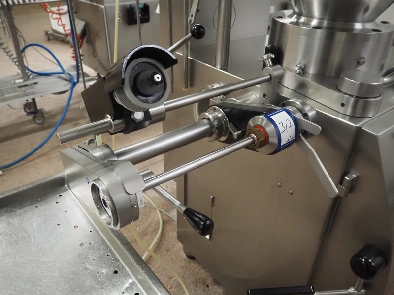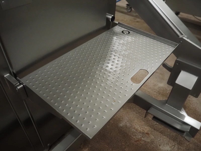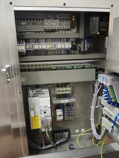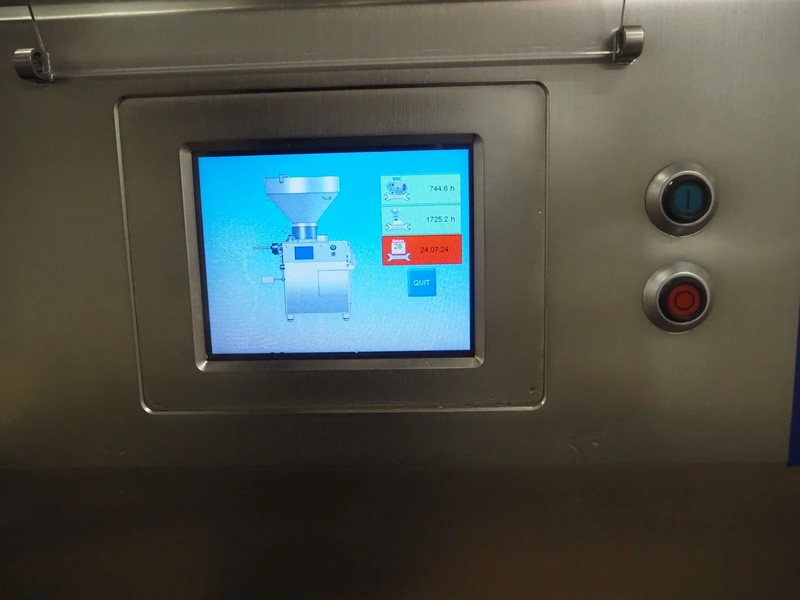 Frey Maschinenbau vacuum filling machine with lifter for meat bins, type: F-LINE F163, serial number: F163T21302078, year of construction: 2018, 400 V, 50/60 Hz, filling, portioning and linking, dimensions: 1800 mm x 1300 mm x 2250 mm. Including Frey linking gearbox with case spooling device, type: ADG04/1 / DA 2013, number: 1855 X / DA 201310816, dimensions: 570 mm x 390 mm x 340 mm and plastic crate with parts.